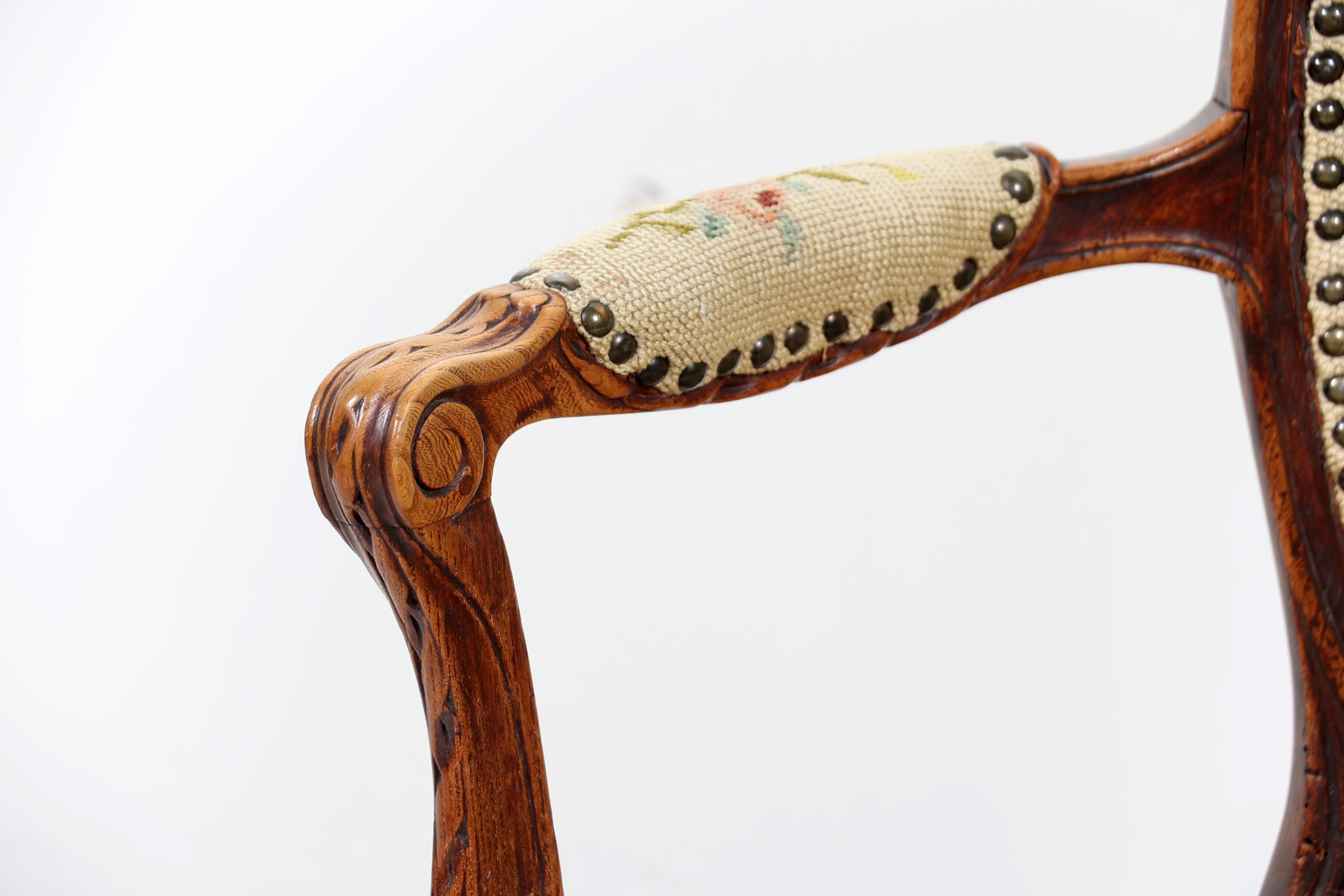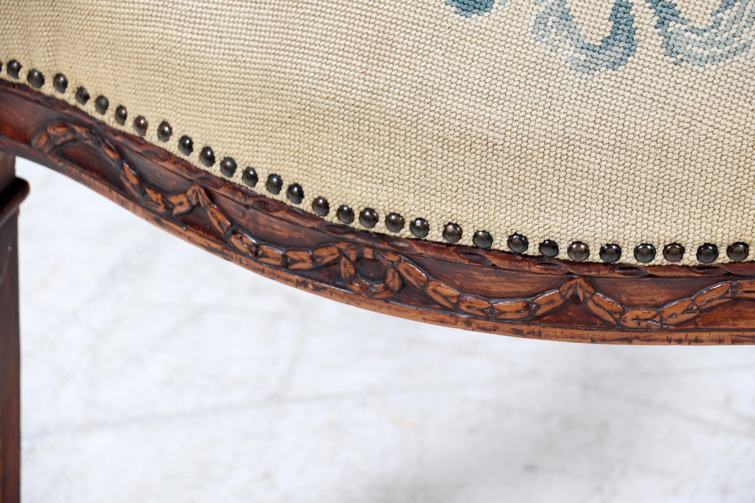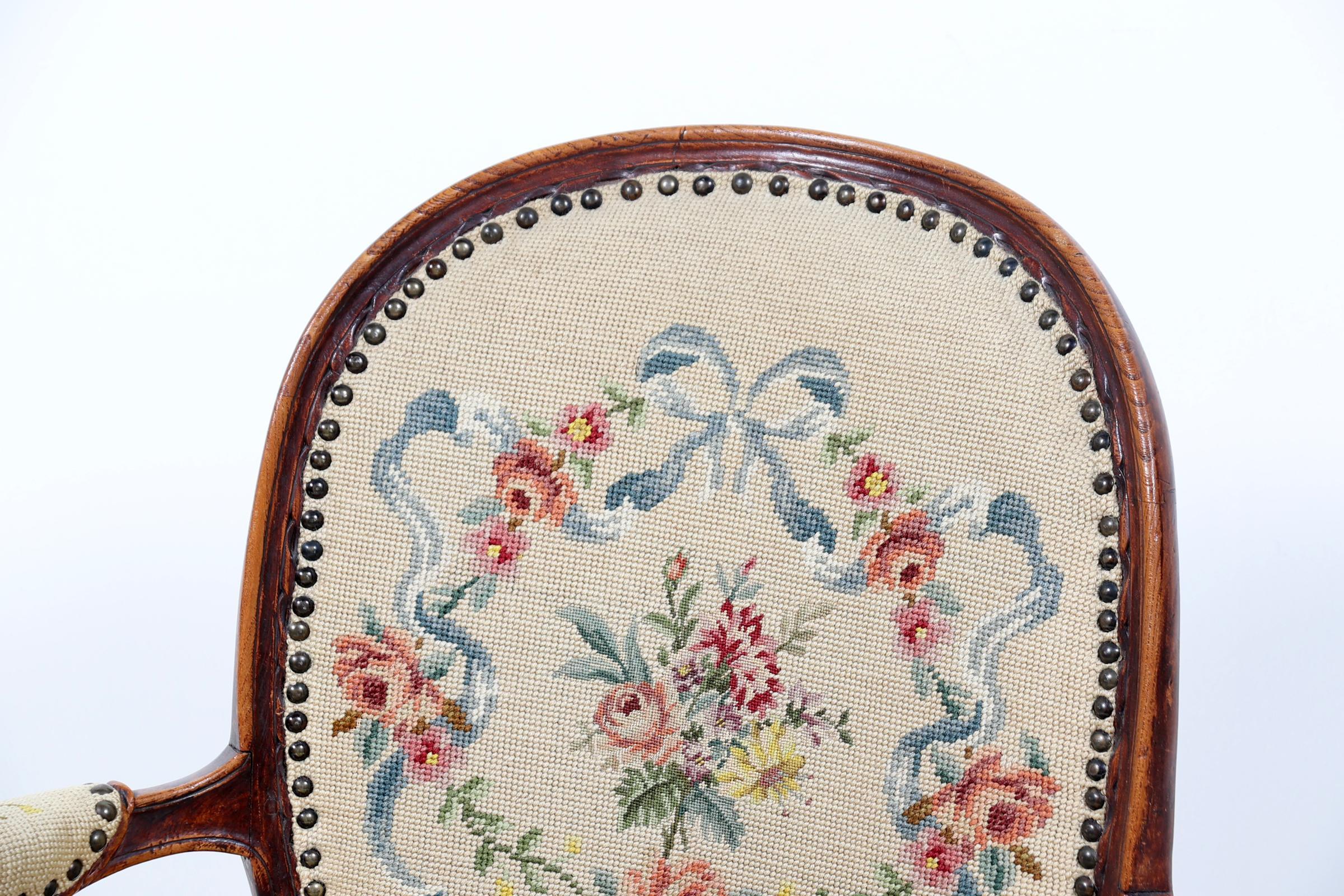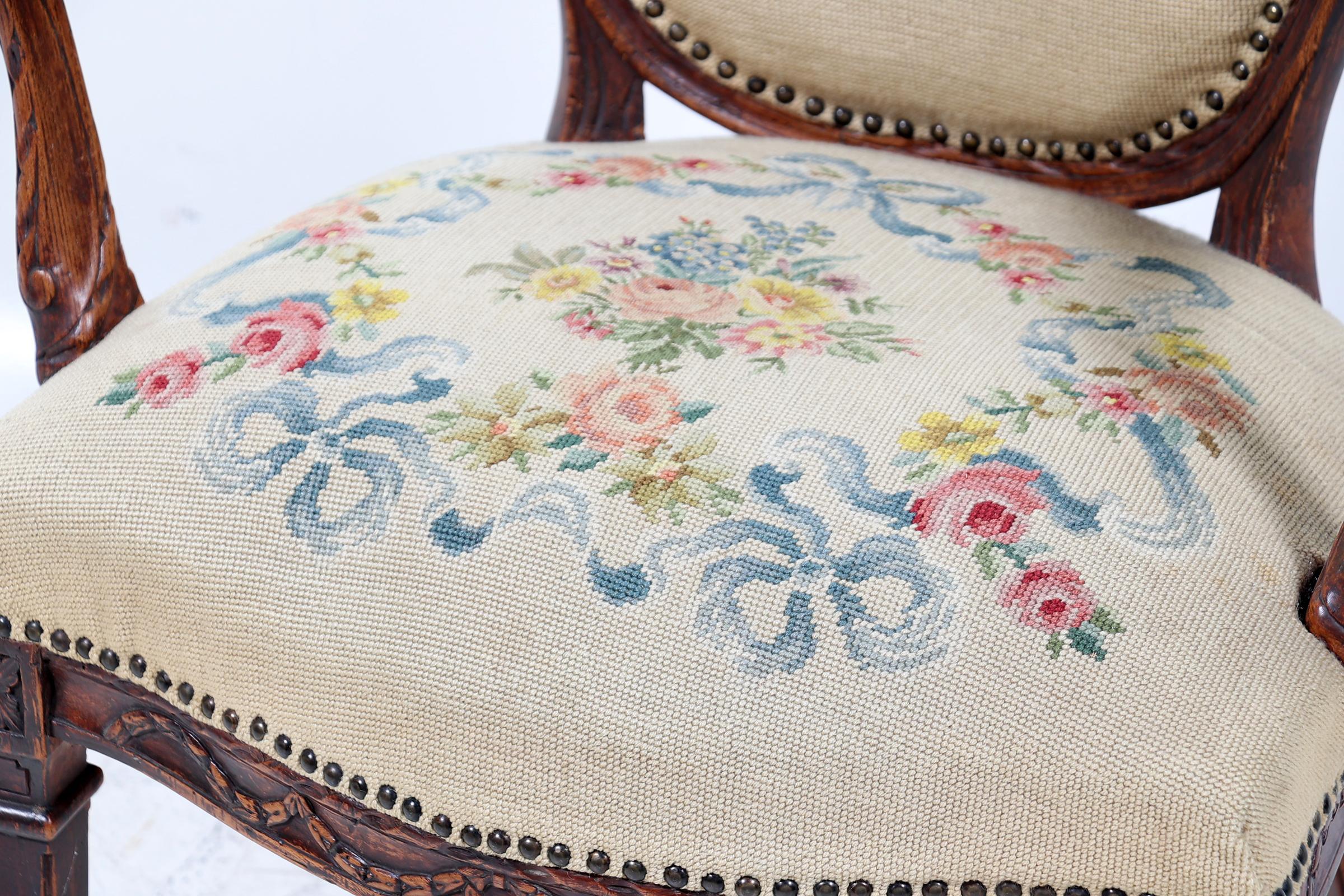 Antieke iepenhouten armfauteuil met geborduurde stoffering, Louis Seize stijl