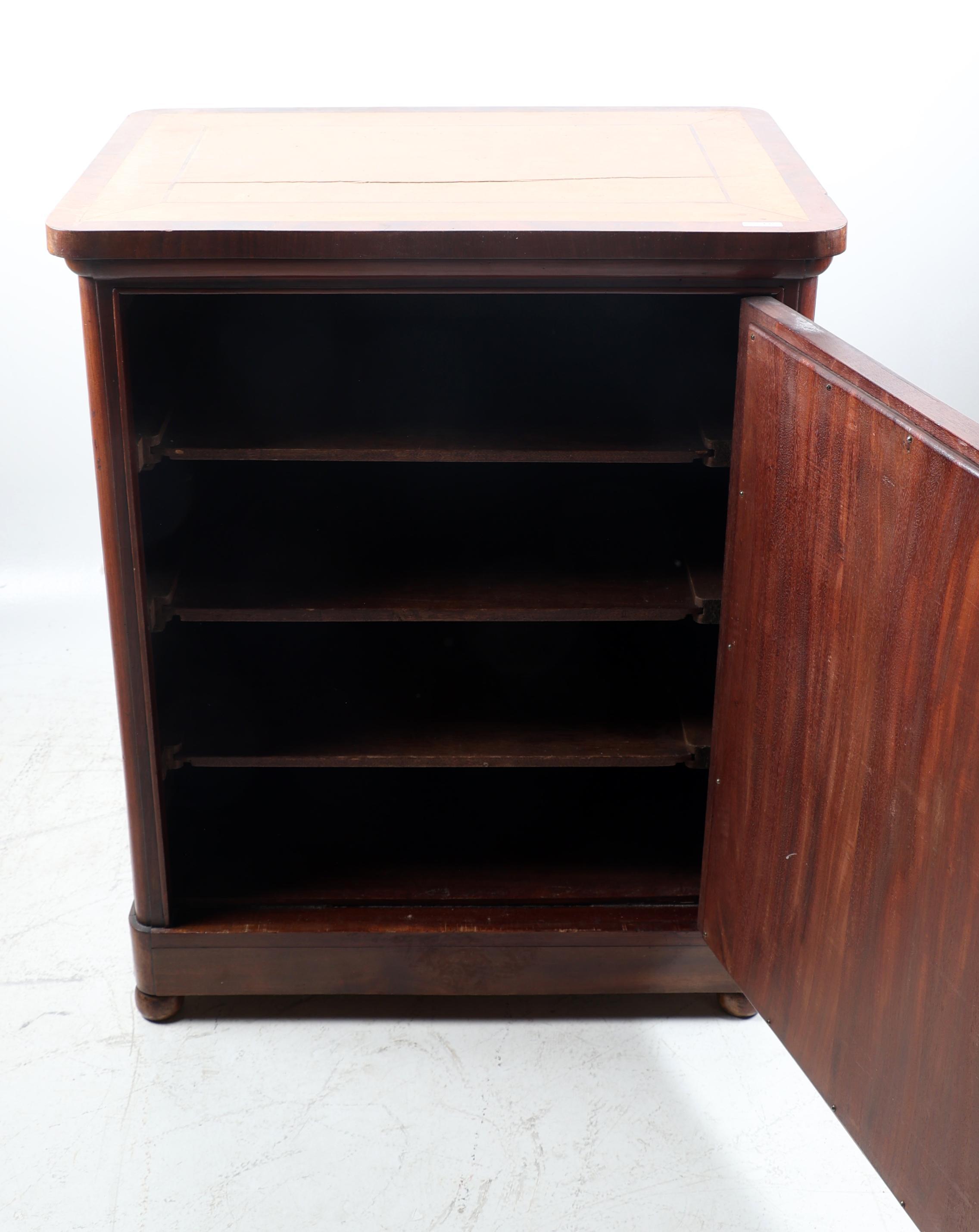 Antieke wortelnoten/mahoniehouten 1-deurs kast met geborduurde stoffering achter glas, h.83 x b.67 x d.48 cm.