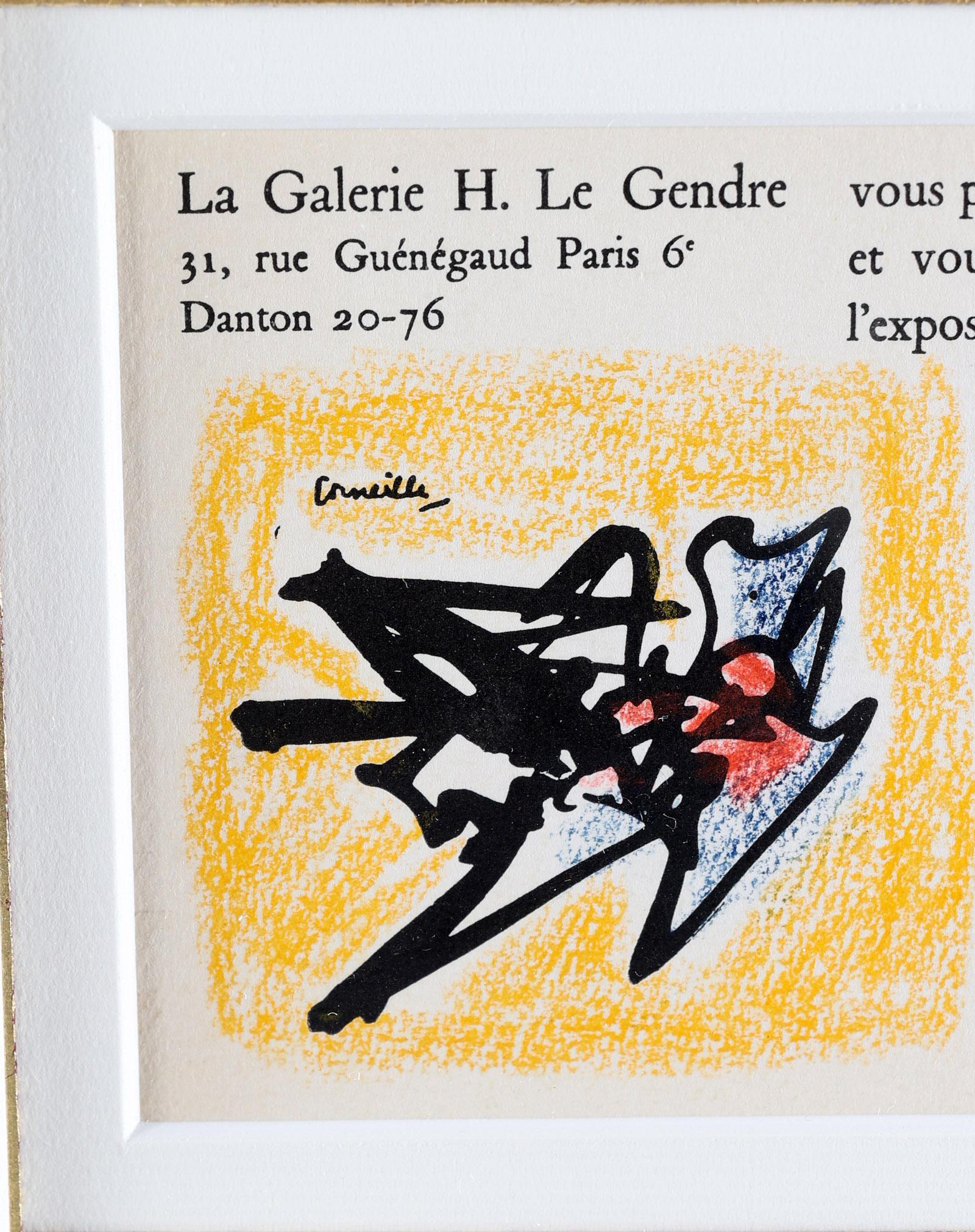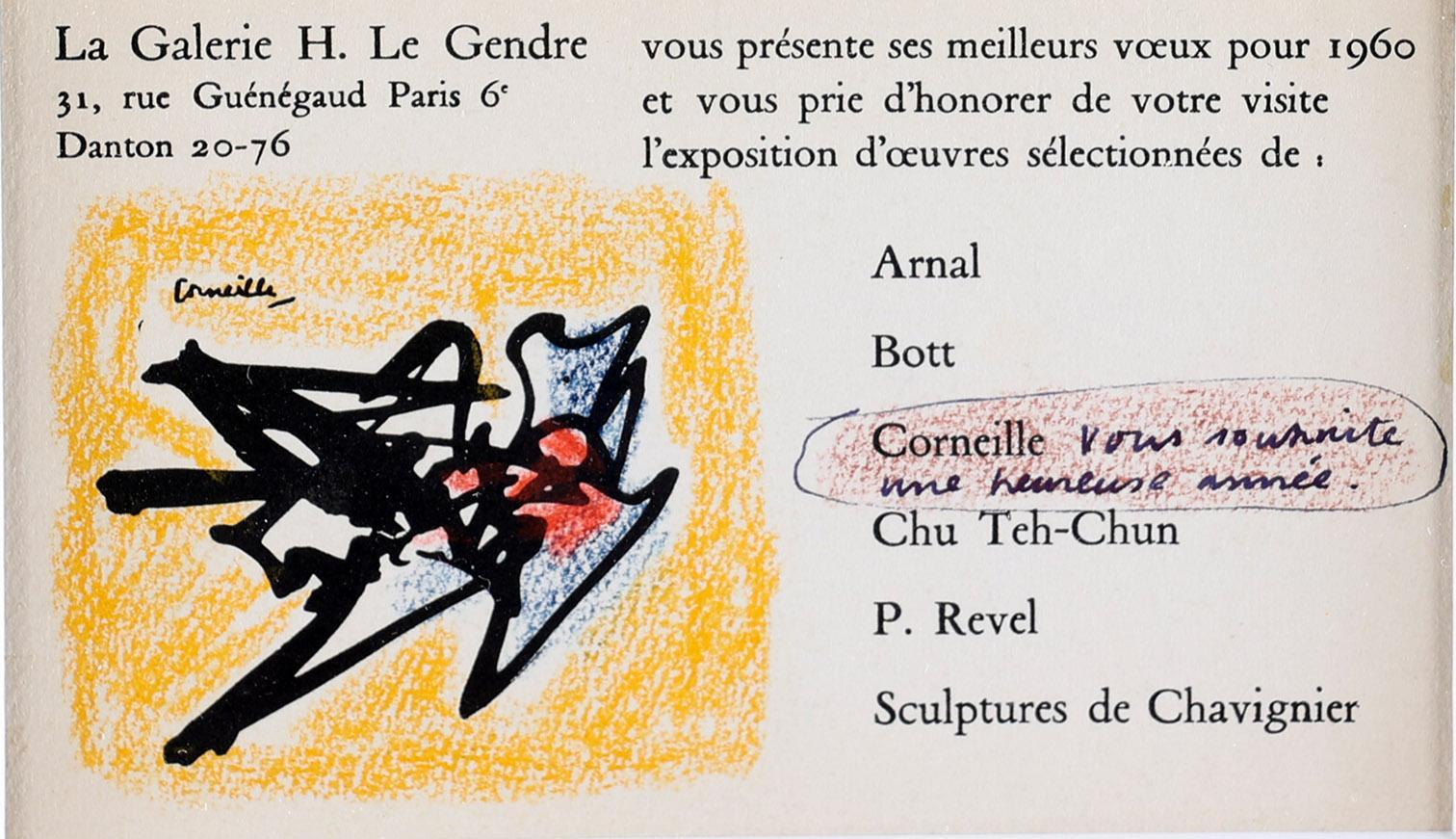 La Galerie H. Le Grande ingekleurde invitatie door Corneille met handgeschreven tekst, 13 x 18 cm., inclusief echtheidsverklaring Nico Koster