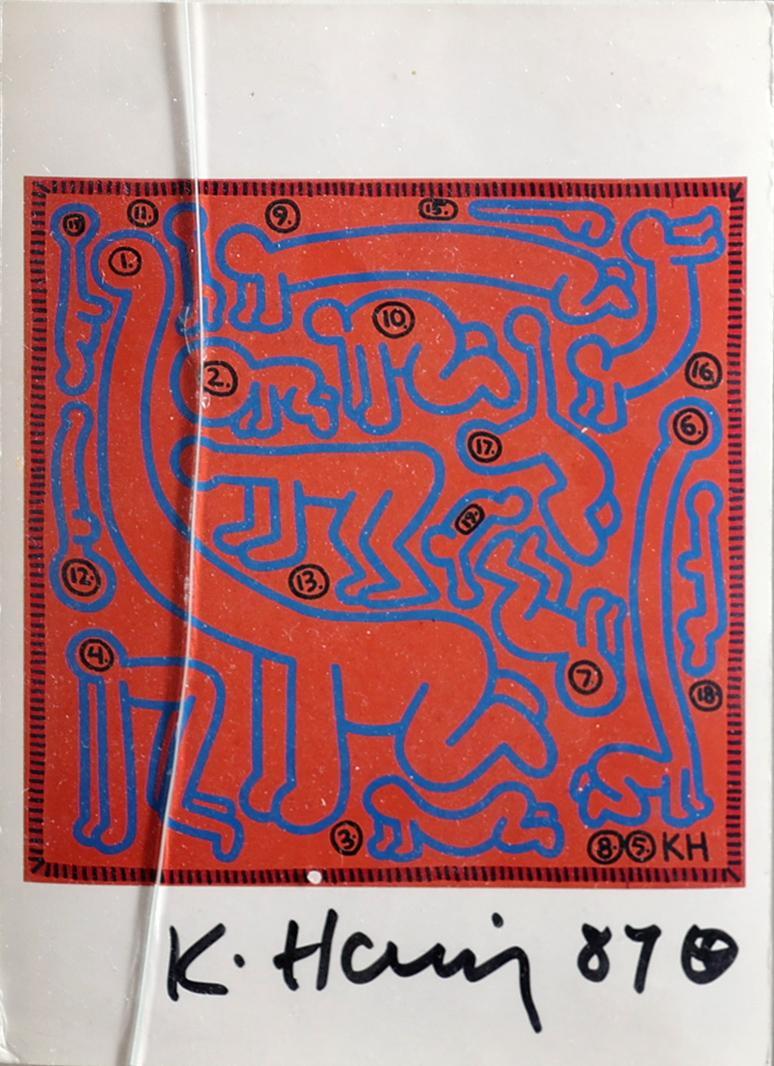 Handgesigneerde ansichtkaart van Keith Haring, 15 x 10,5 cm. (glas defect)