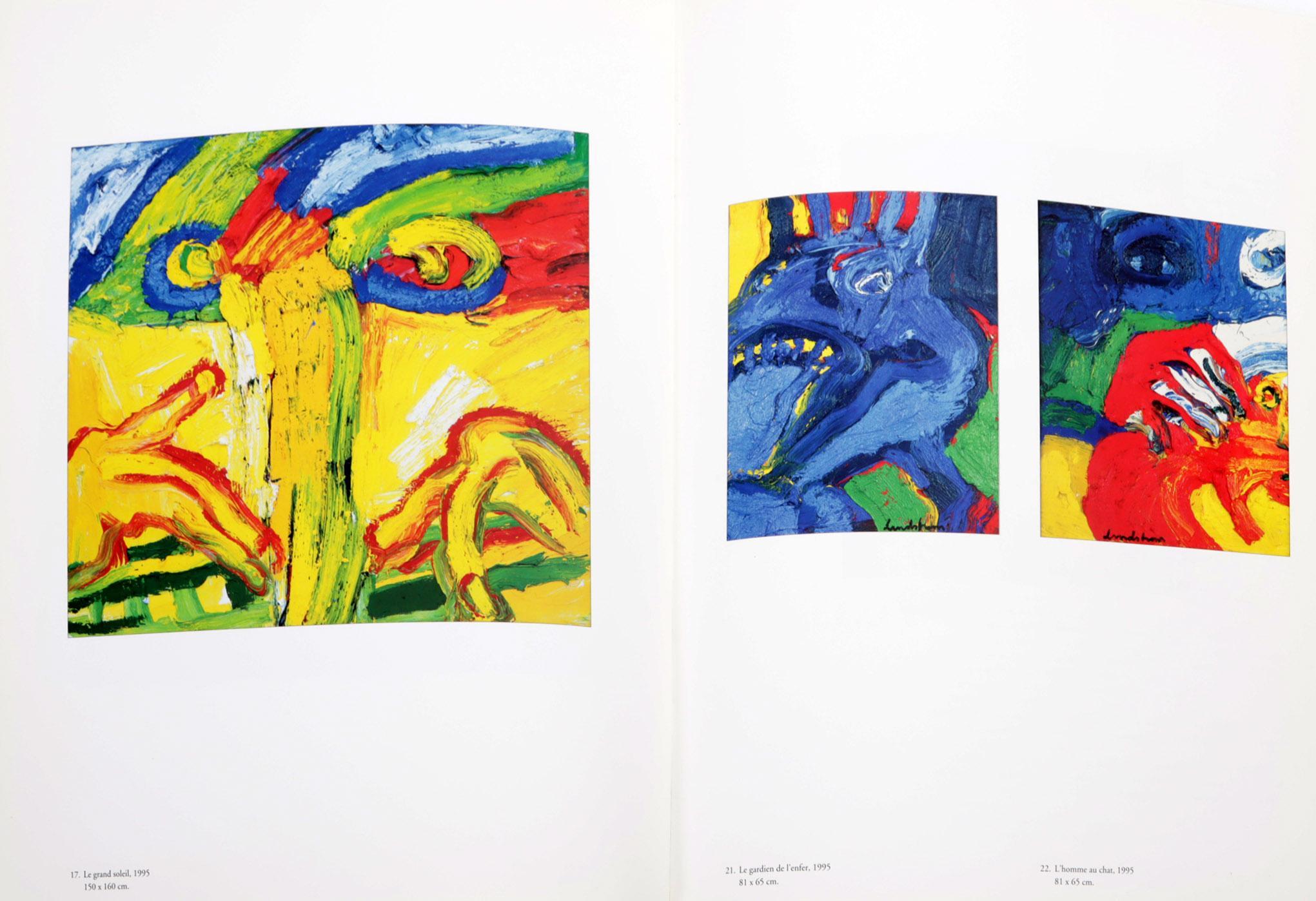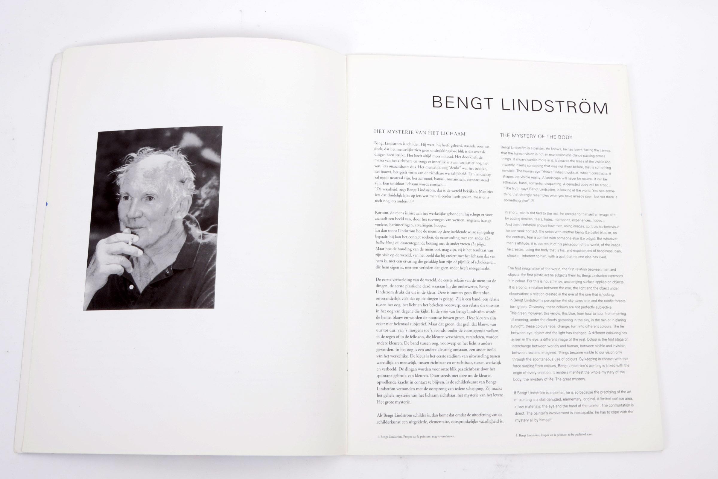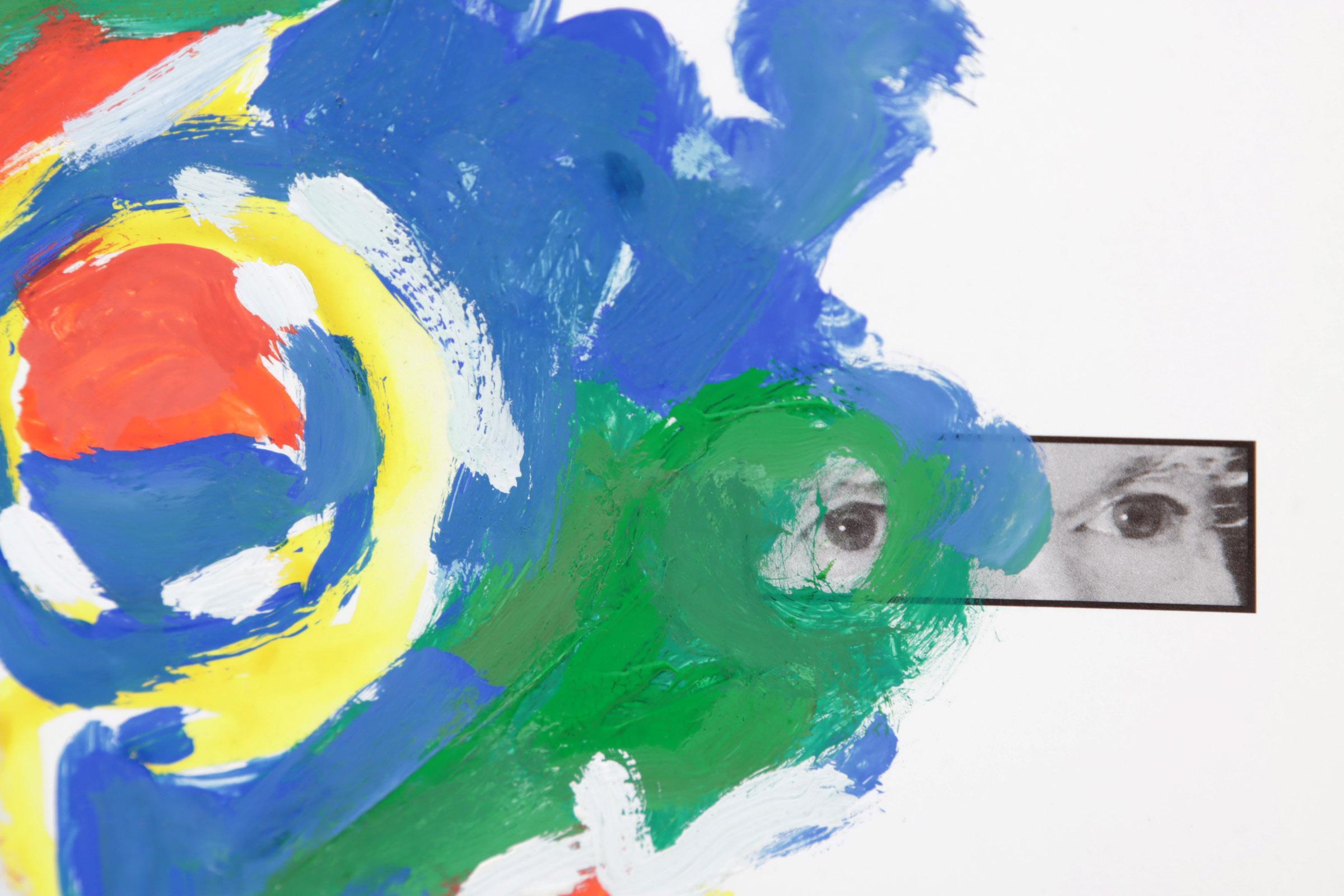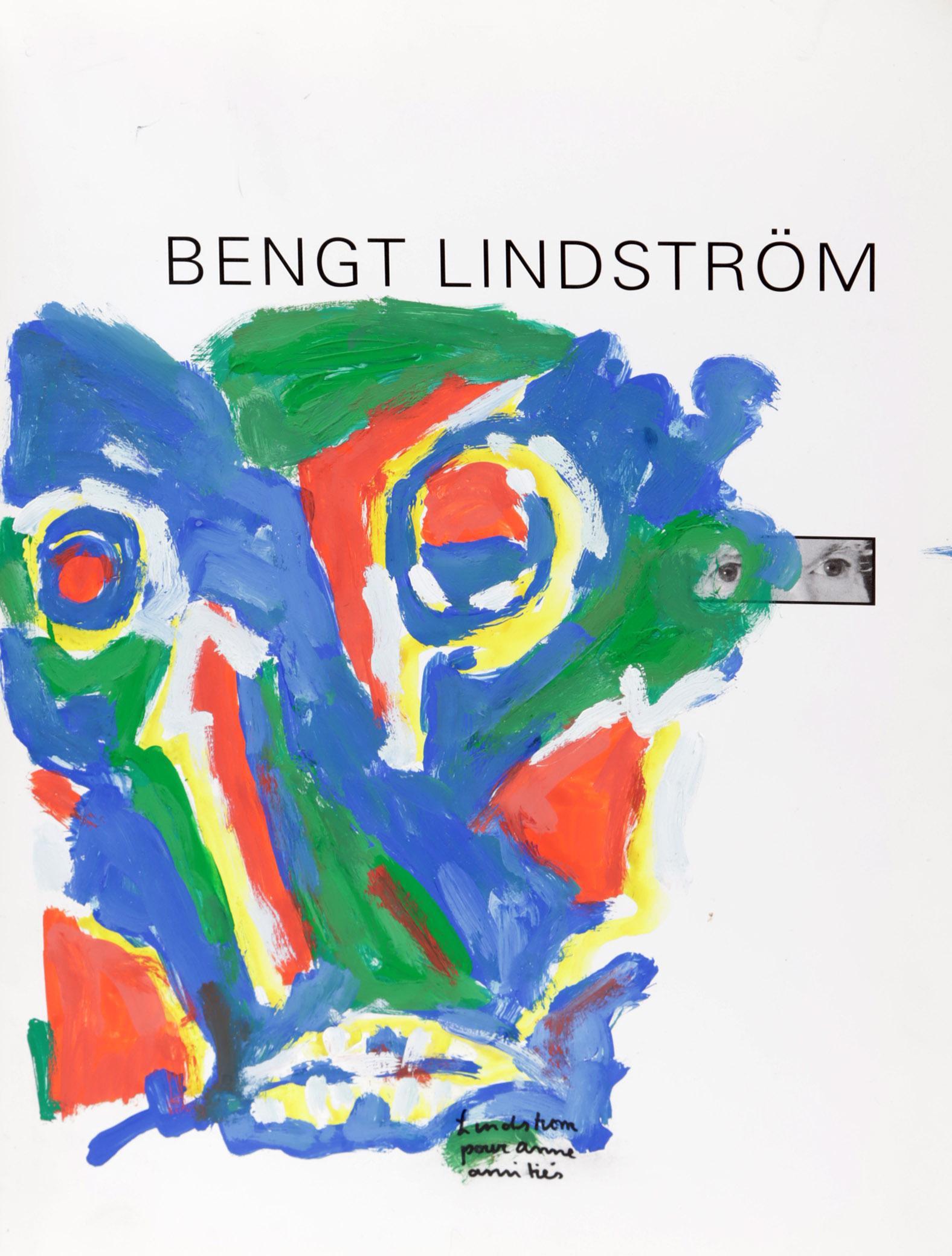 Bengt Lindström (1925-2008), Compositie met blauw gezicht, gouache op de eerste pagina van de tentoonstellingscatalogus: "Bengt Lindström, The Mystery of the Body, November 1996 - Januari 1997, Gallery Willy Schoots, Eindhoven), gesigneerd en met connotatie: "Pour Anne, amitiés"