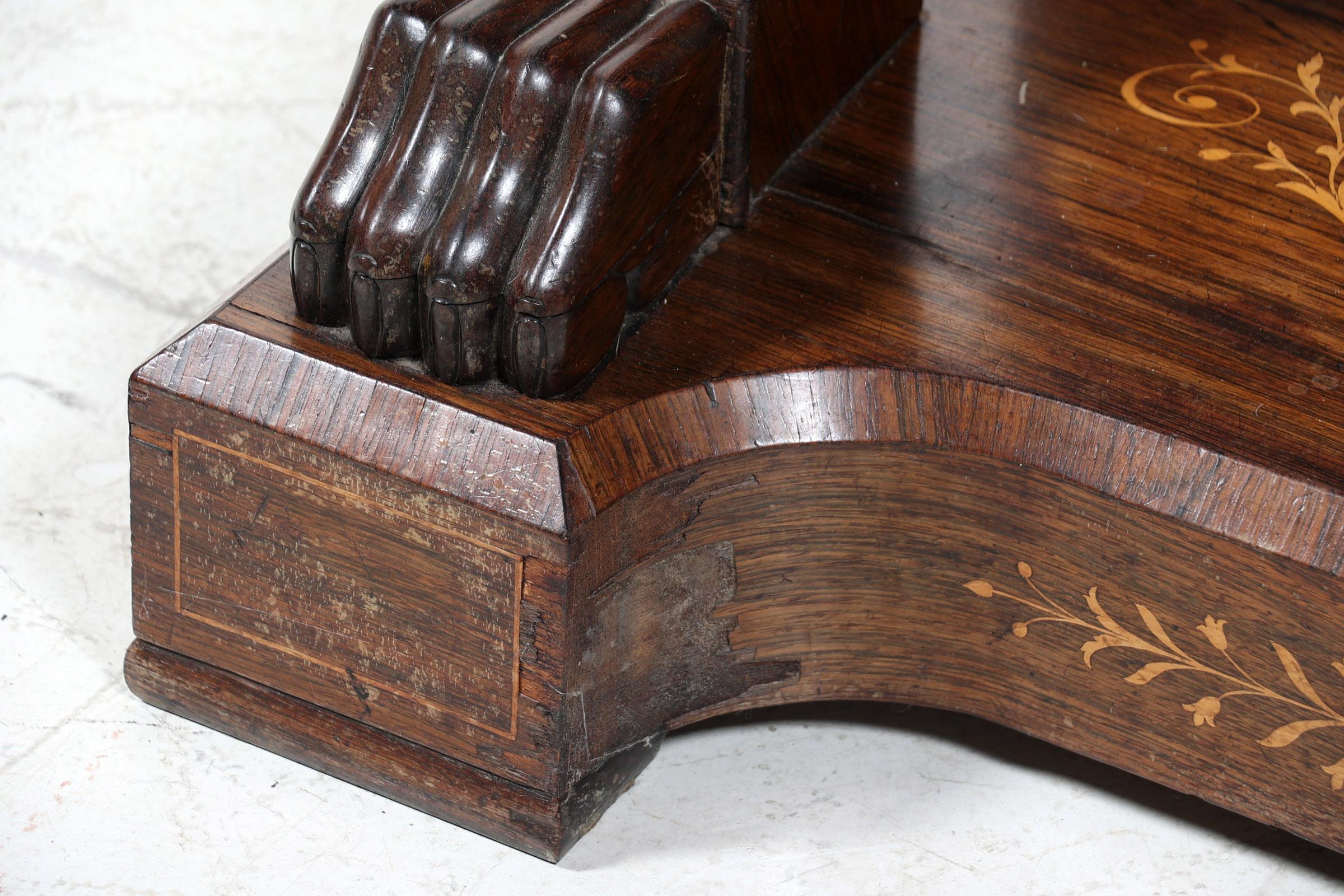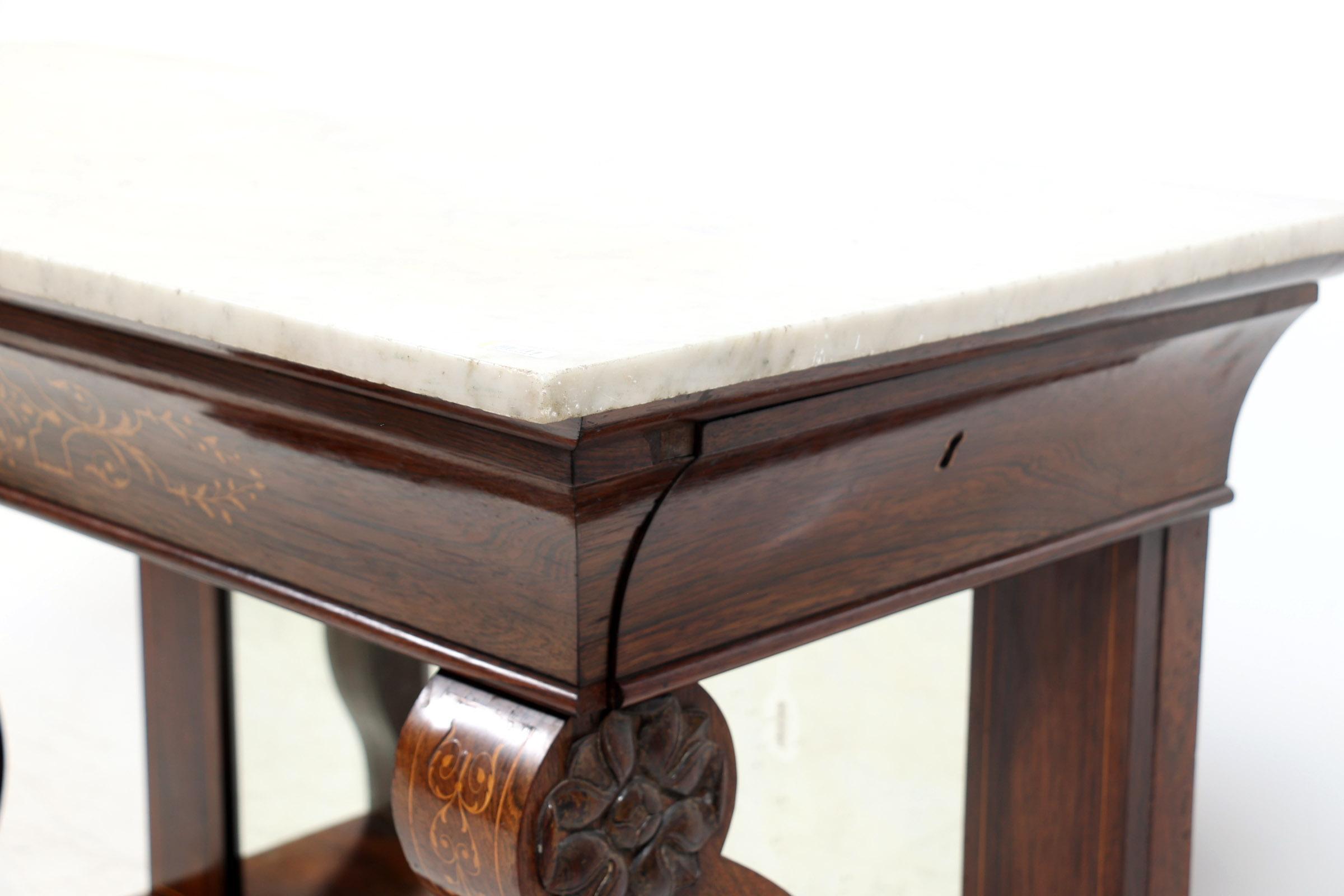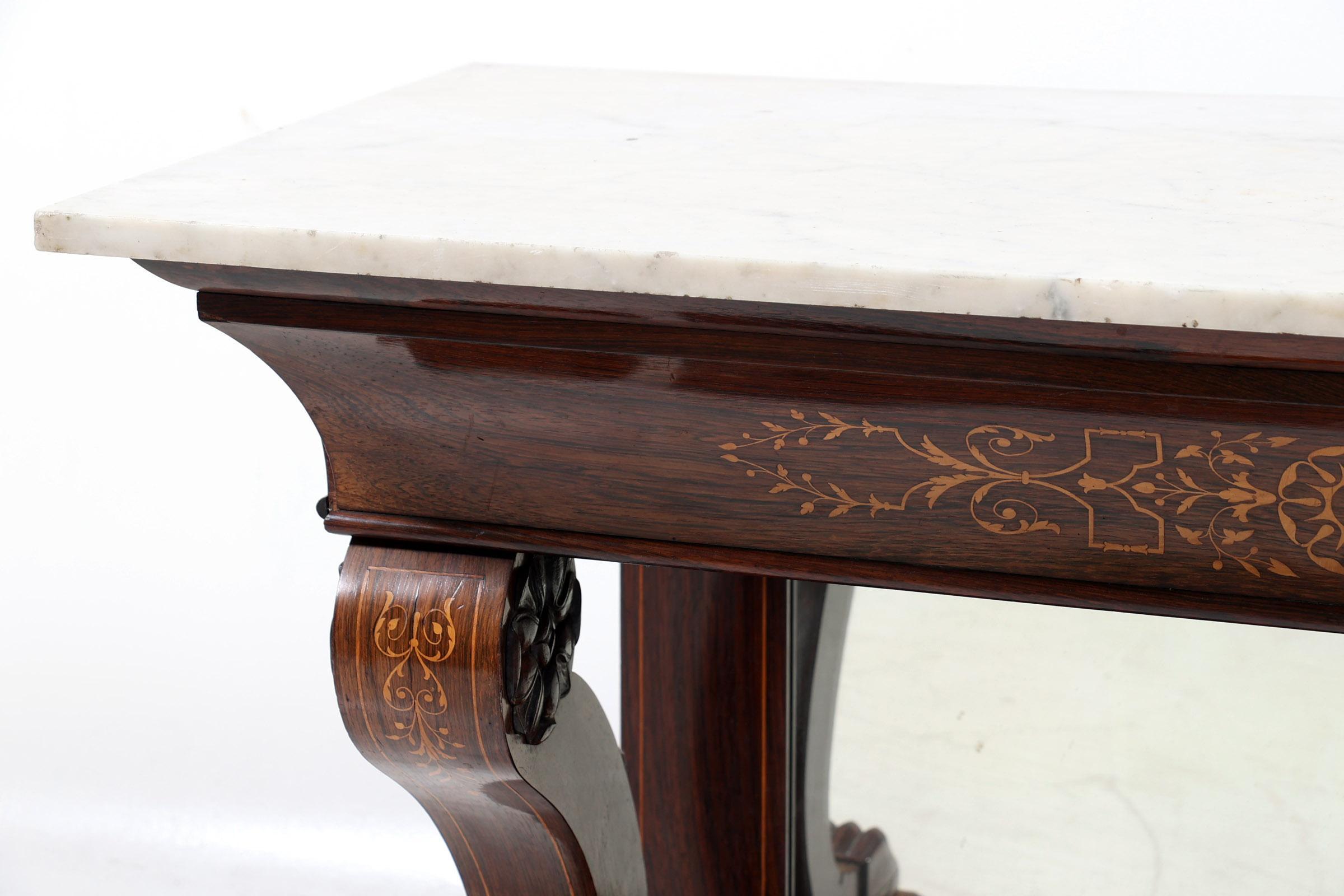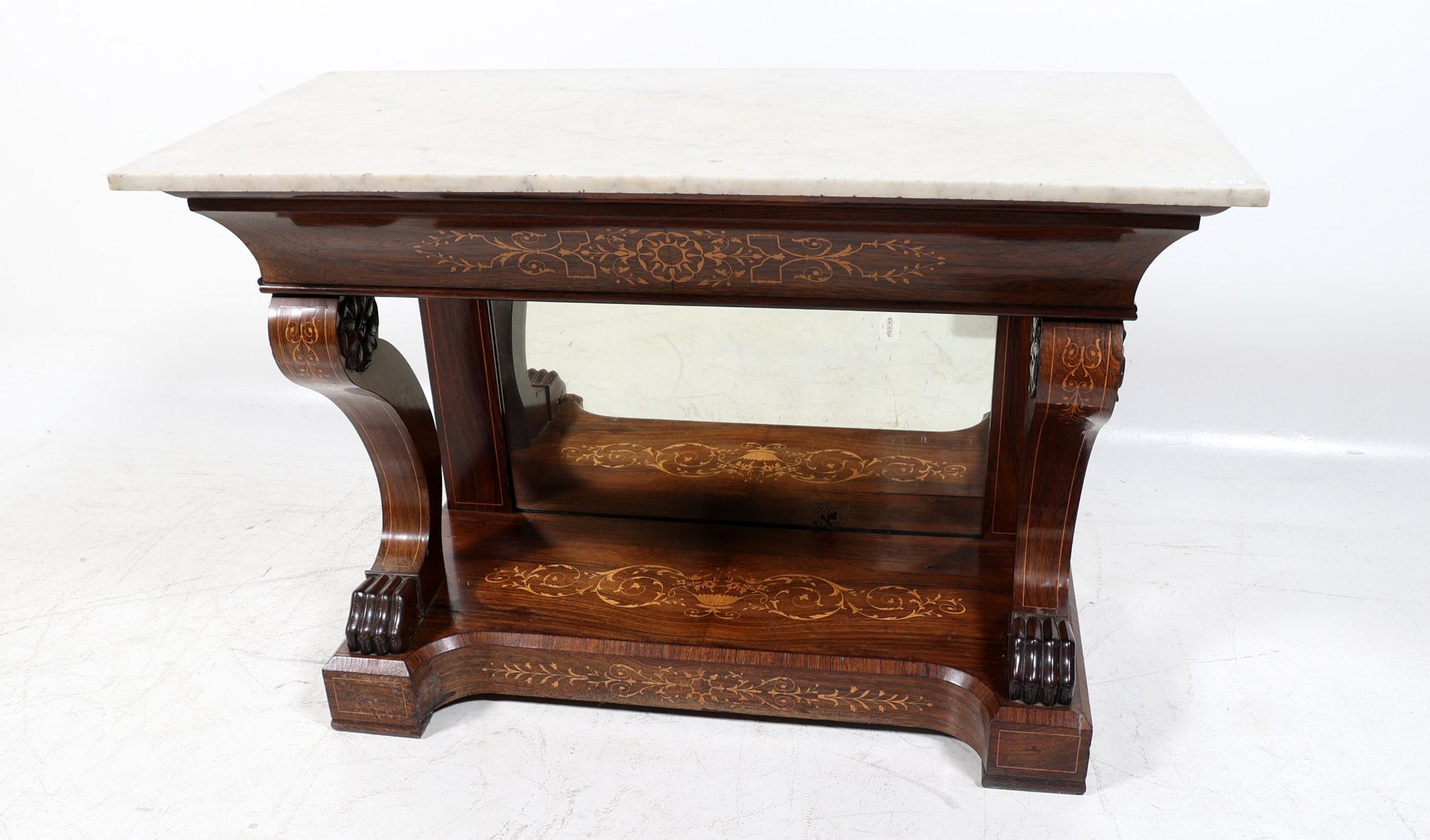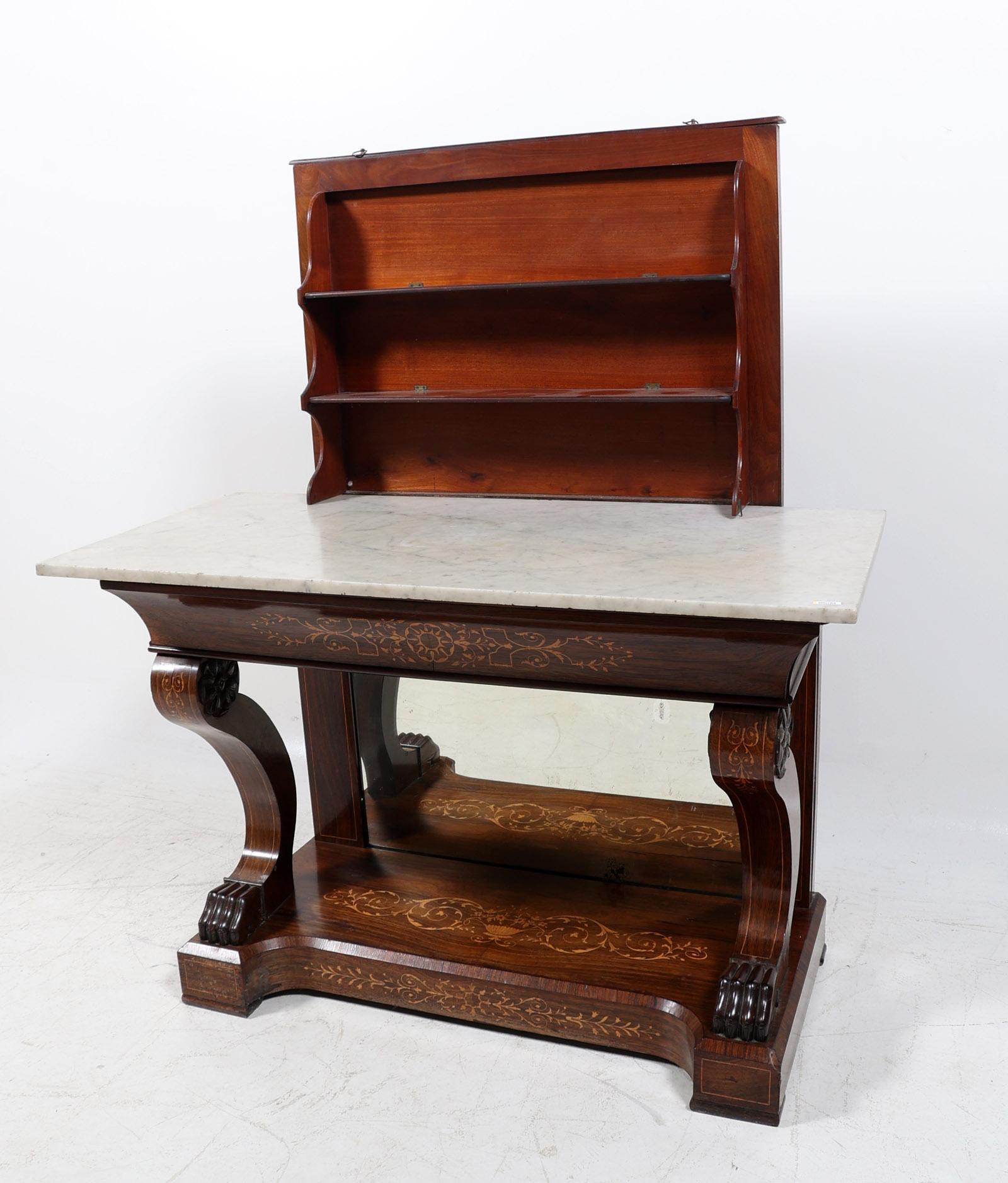Antieke ingelegde palissanderhouten empire trumeau met buffet opstand en wit marmeren blad, rustend op klauwpoten, h.82 x b.119 x d.60 cm.