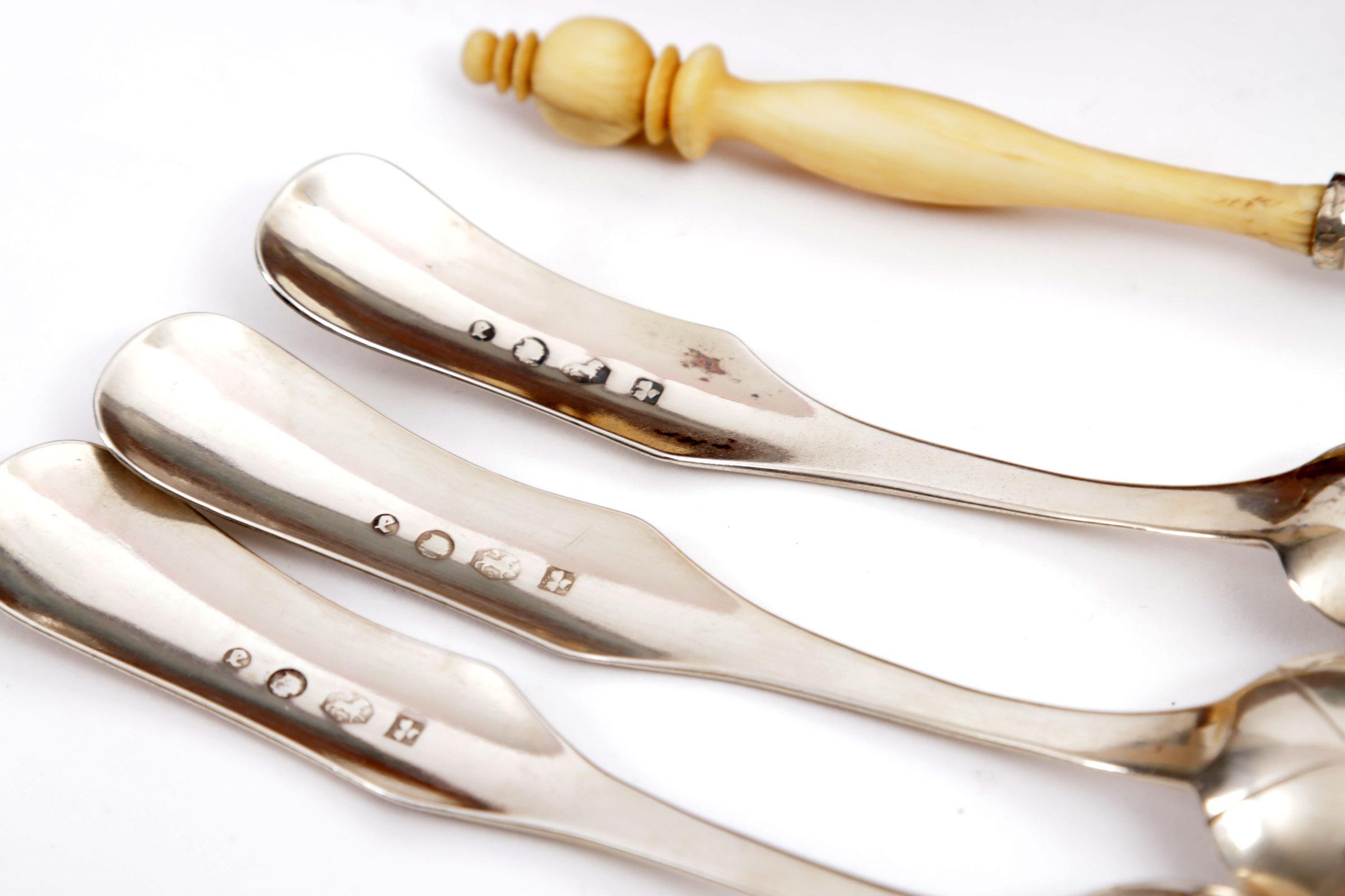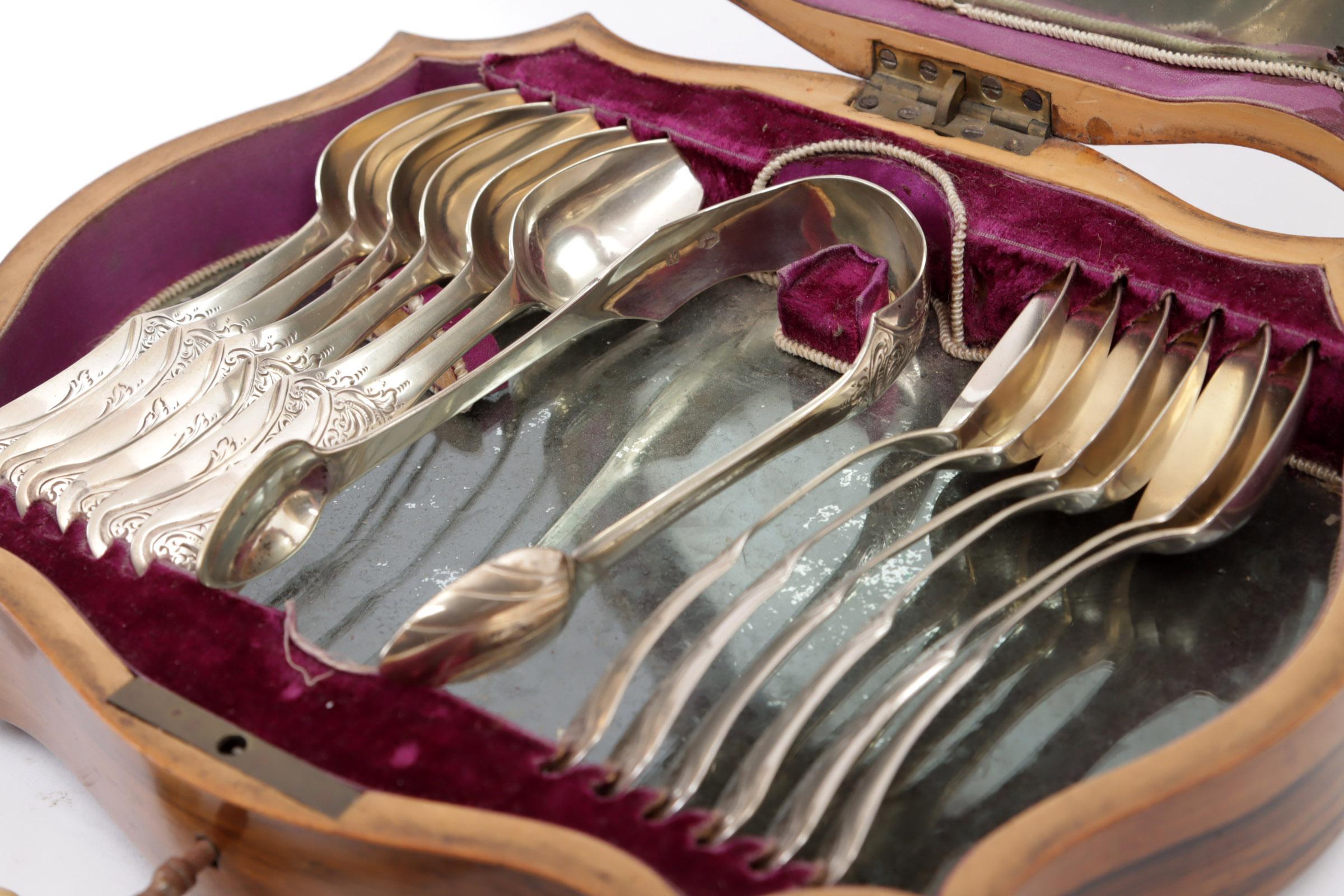 Antieke ingelegde kist met een 2e gehalte zilveren koffie/theebestek met inhoud van twaalf 2e gehalte zilveren koffielepels, klontjestang, suikerschep en een theezeef