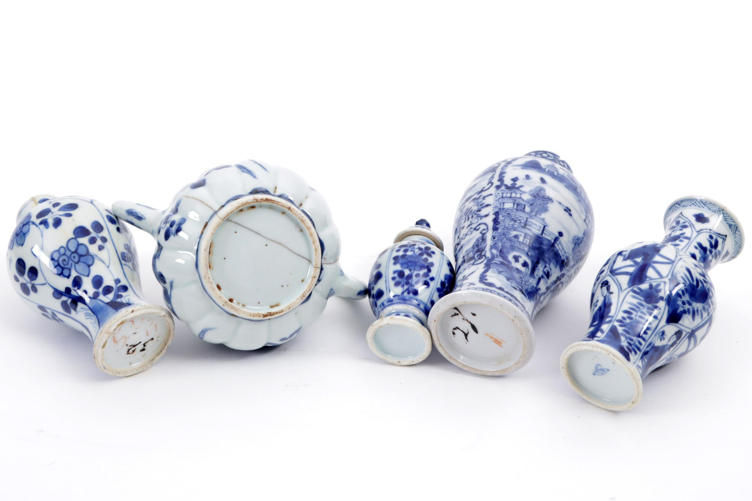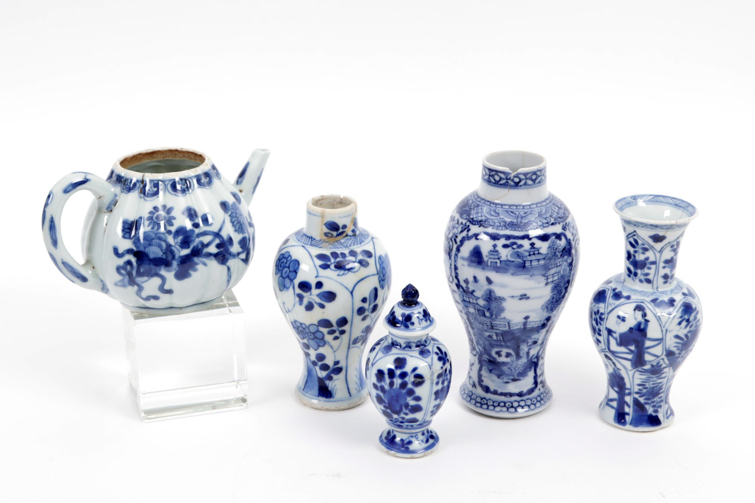 Koop divers blauw/wit gedecoreerd Chinees porselein bestaande uit 4 vaasjes en een trekpot