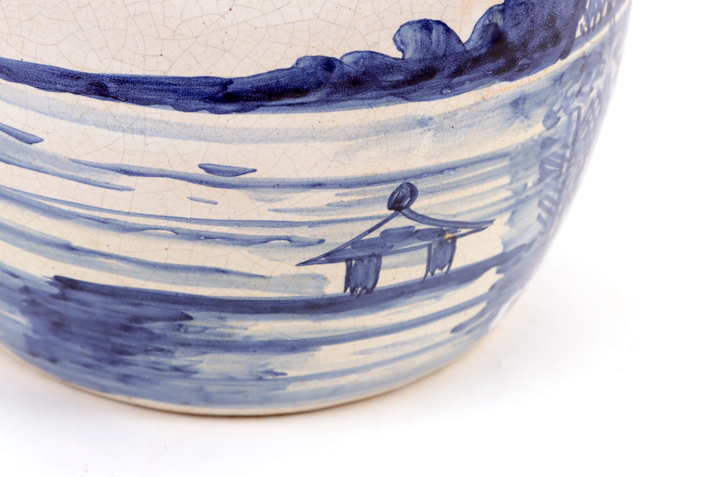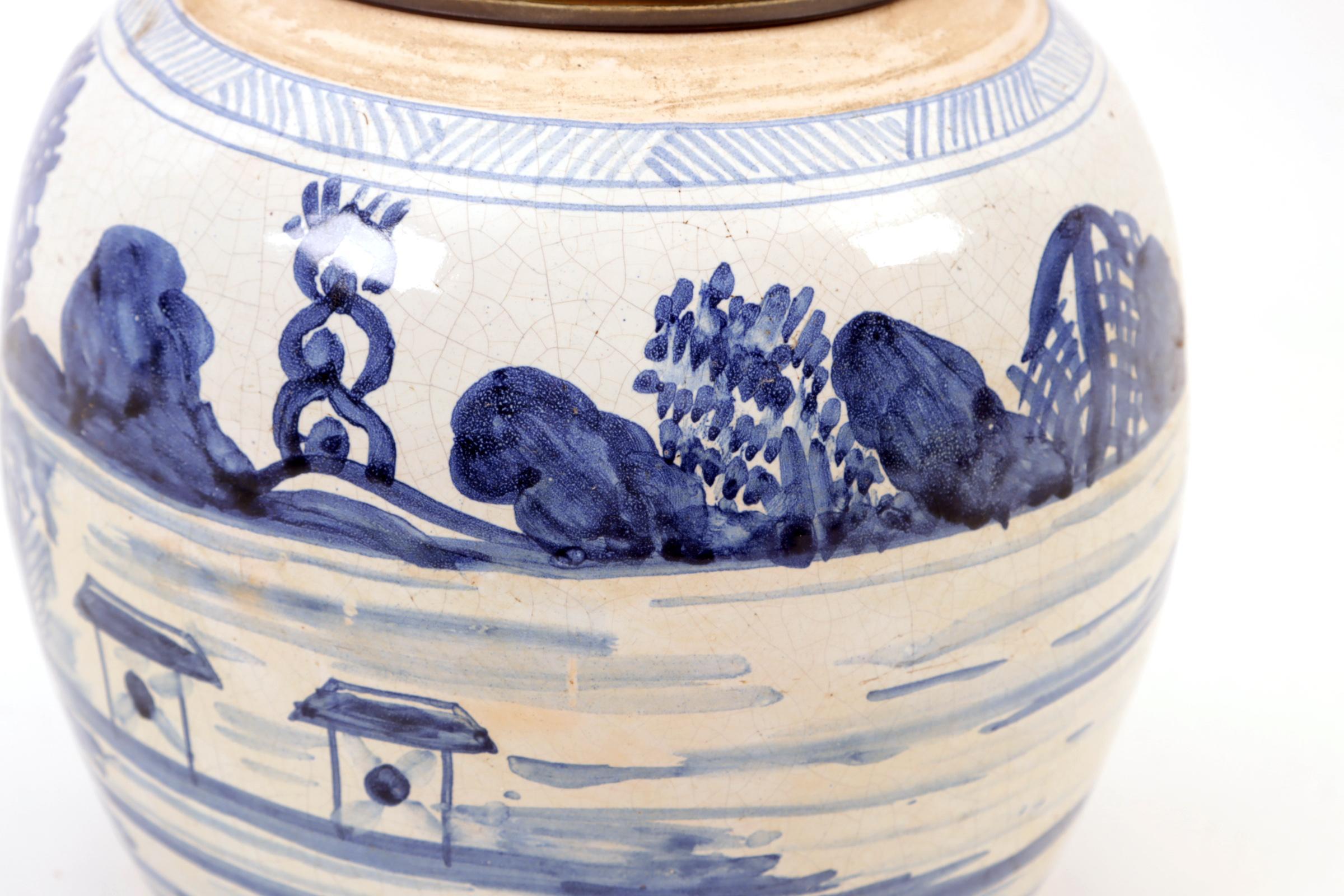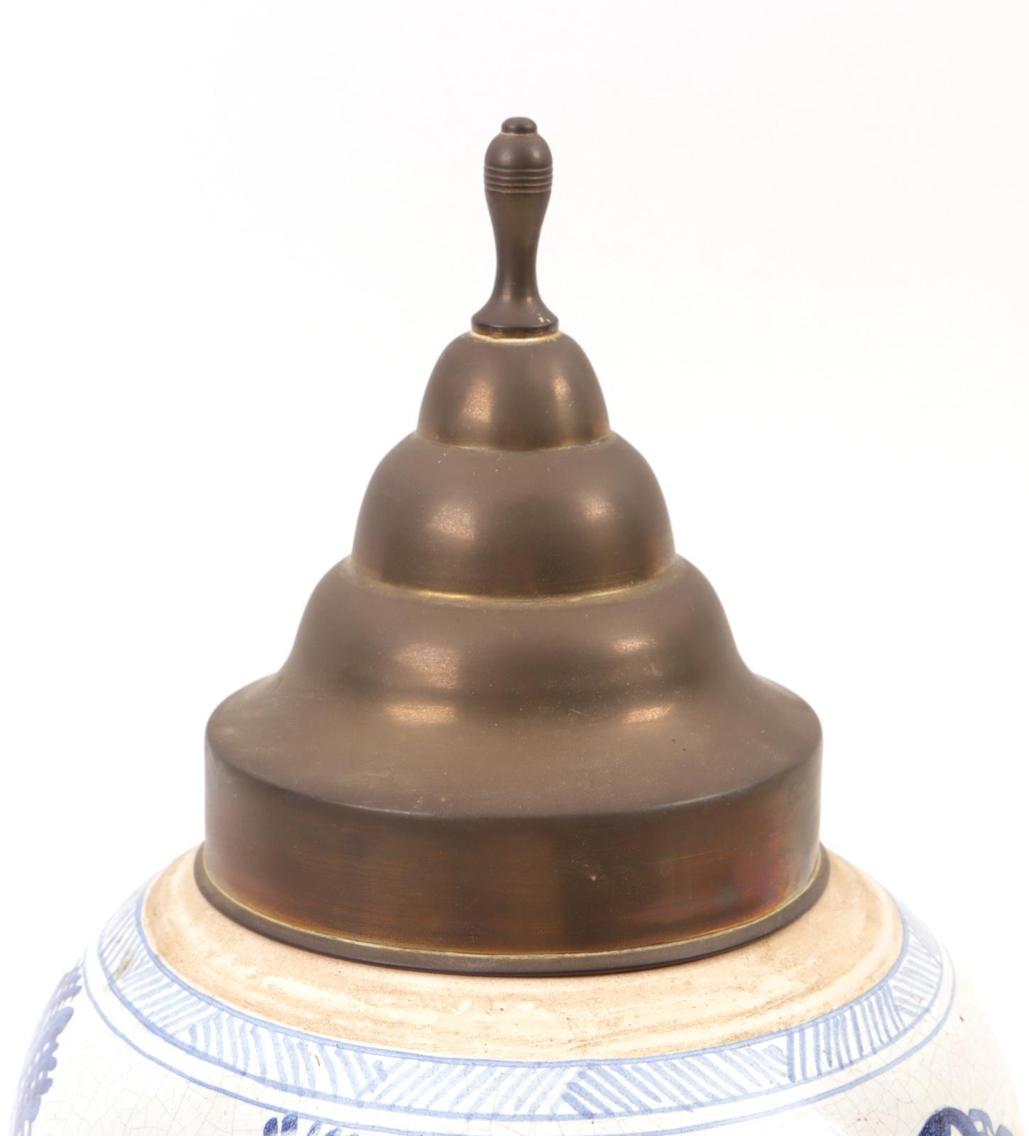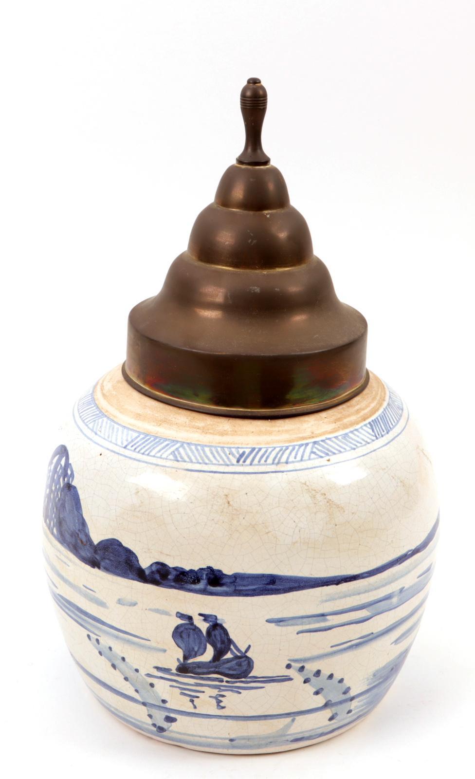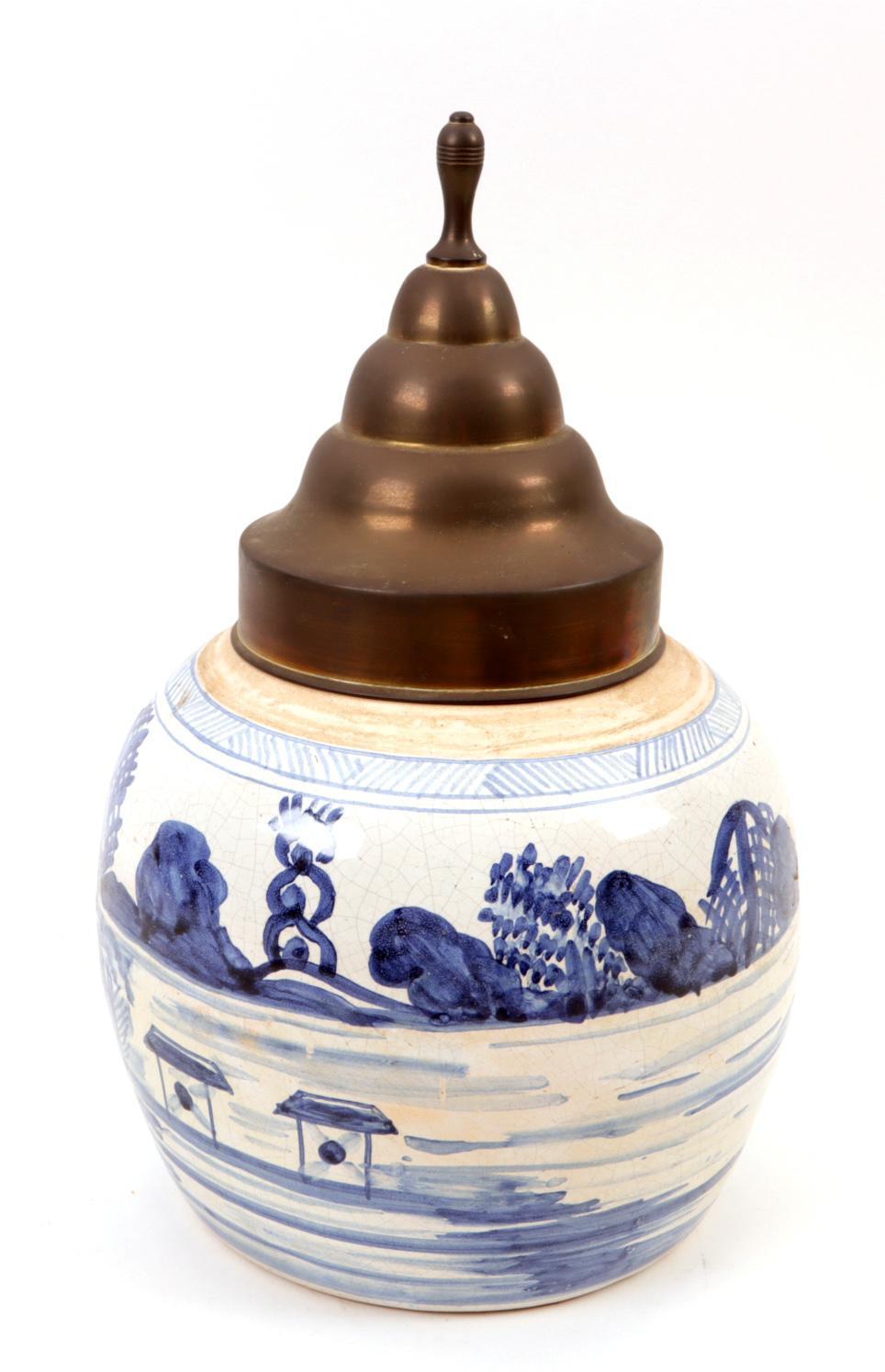 Blauw/wit gedecoreerde aardewerken tabakspot met koperen deksel