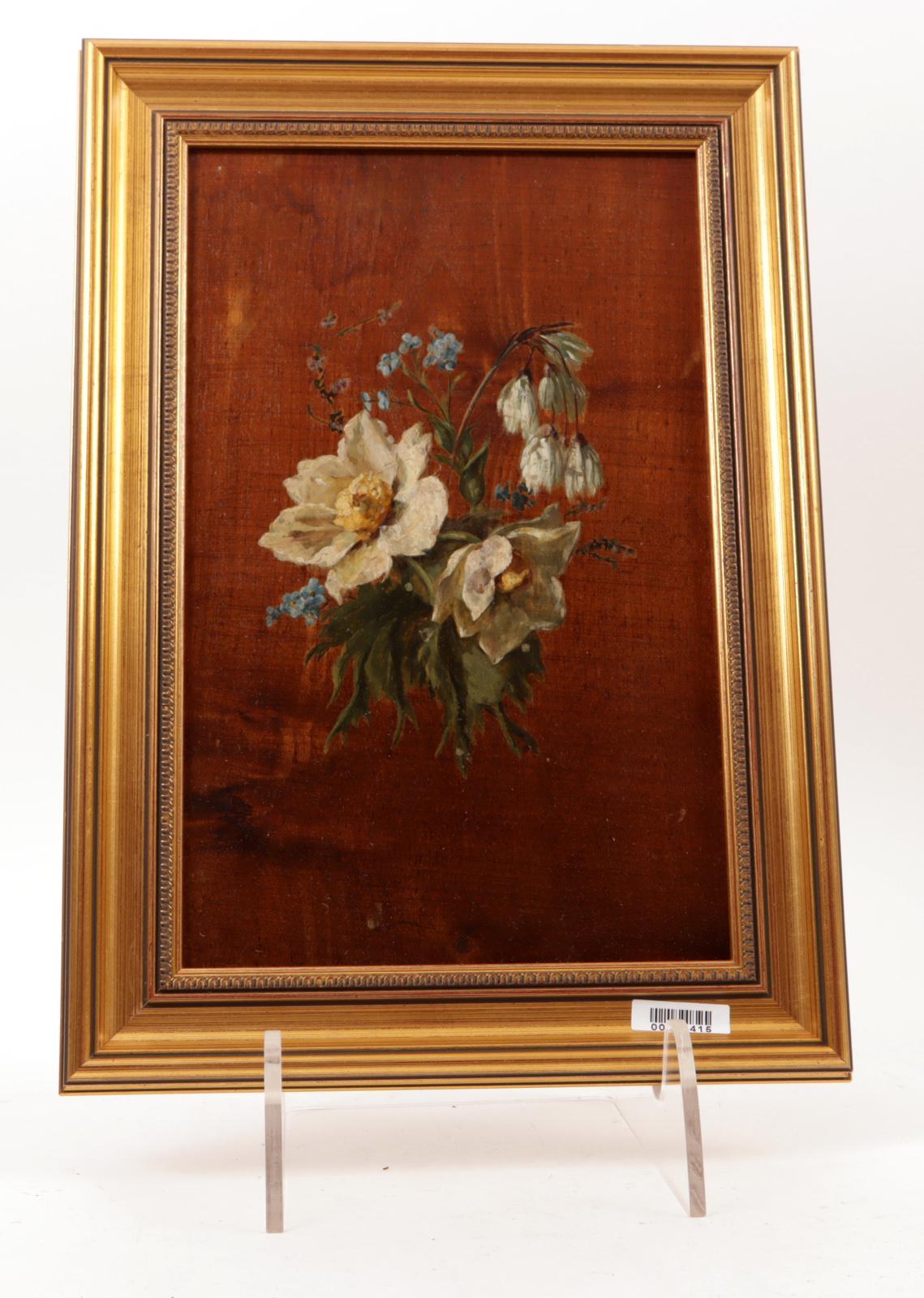 Onb.meester, Bloemstilleven, olieverf op board, 30 x 20 cm. en Onb.meester, Stilleven van een roos, maroefle