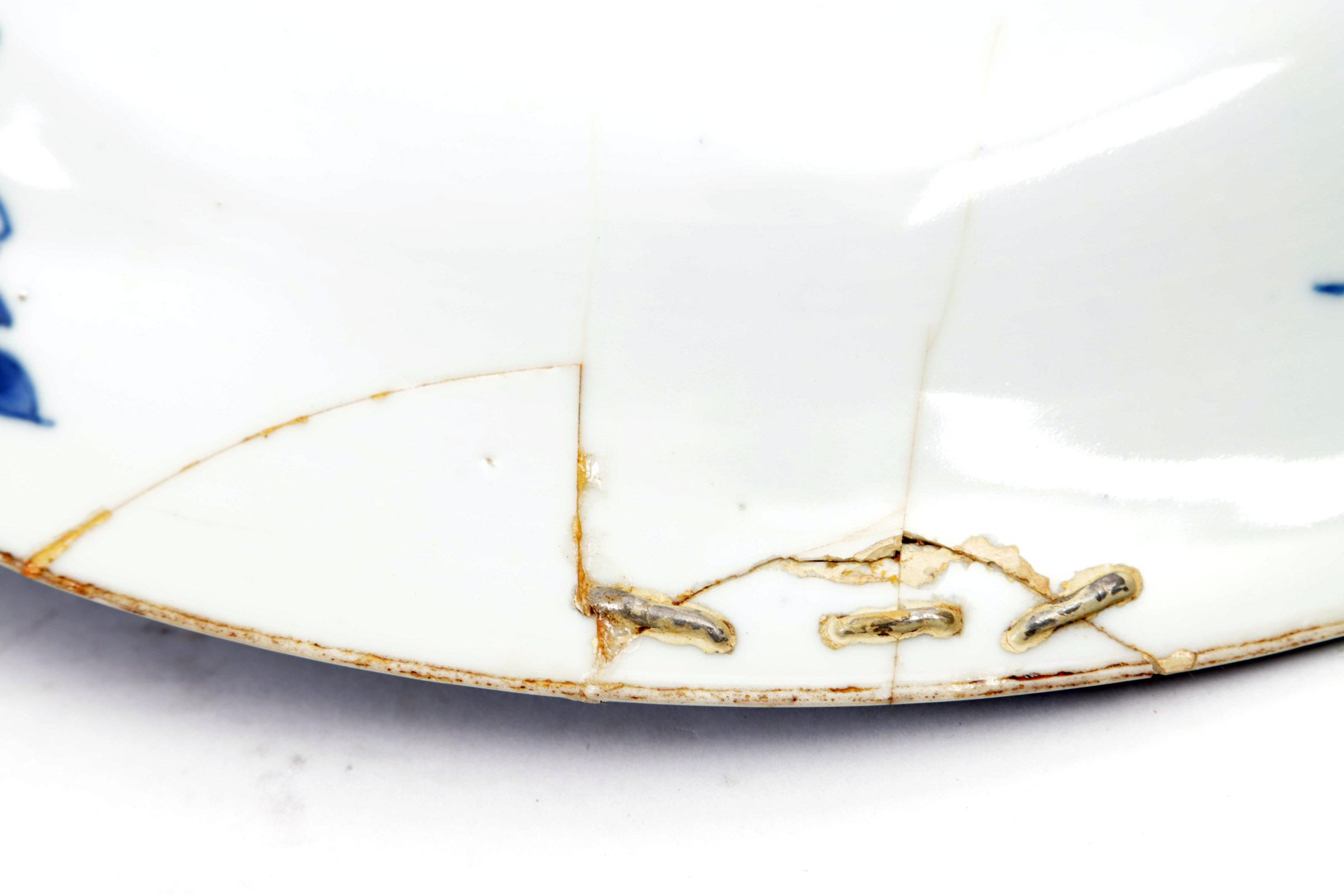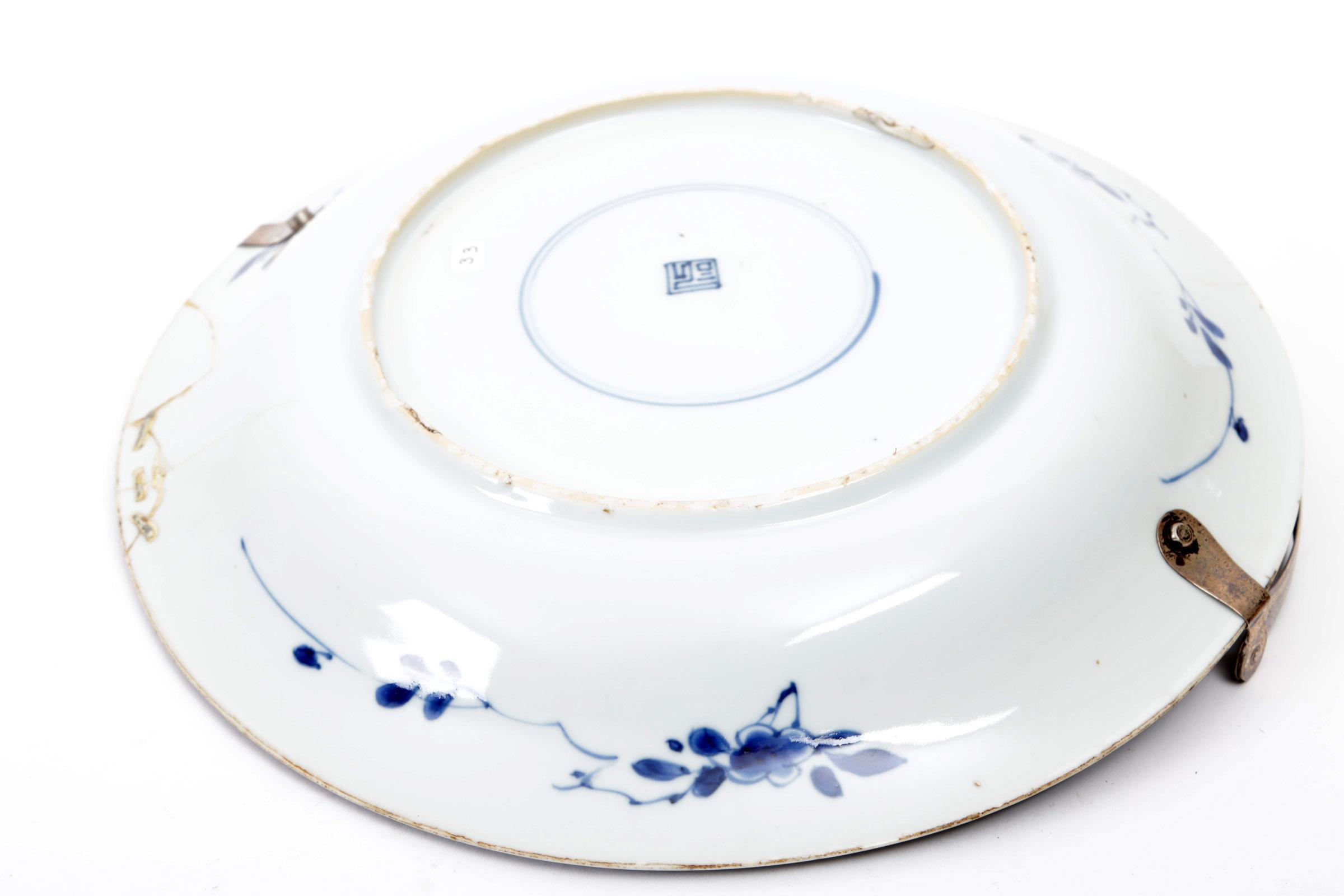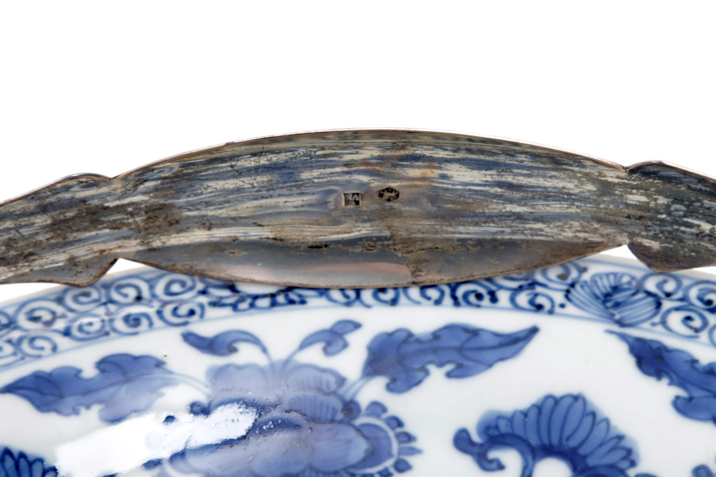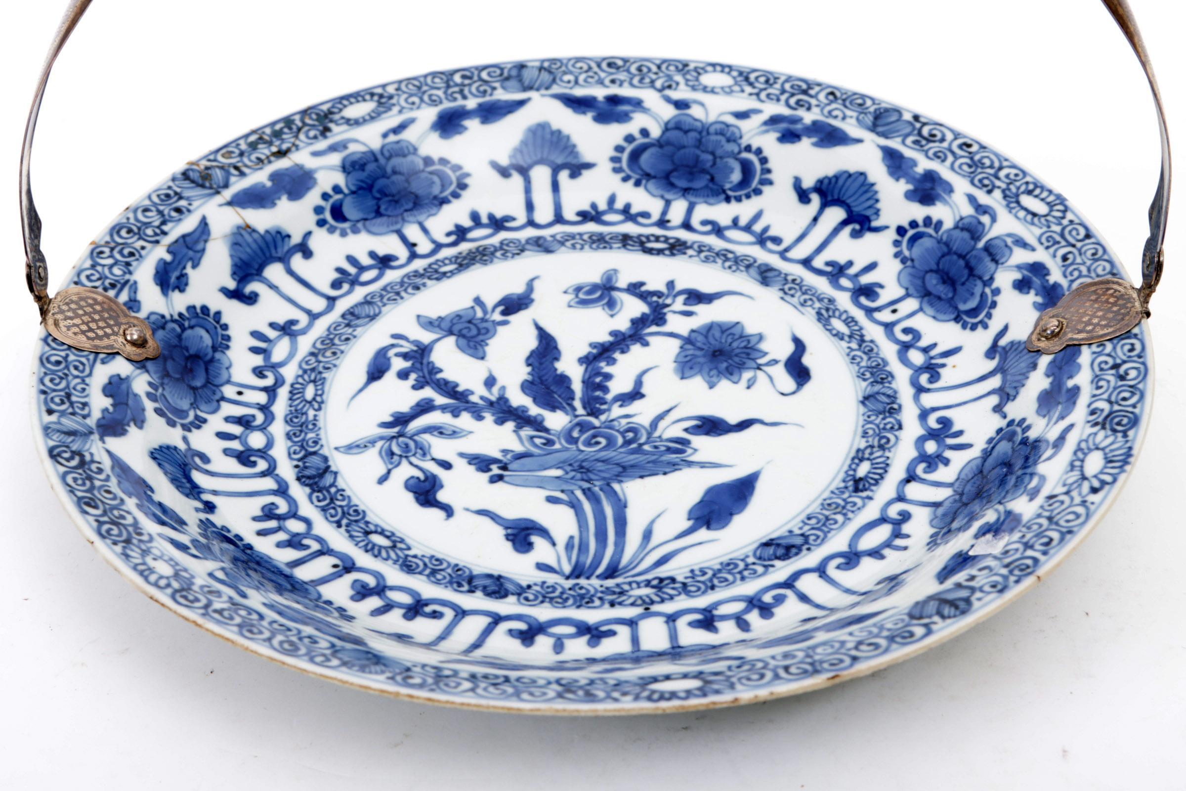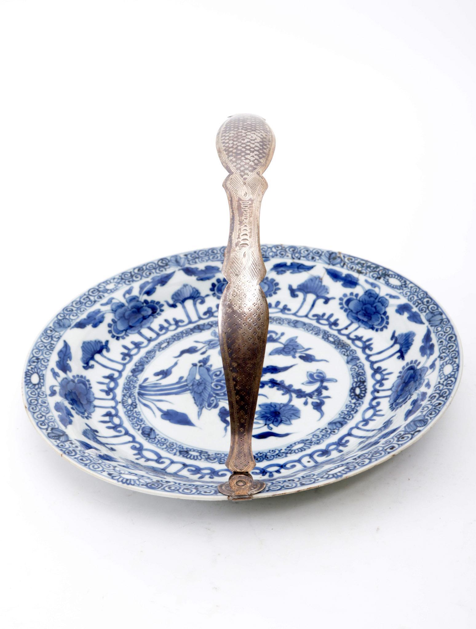 Blauw/wit met bloemen gedecoreerde Chinees porseleinen schaal met 2e gehalte zilveren hengsel (gerestaureerd), diam.28 cm.