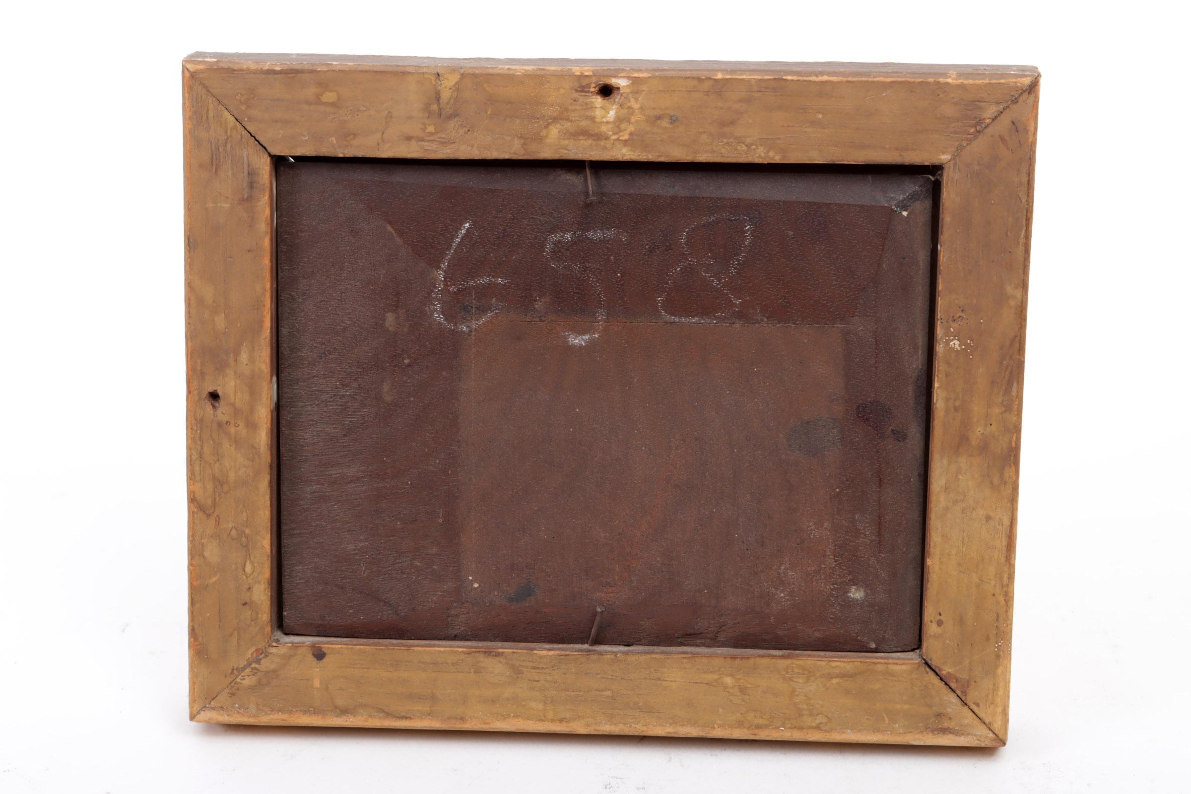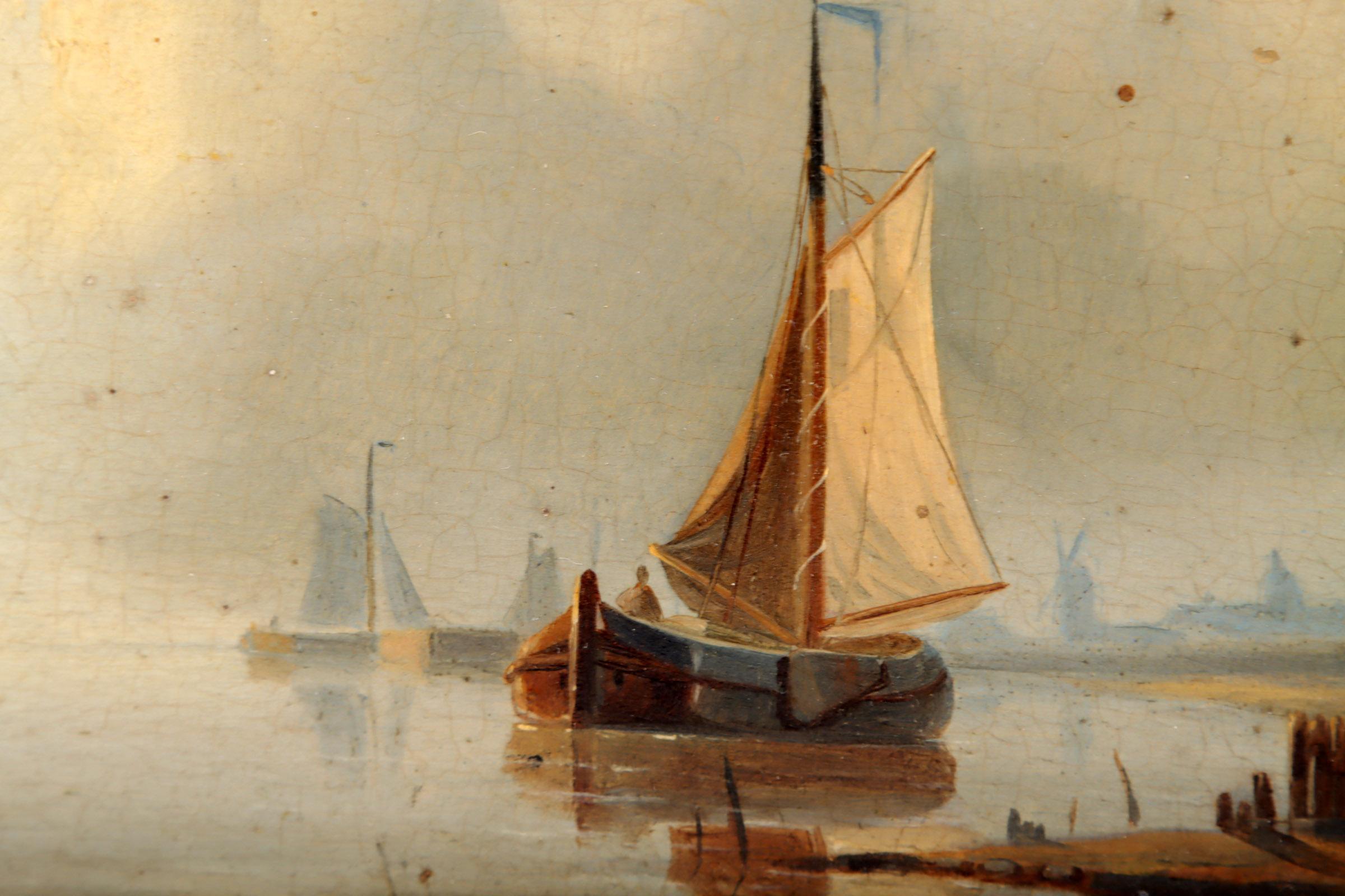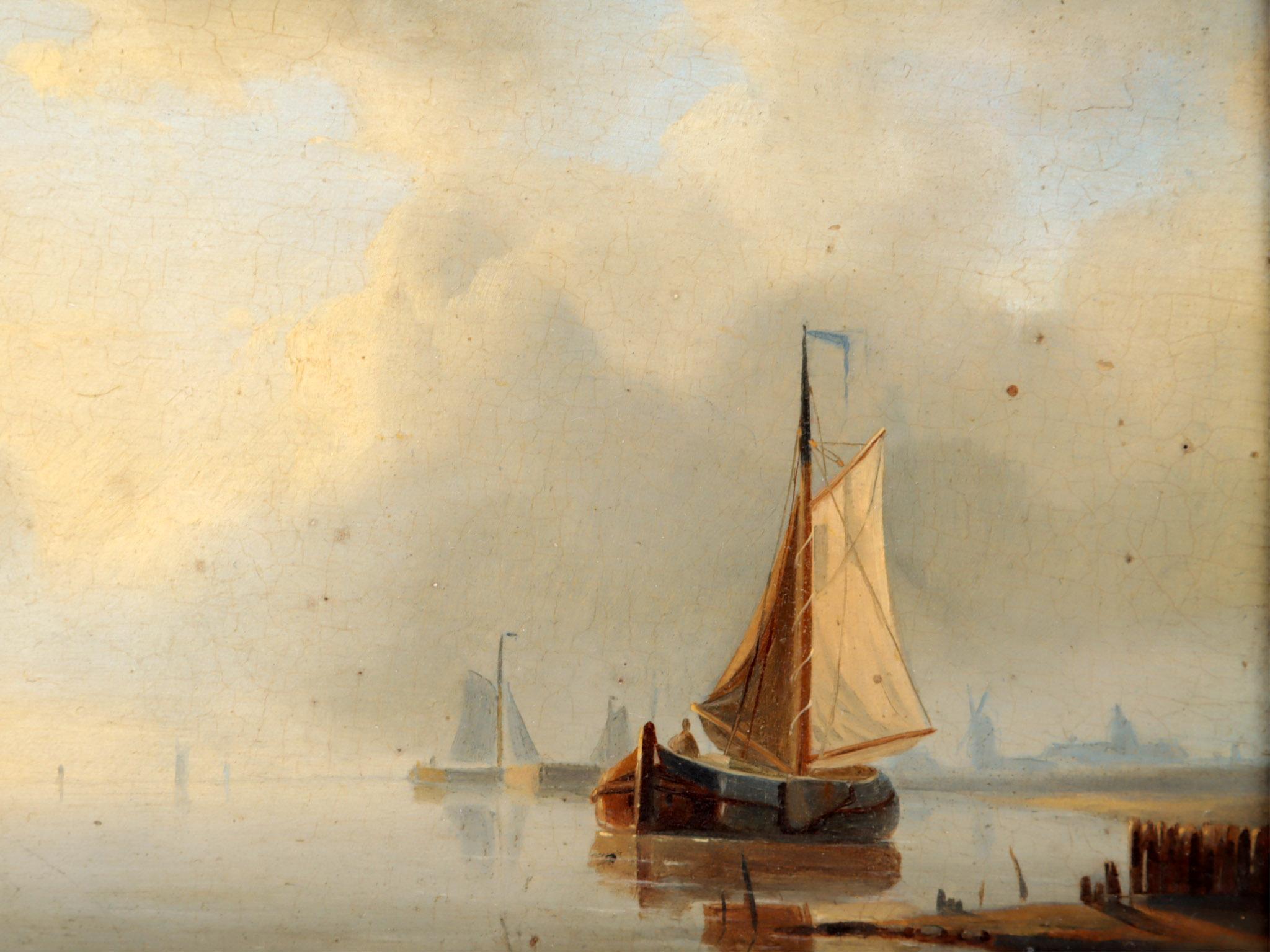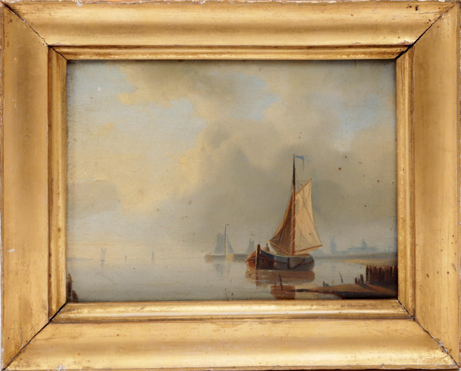 Onb.meester, afgemeerde zeilboot, olieverf op paneel, 19e eeuw, 16 x 12 cm.