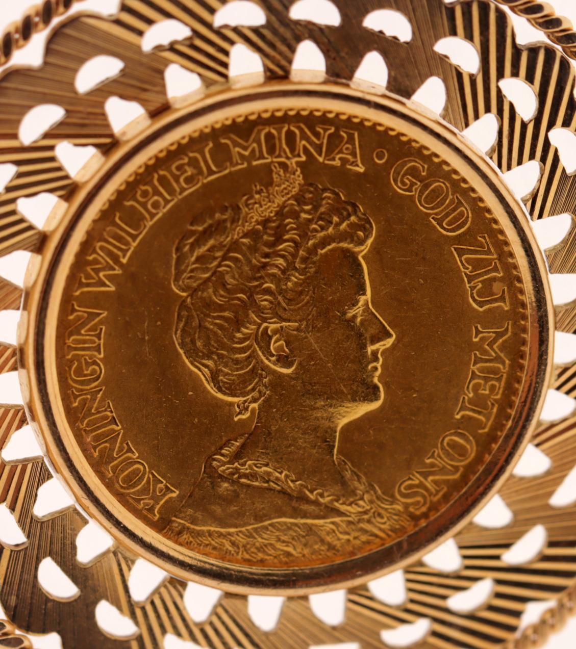 Fijngouden 10 gulden muntstuk, jaarletter 1908 in 14 kt. gouden omranding aan een 14 kt. gouden collier, totaal 27 gram