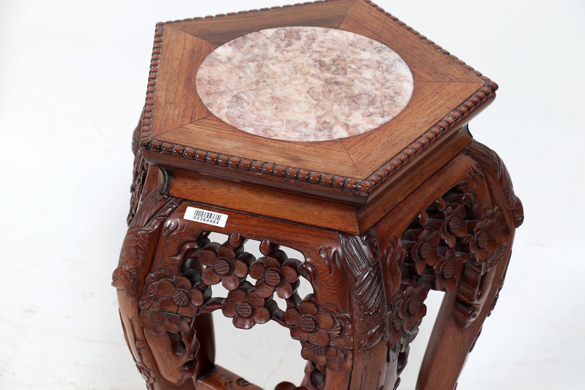 Opengewerkte houten 5-kantig hokker met marmeren blad, h.48,5 cm.