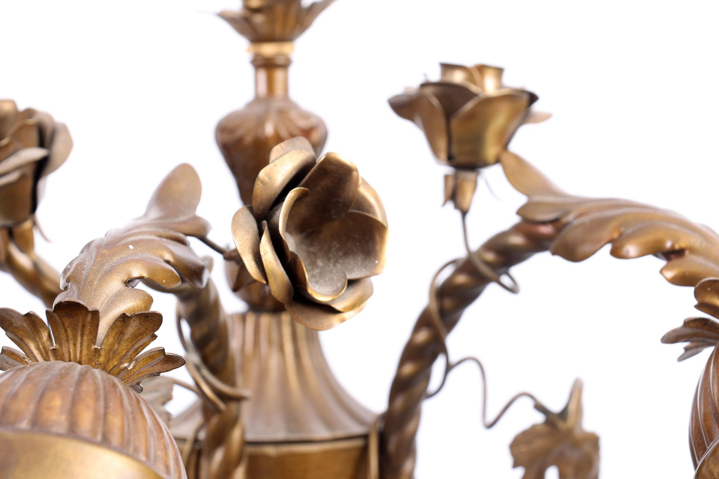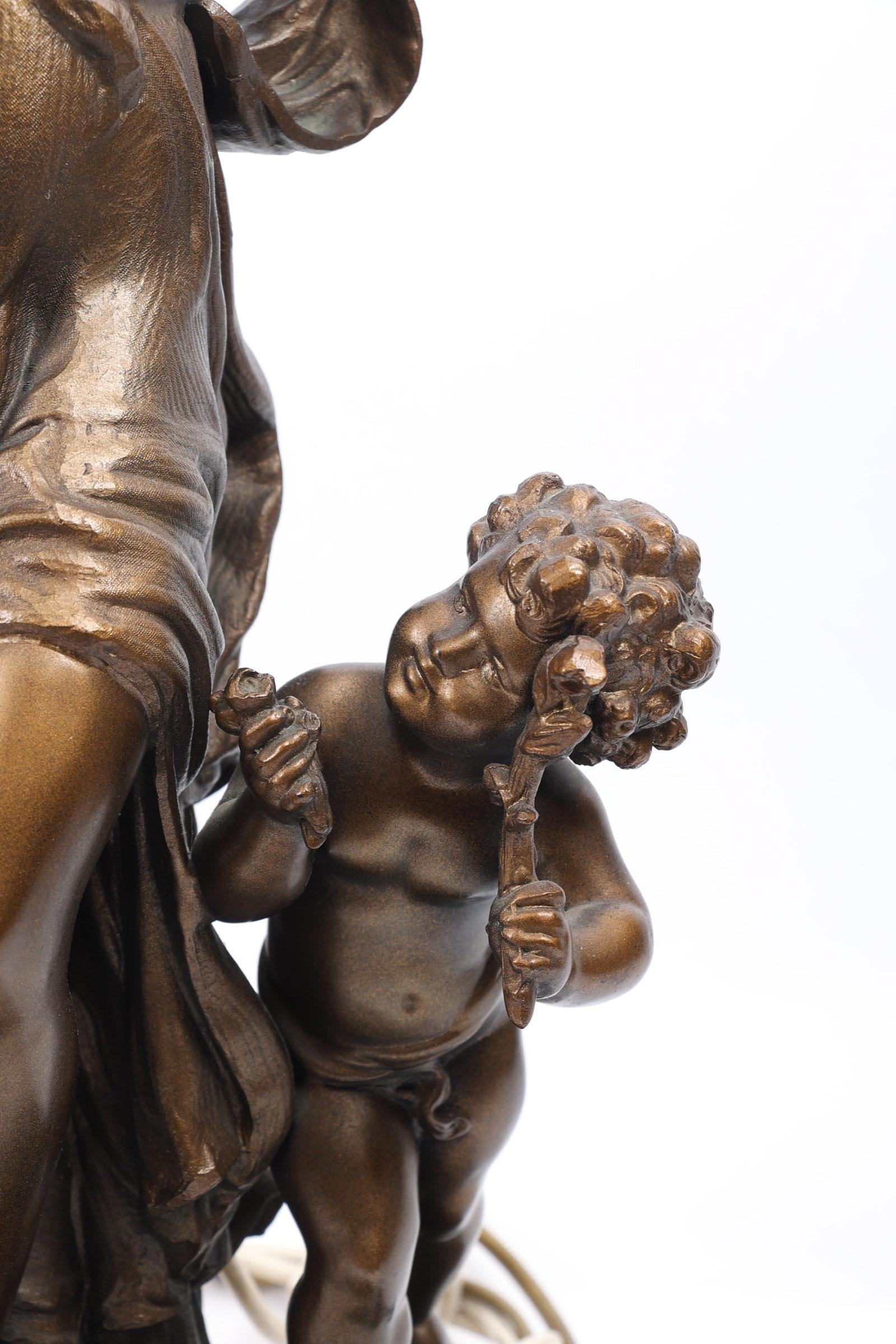 Bronskleurig legering lamp met 3 kristallen kelken met voorstelling van moeder en kind rustend op marmeren basement, ca. h.77 cm.