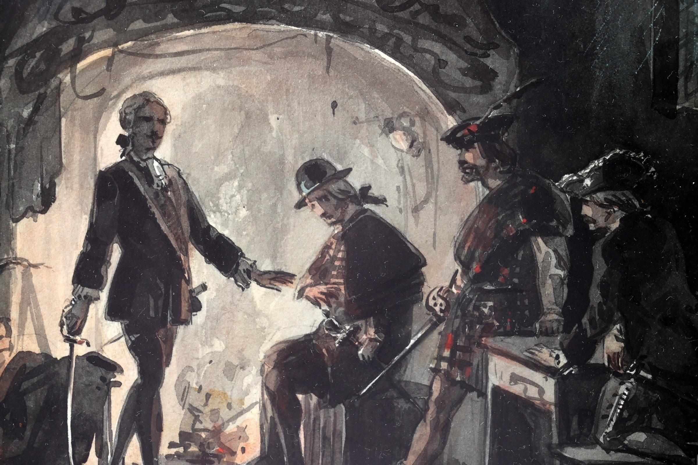 Willem de Famars Testas (1834-1896), Personen in interieur bij haardvuur, gemengde techniek, gedateerd februari 1852, 24 x 34 cm.