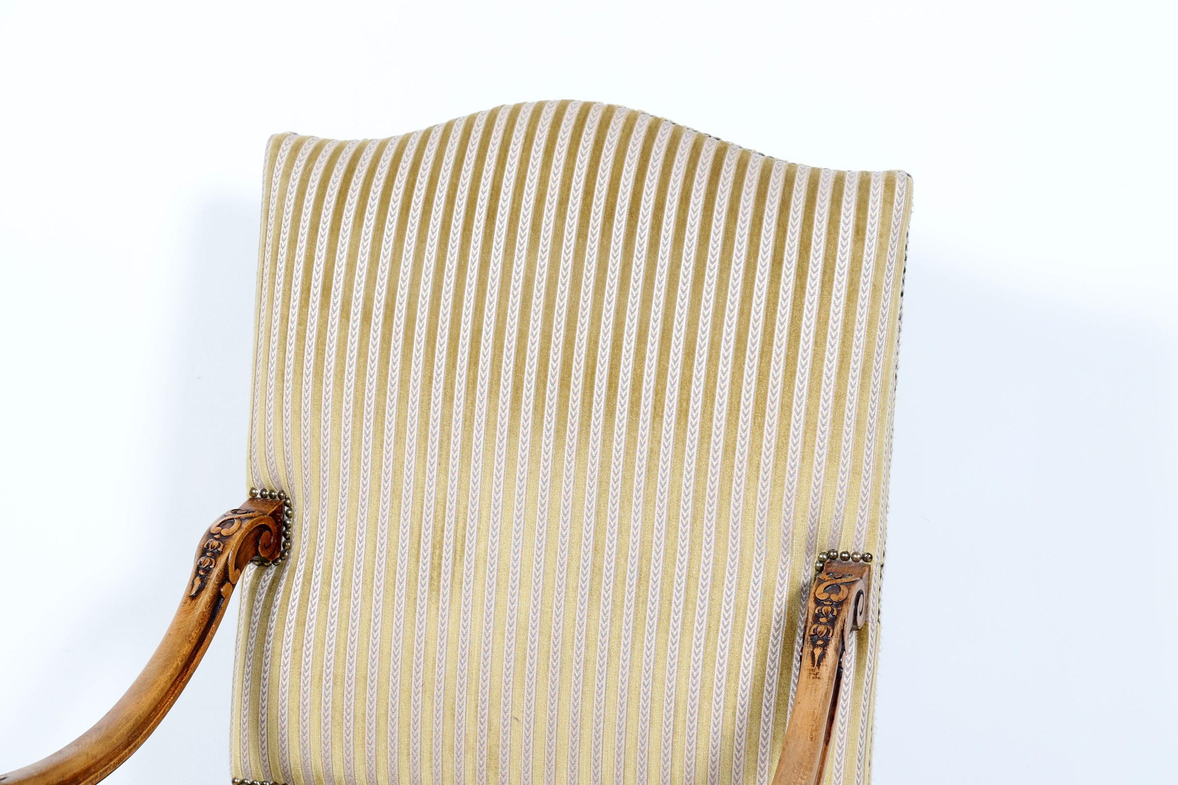 Antieke notenhouten armfauteuil met gestreepte stof bekleed