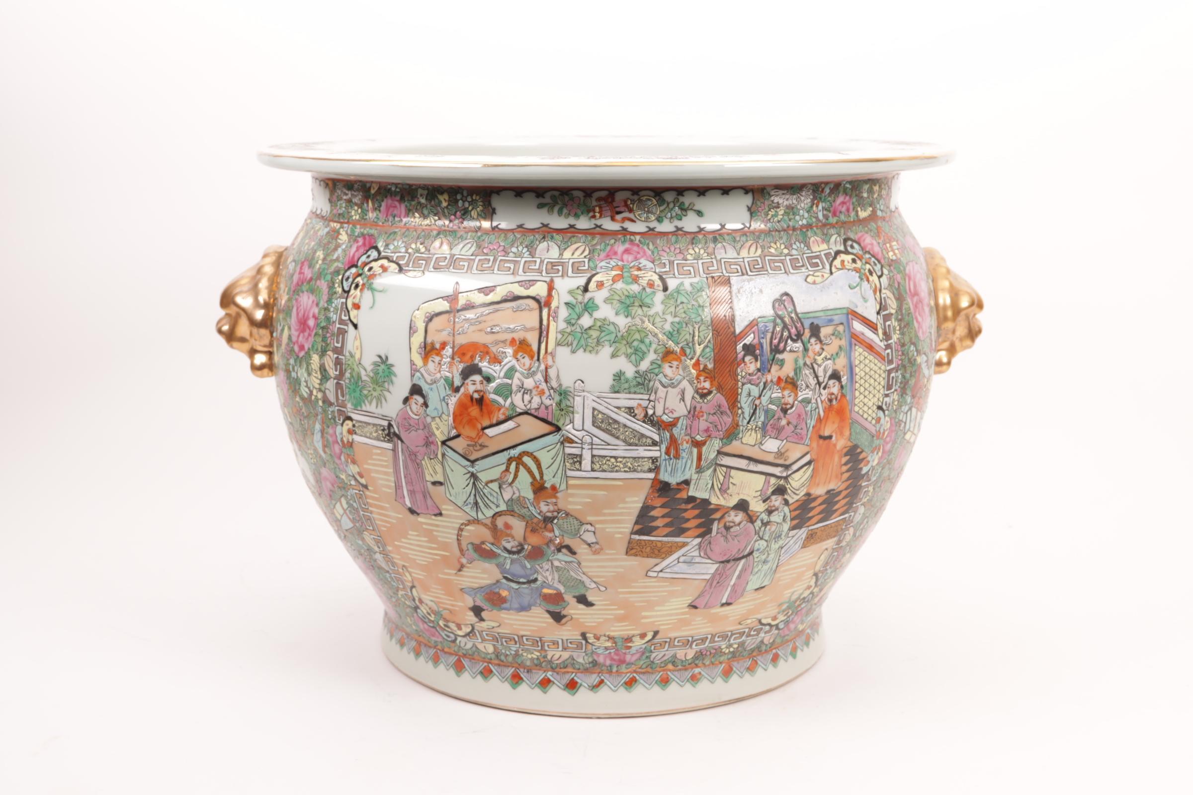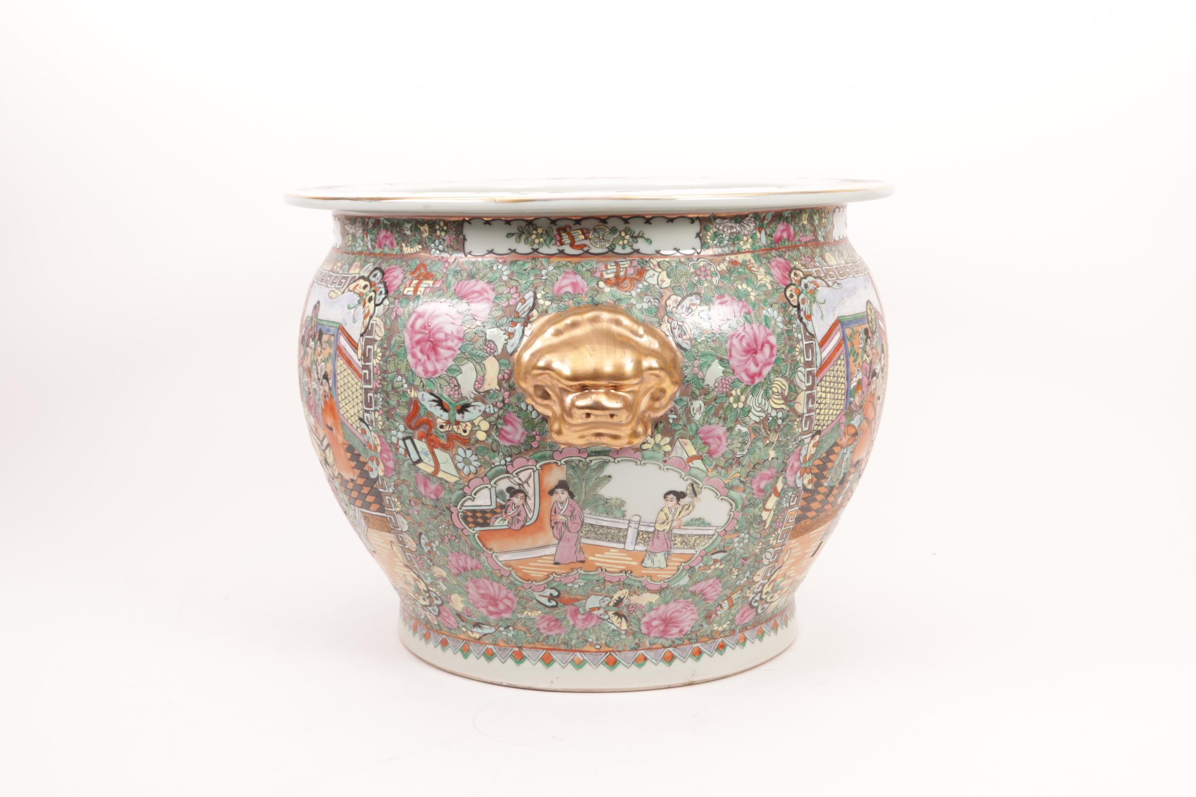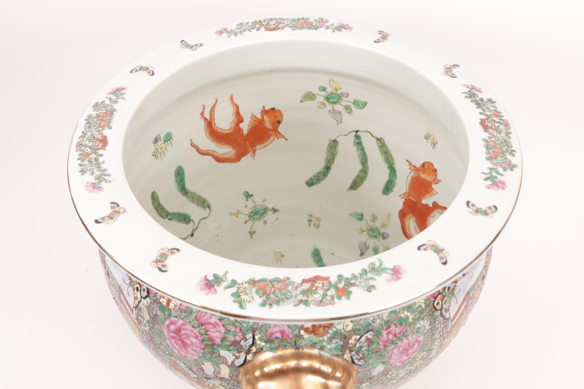 Chinees porseleinen cache pot met aan de binnenkant beschildering van vissen, diam.43 cm.