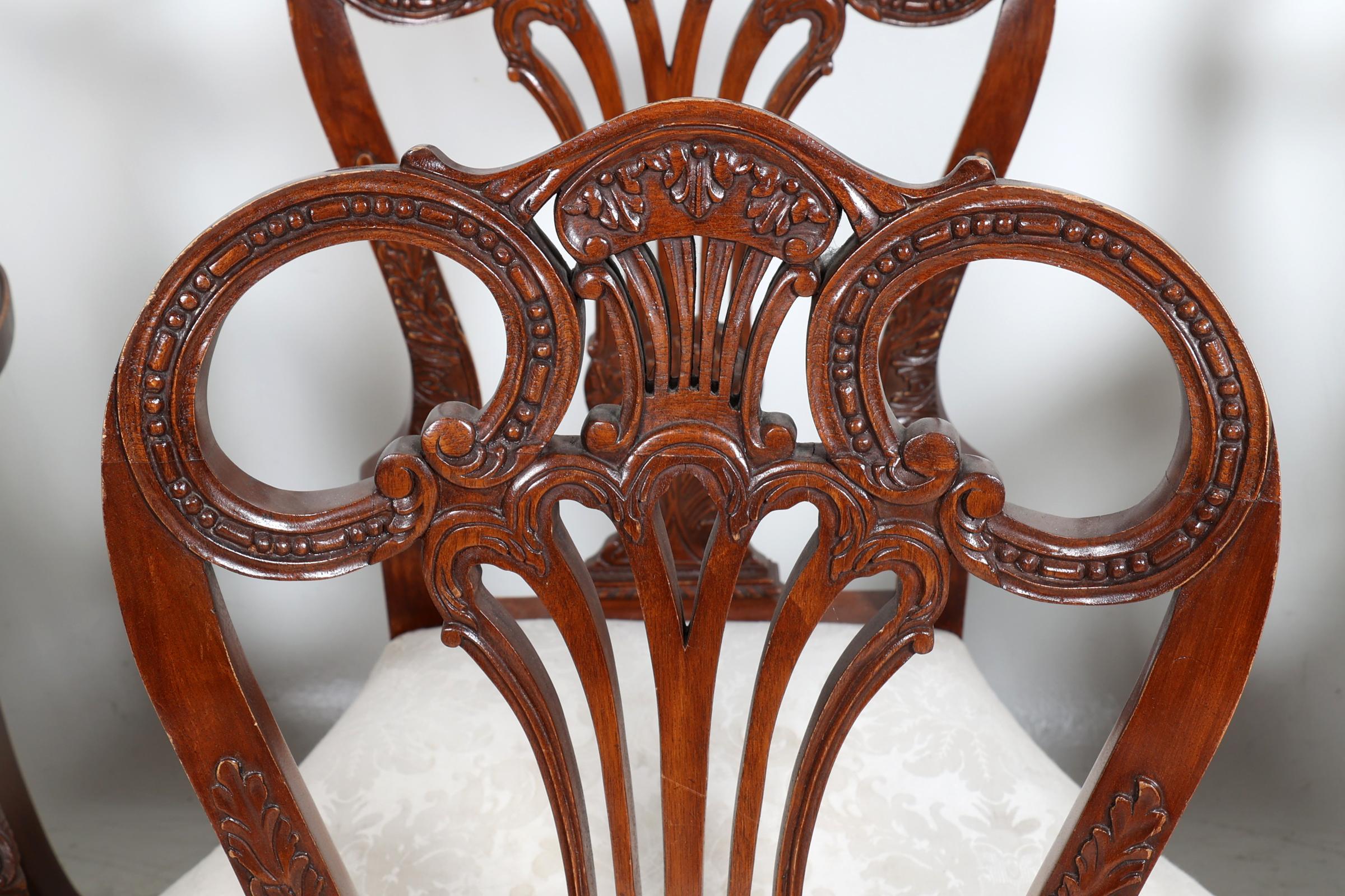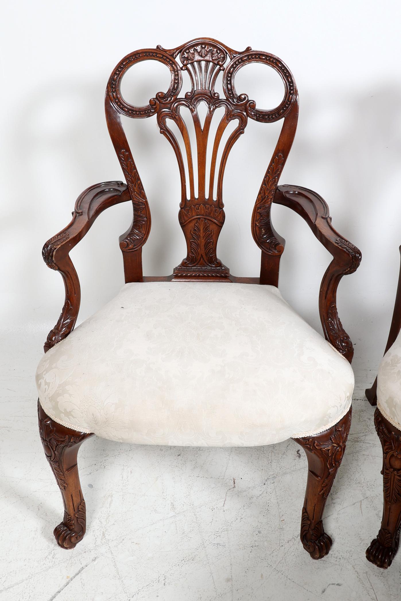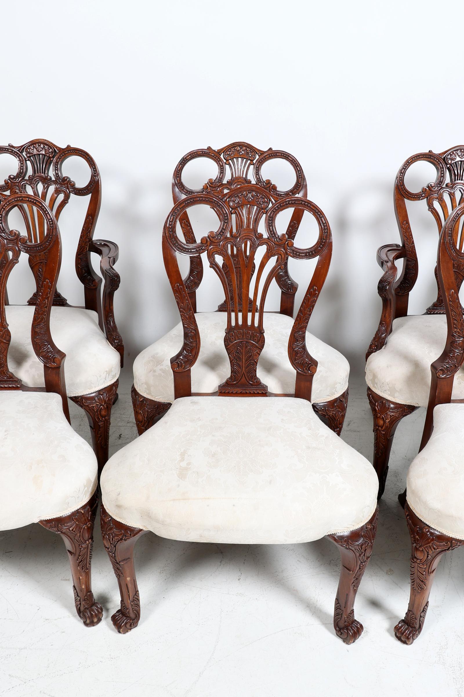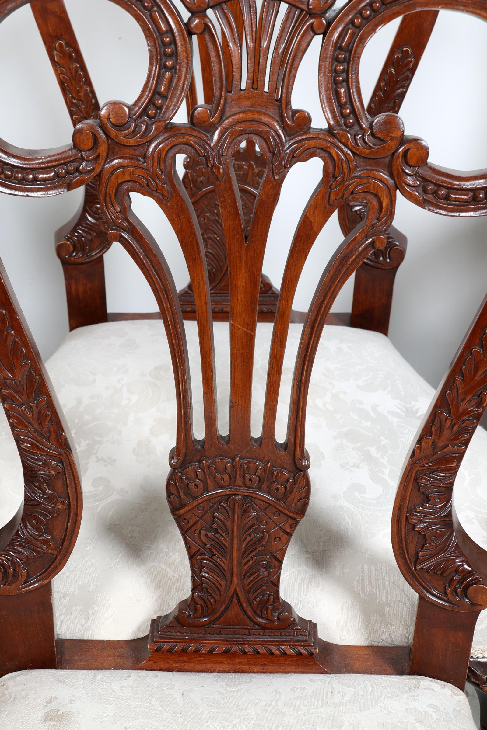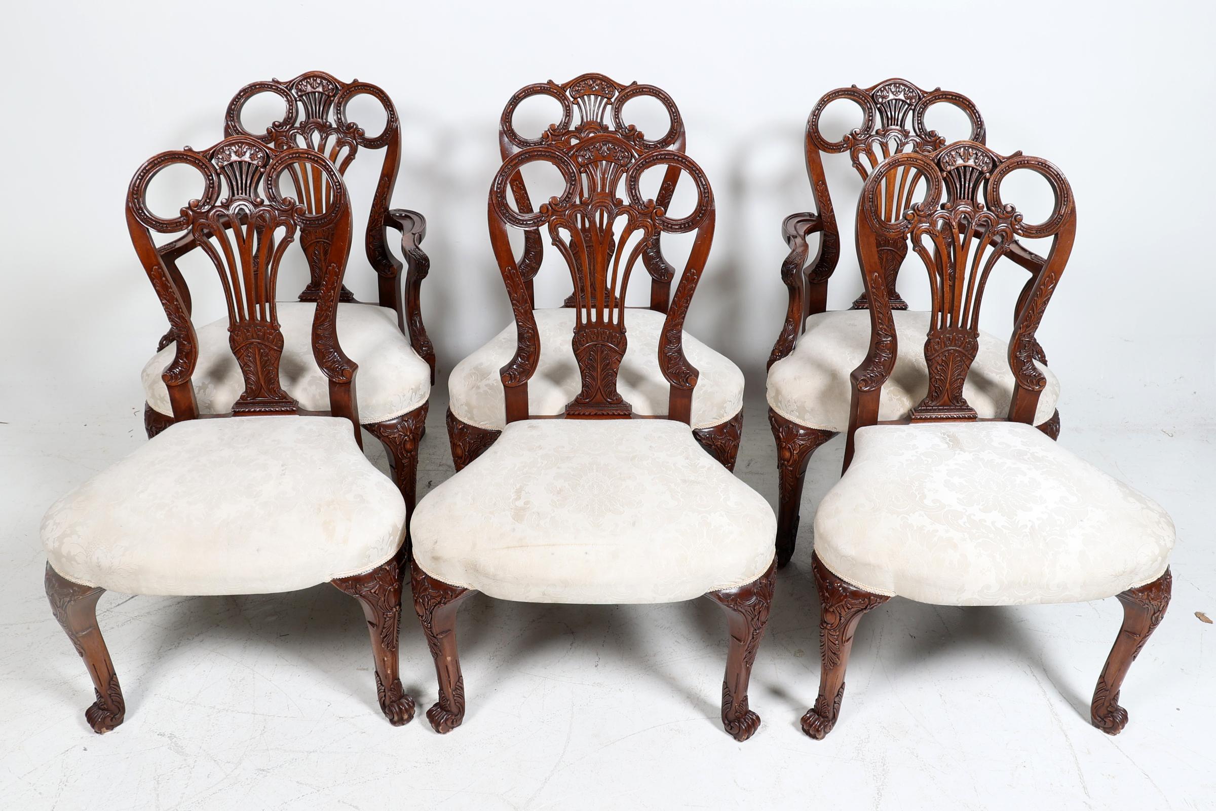6 Opengewerkte mahoniehouten stoelen waarvan 2 met armleuningen met witte stof bekleed