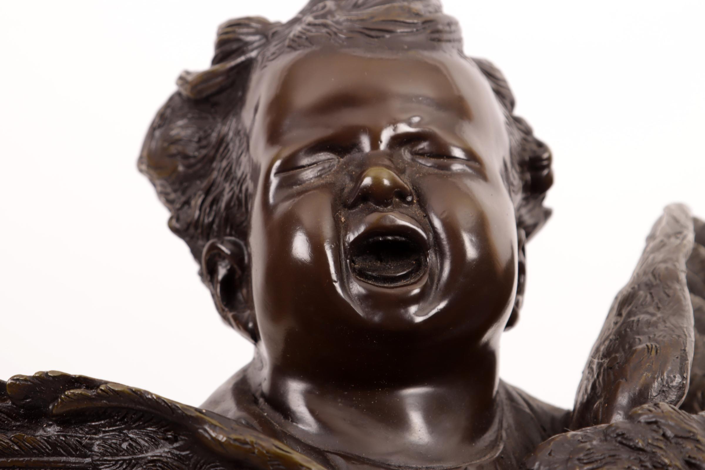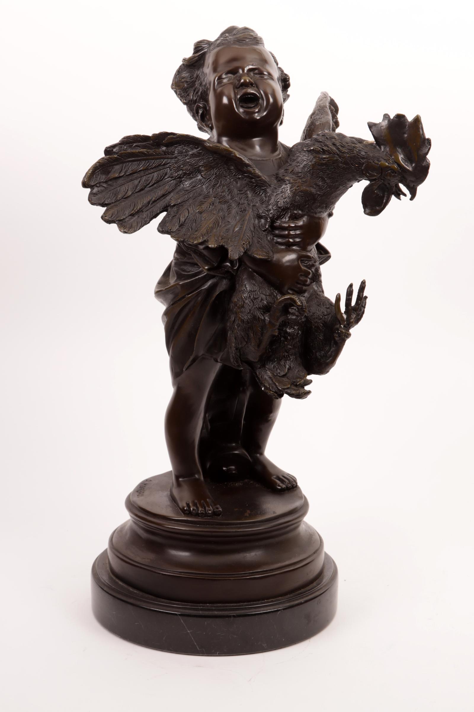 Bronzen sculptuur van kindje met haan rustend op marmeren voetstuk. h. 55 cm.