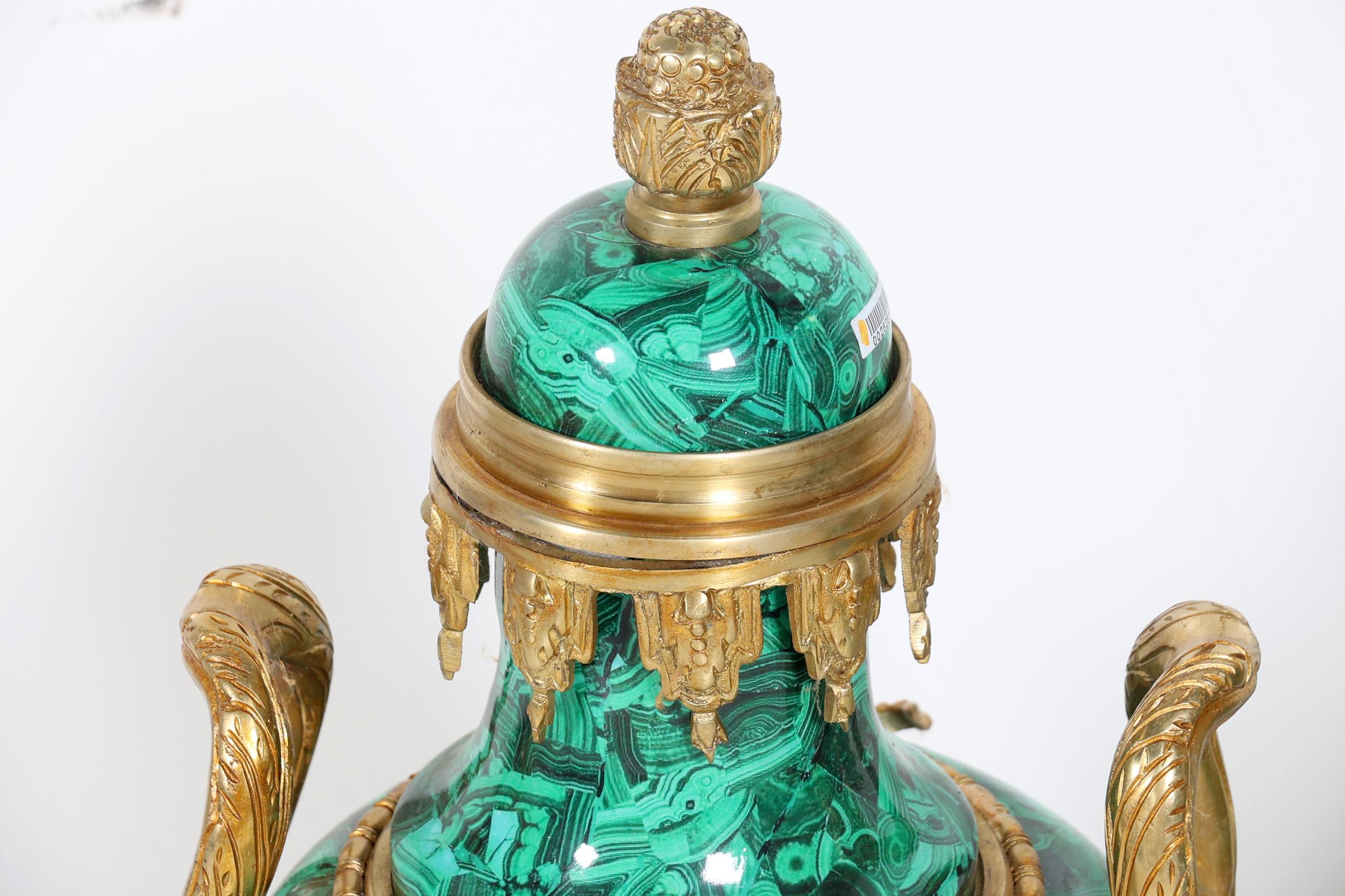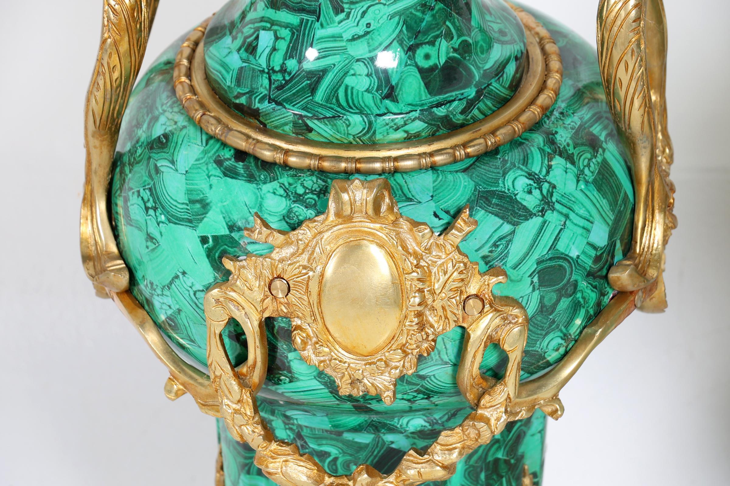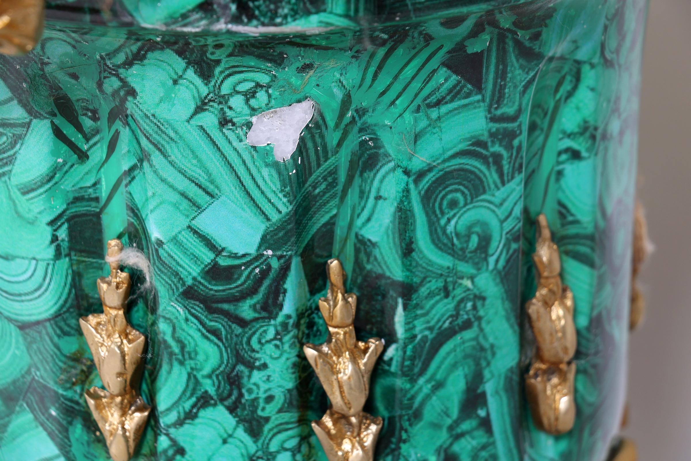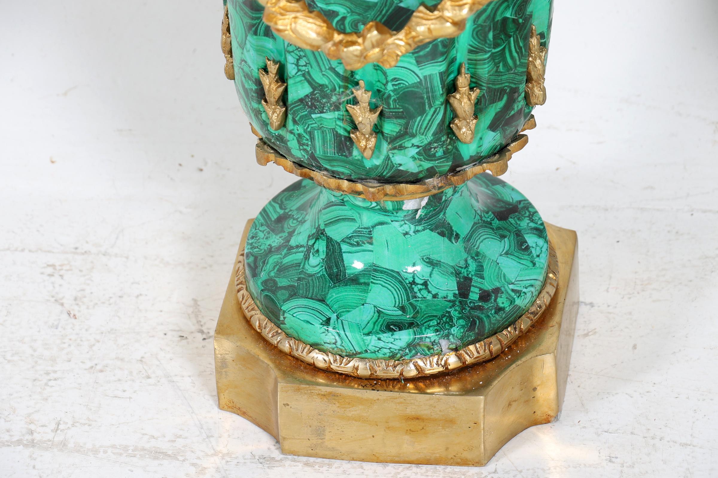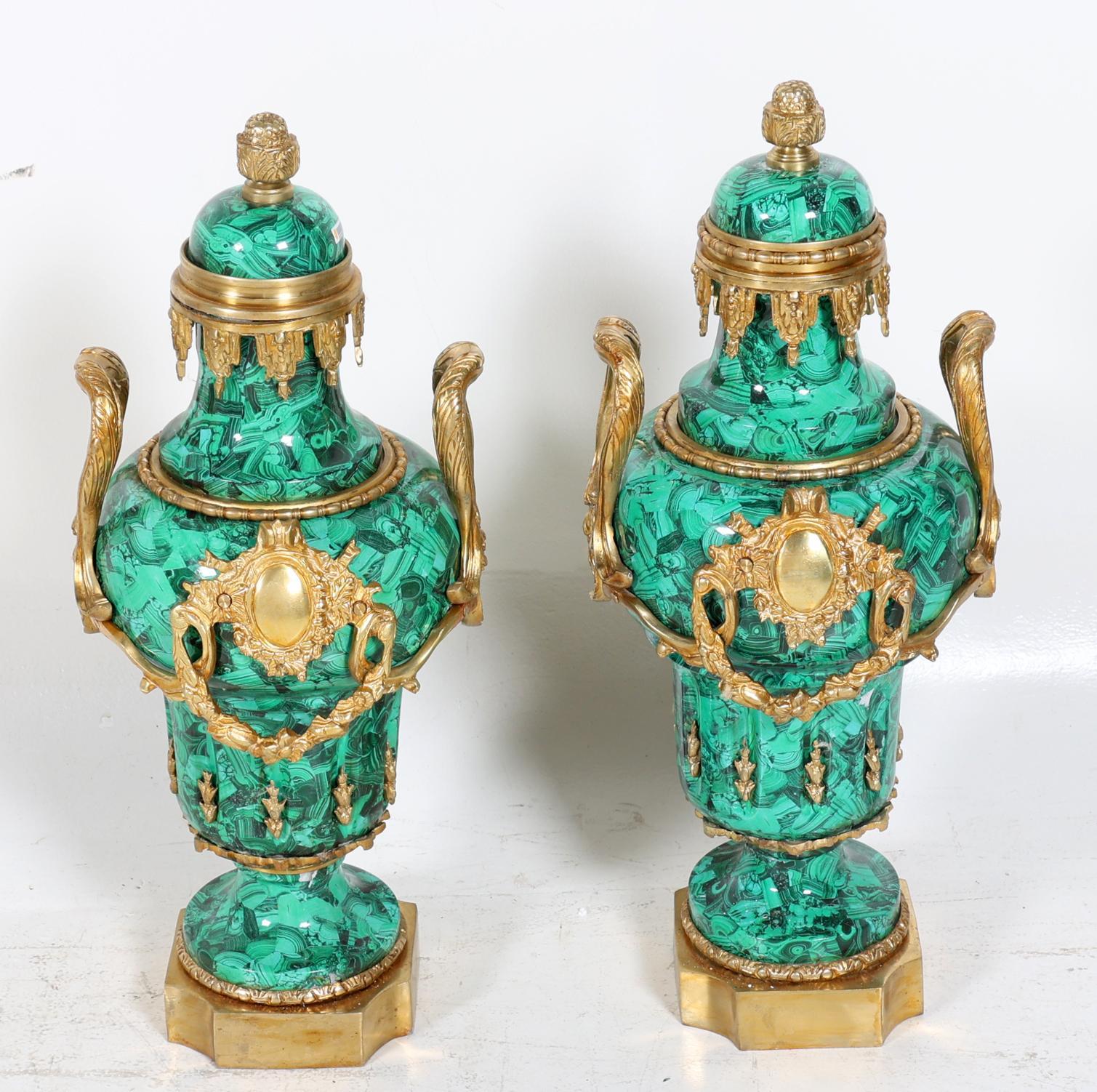 2 Marmeren vazen met malachiet look en bronzen monturen, h.65 cm. (enkele beschadigingen)