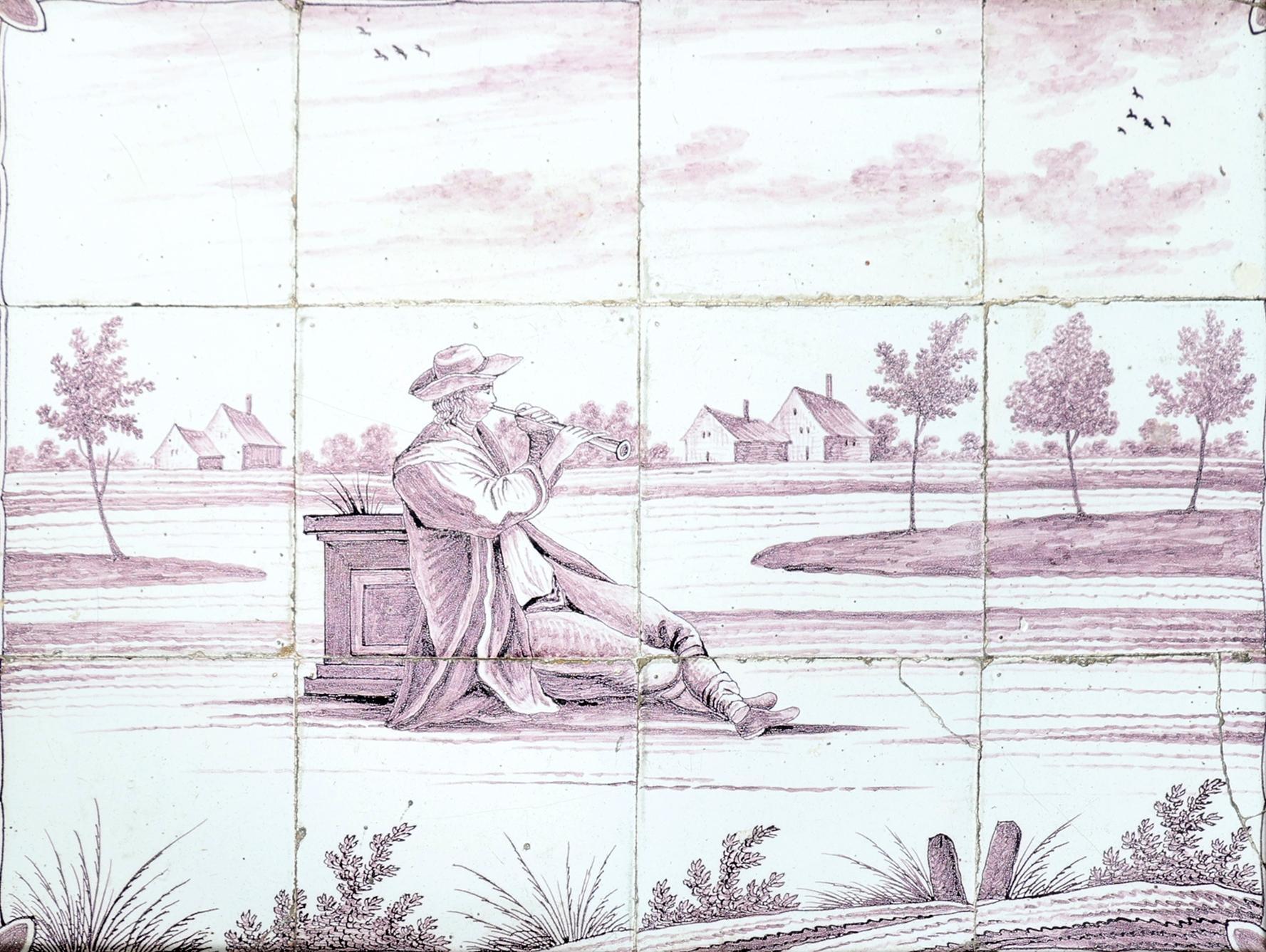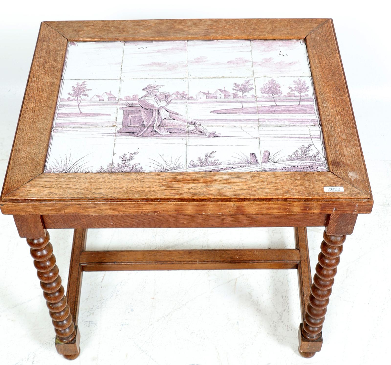 Antiek mangaankleurig 12-delig tegeltableau met voorstelling van fluitspelende man in landschap gevat in eikenhouten tafel met getorste poten. H. 62 x B. 62 D 49 cm