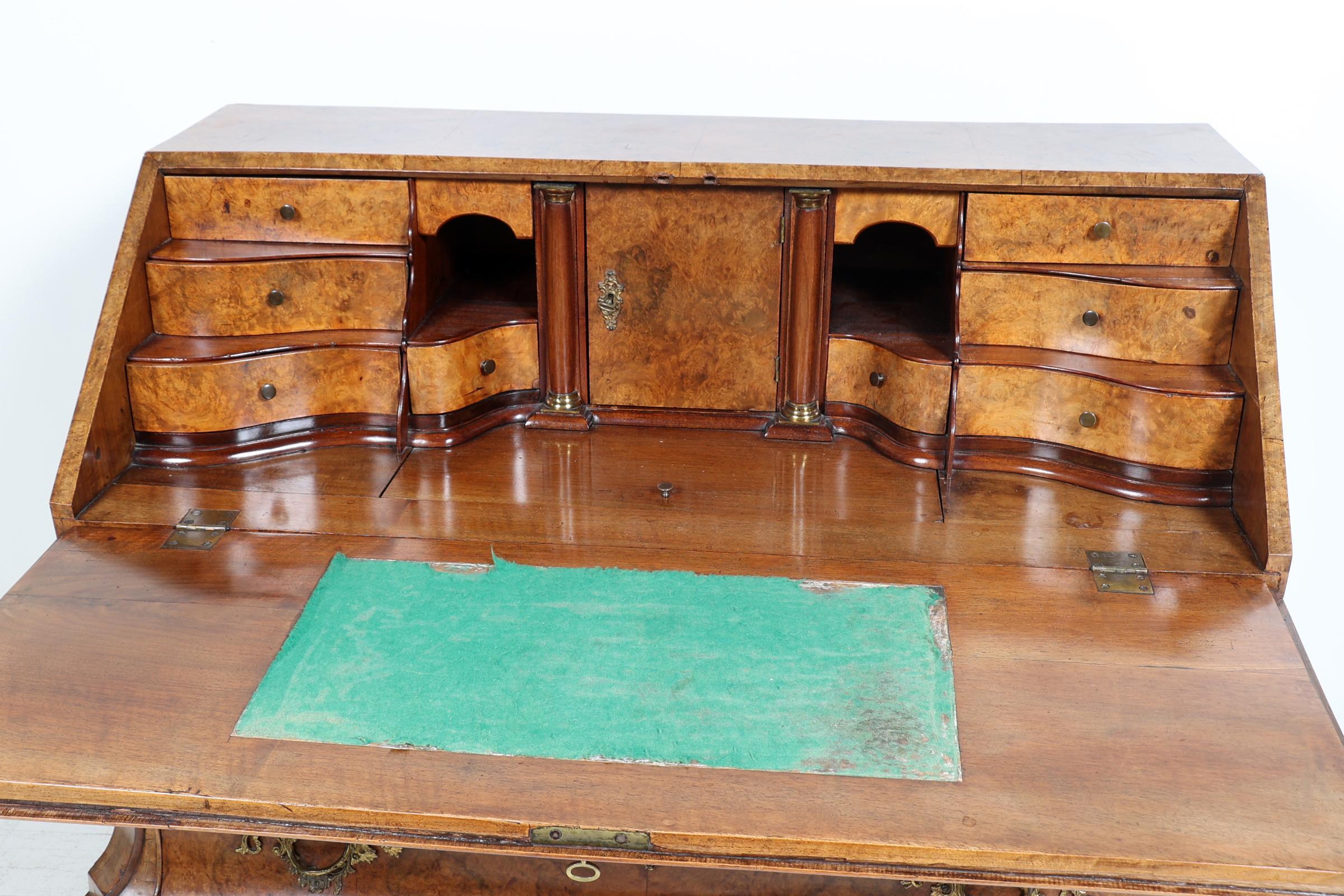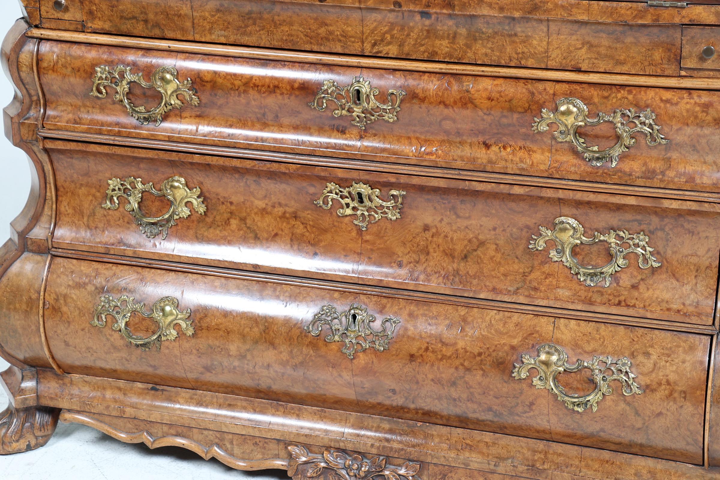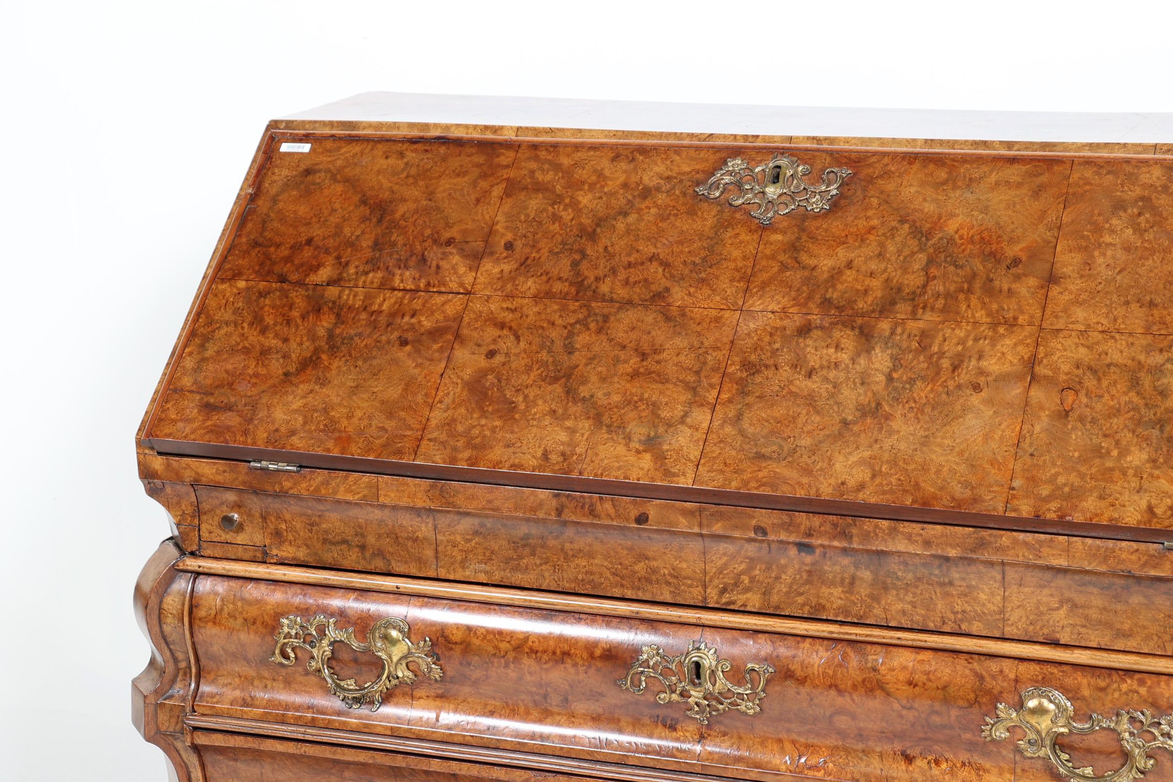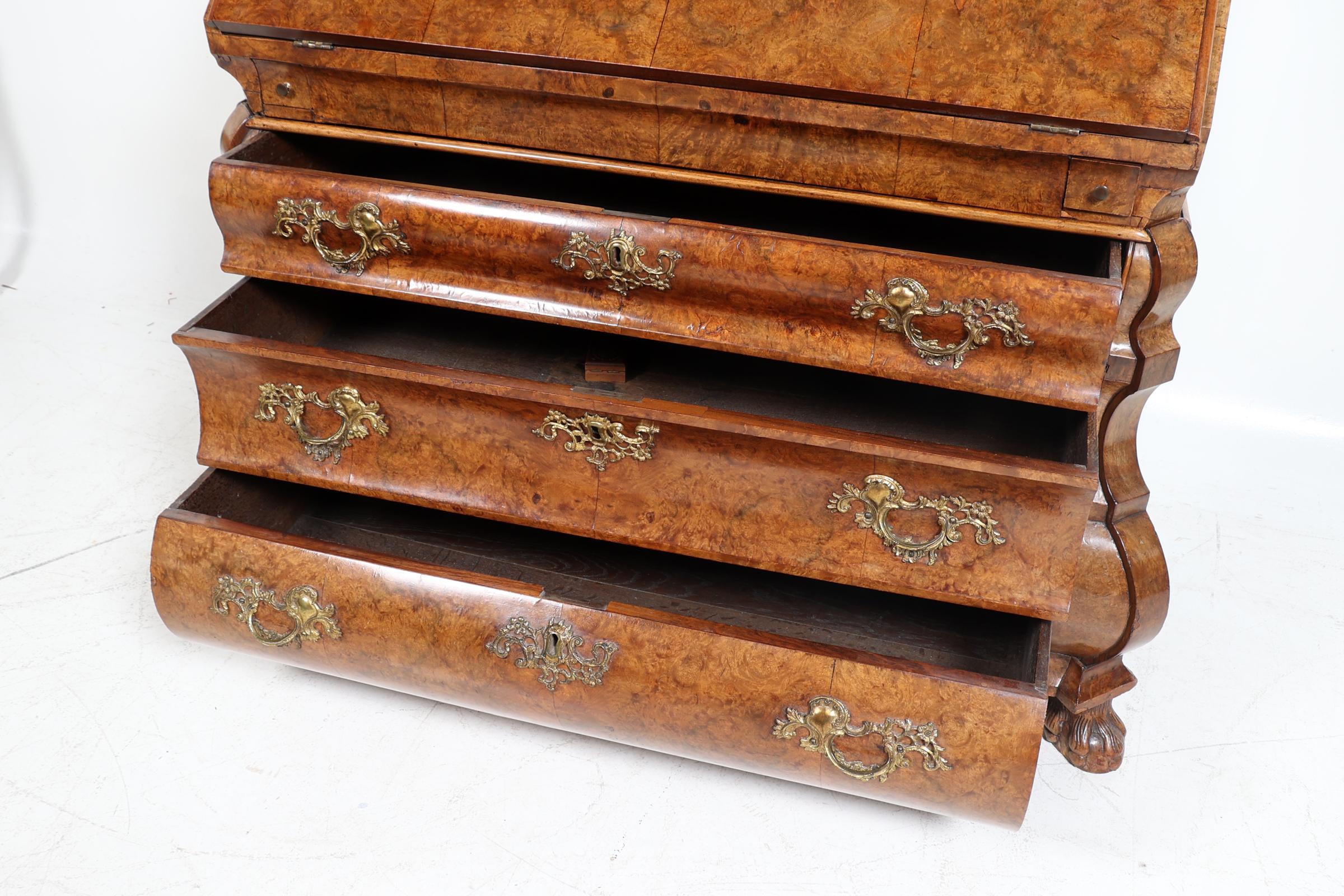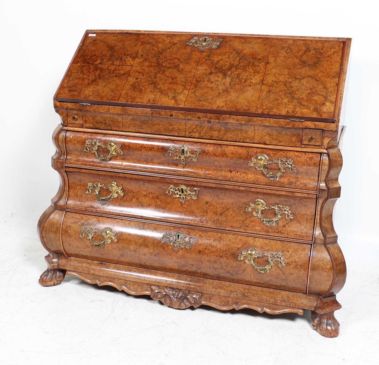 Antieke wortelnotenhouten dubbelgebogen secretaire, 18e eeuw, h.109 x b.132 x.d.66 cm.