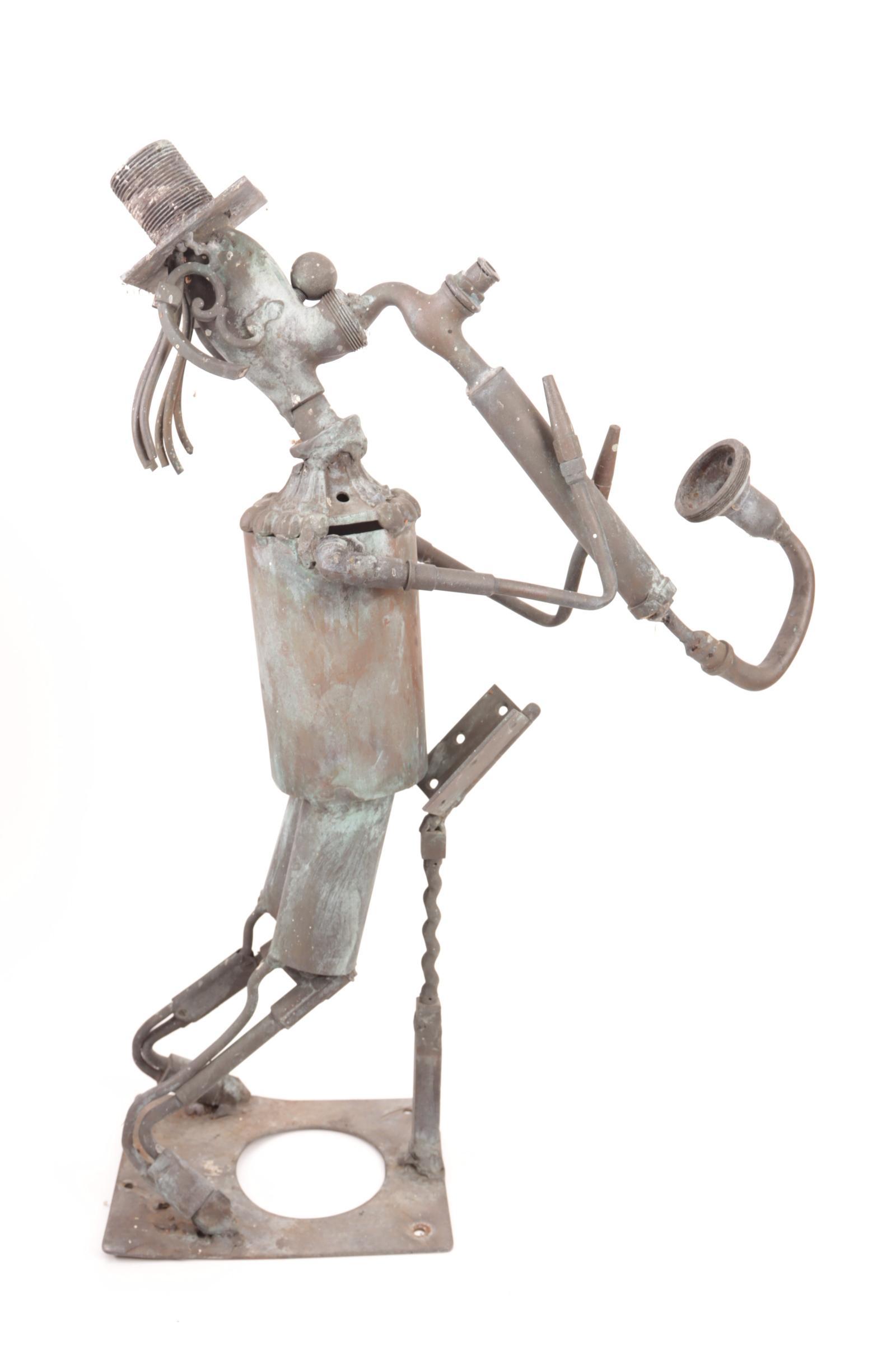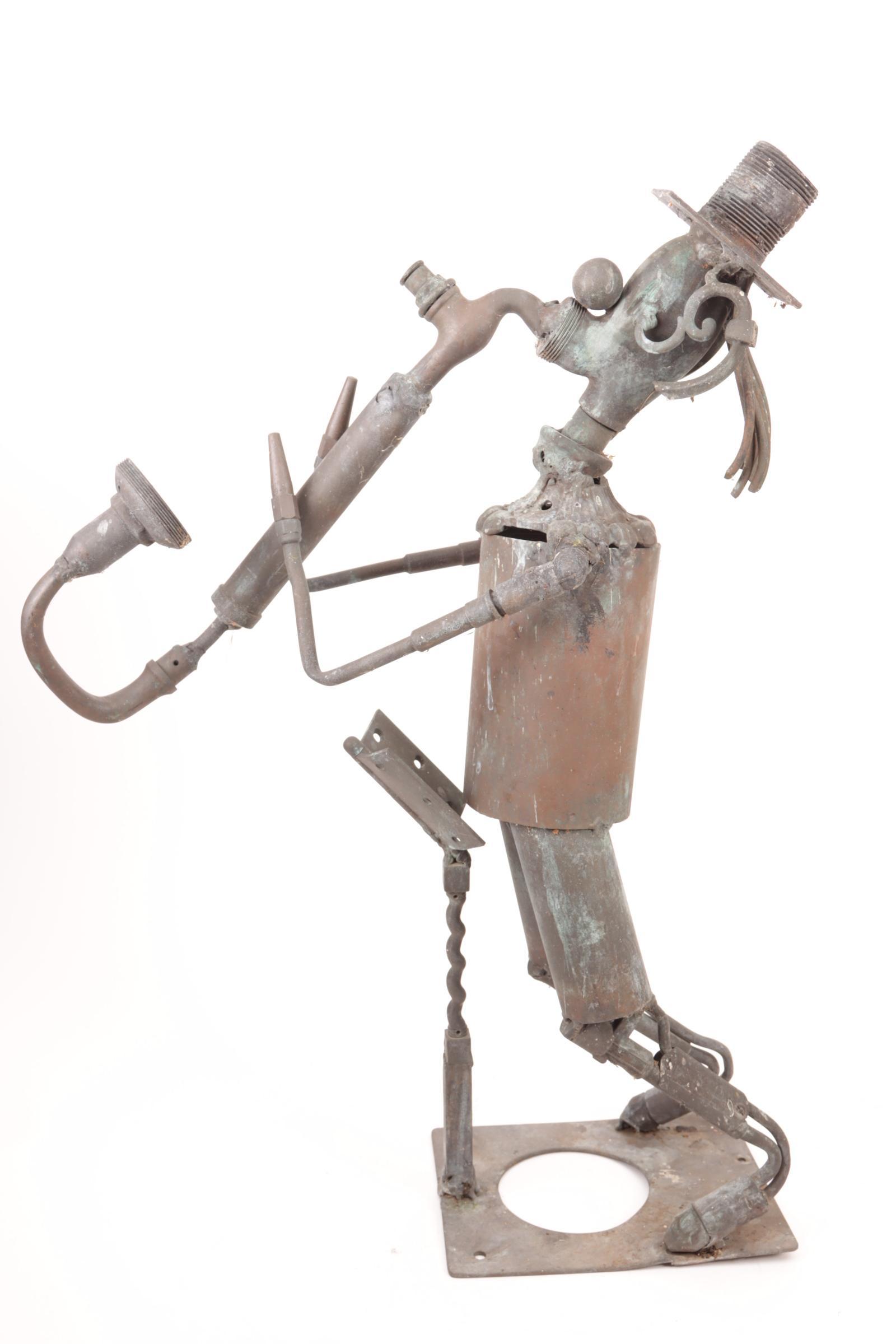 Recycle metalen sculptuur van man met saxofoon, h.73 cm.