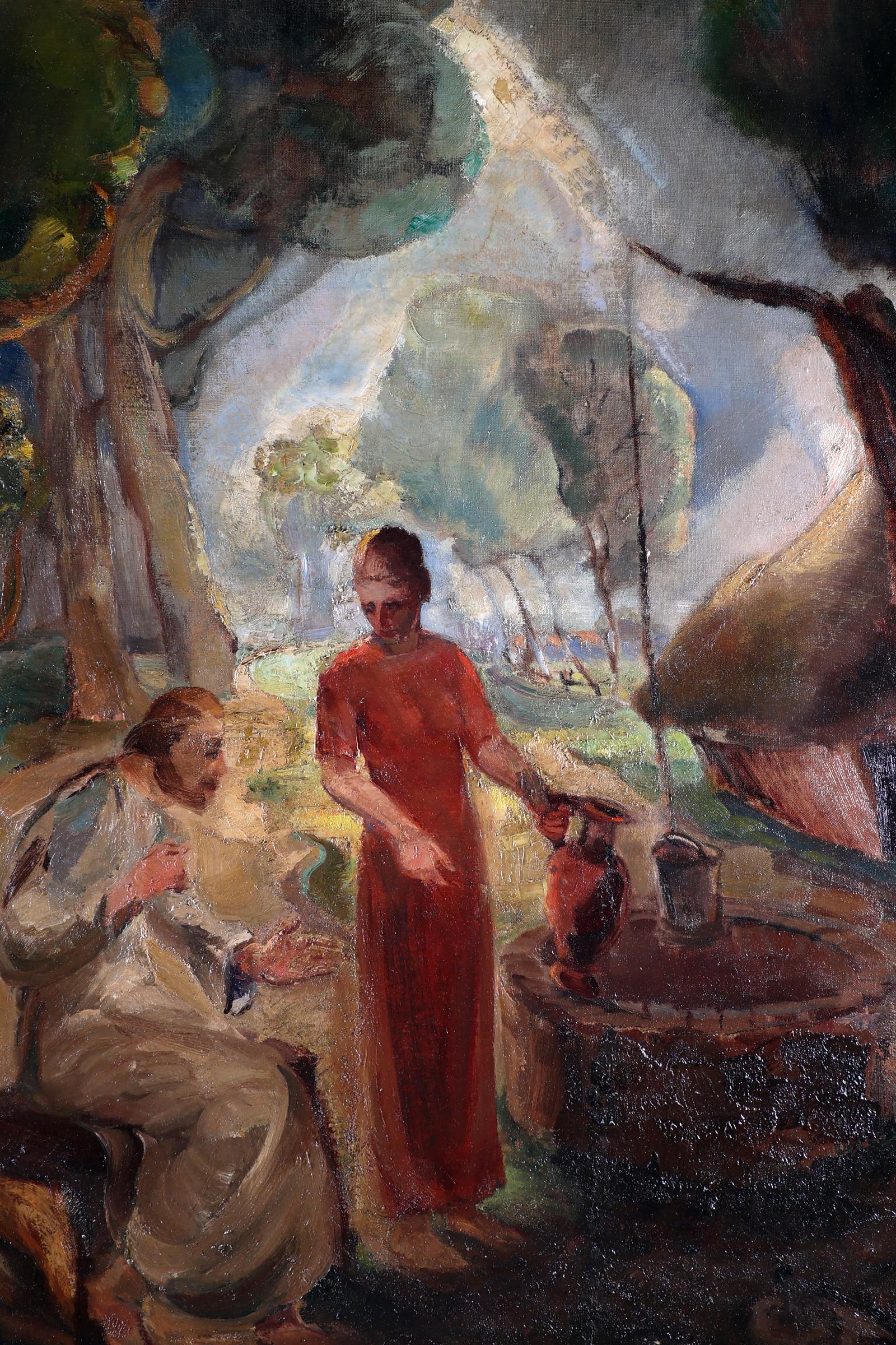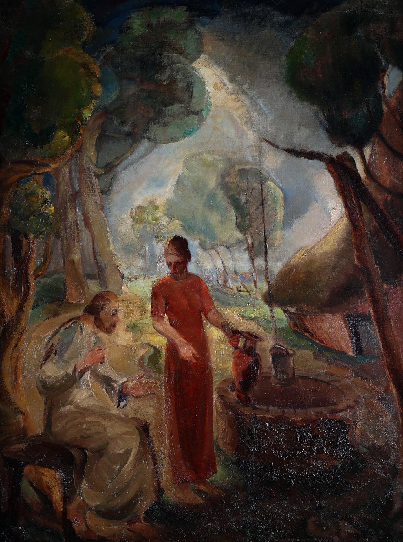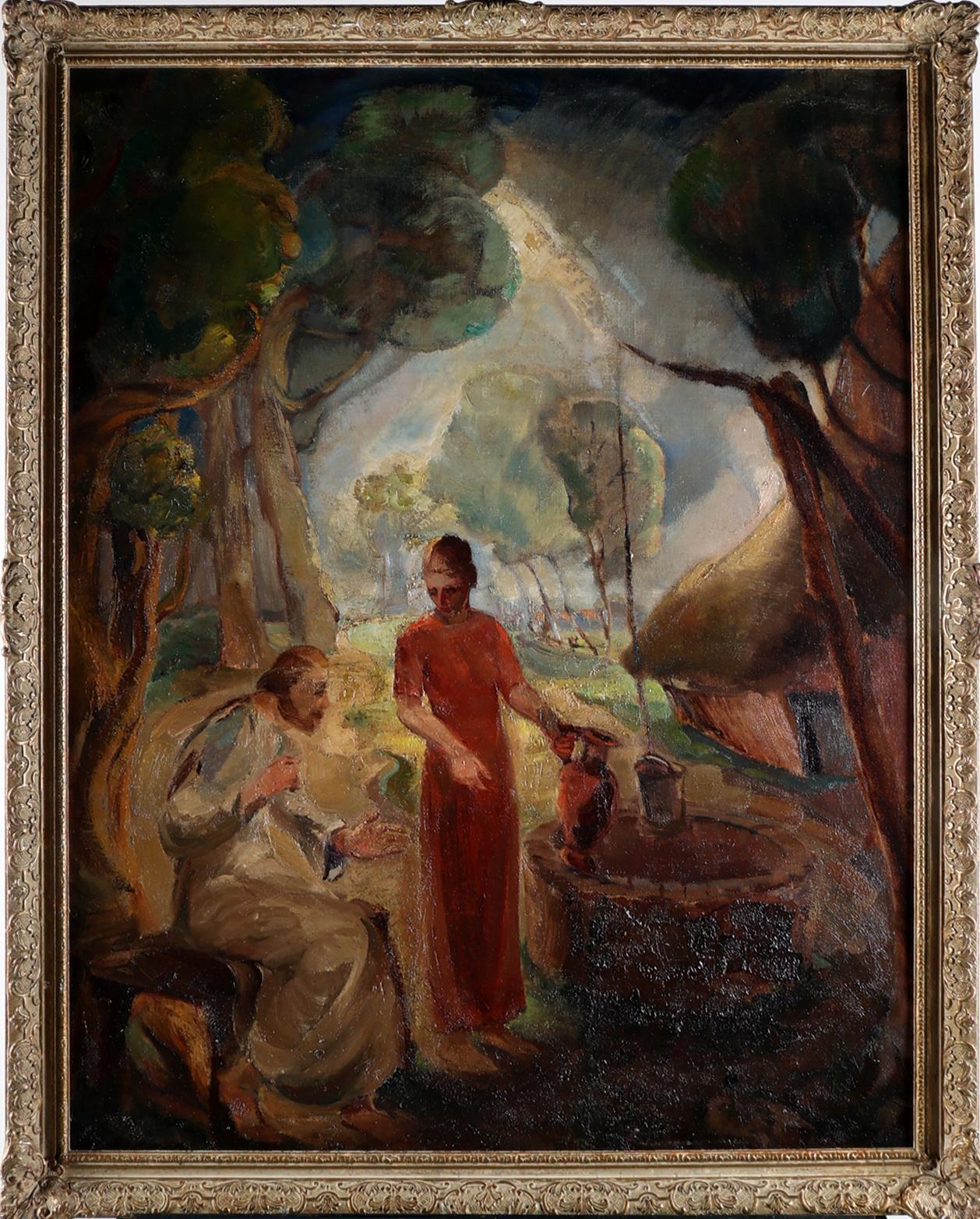 Toegeschreven aan Piet van Wijngaerdt (1873-1964), Religieuze voorstelling van Jezus en de Samaritaanse vrouw bij de waterput, maroelfe, 68 x 80 cm.