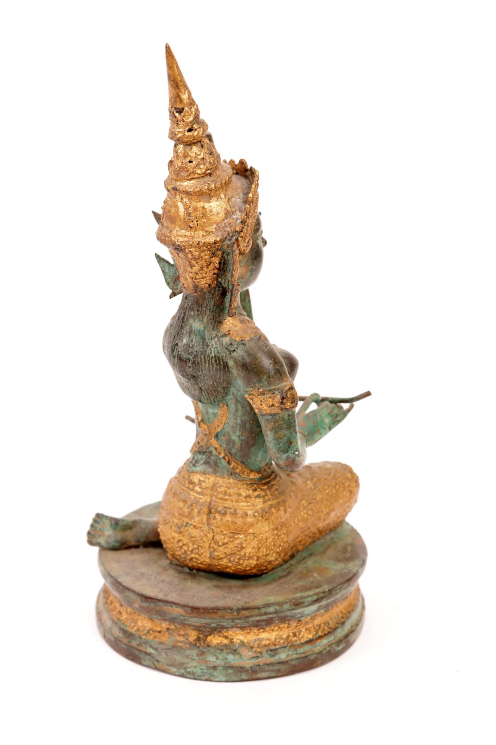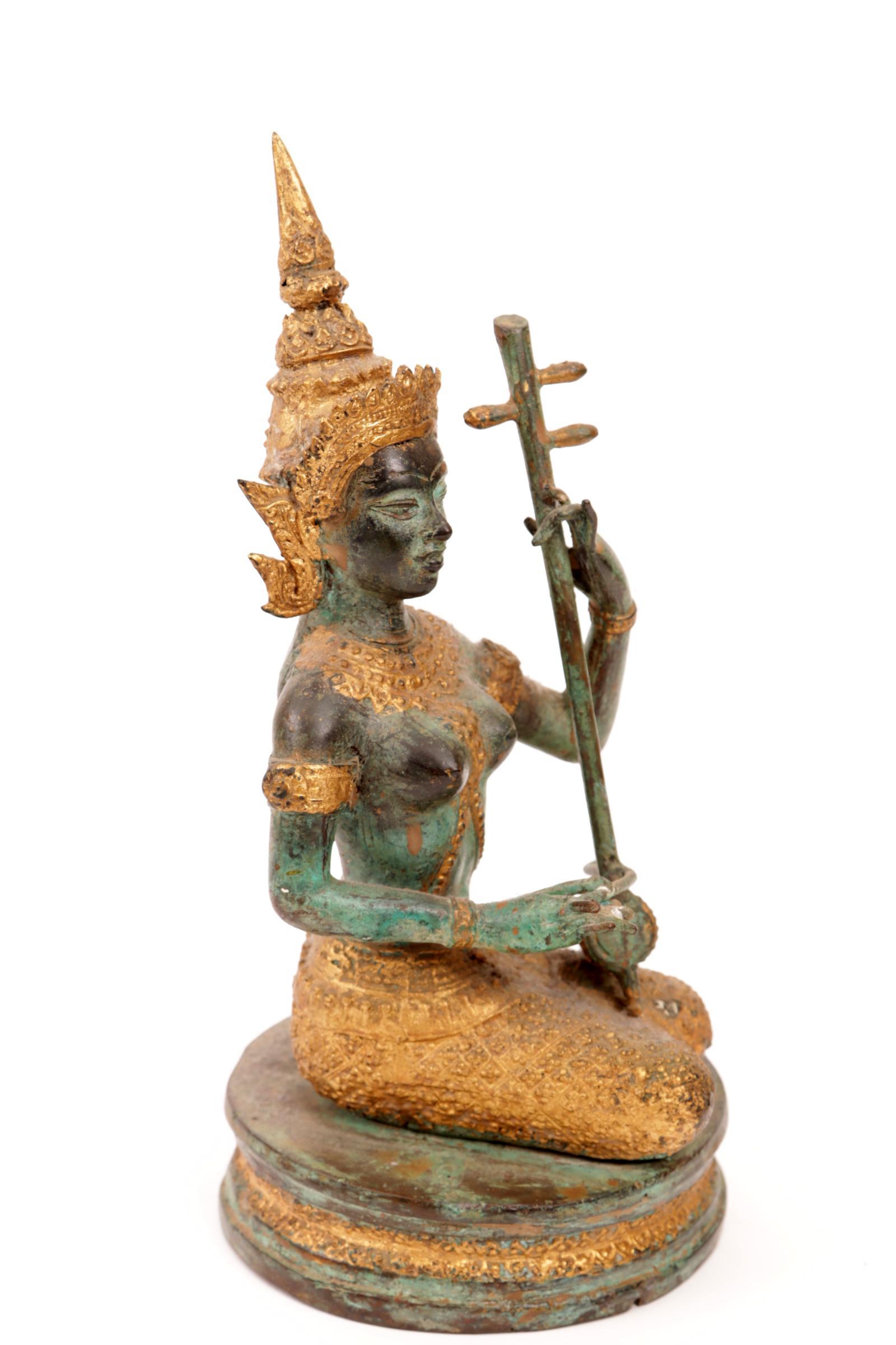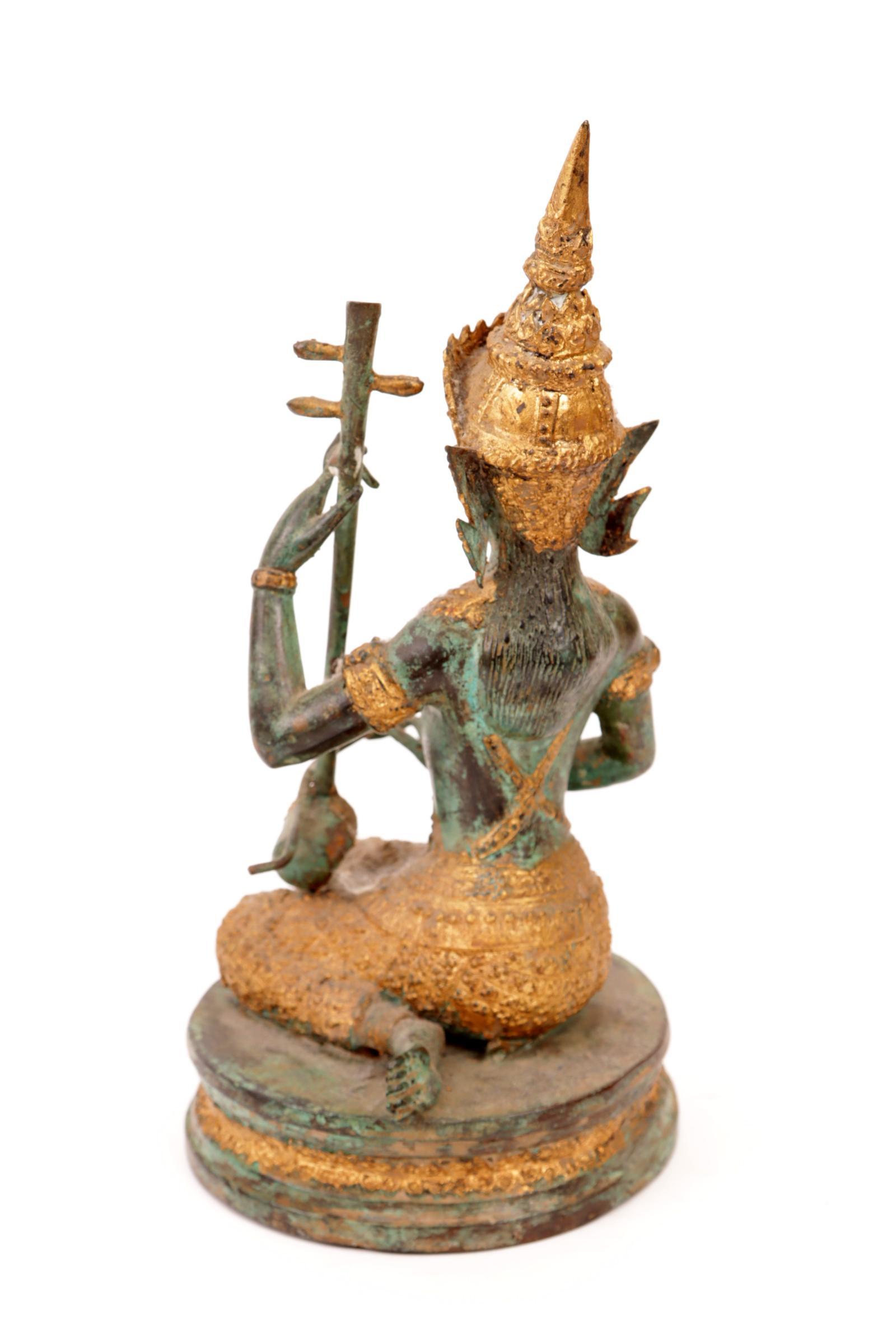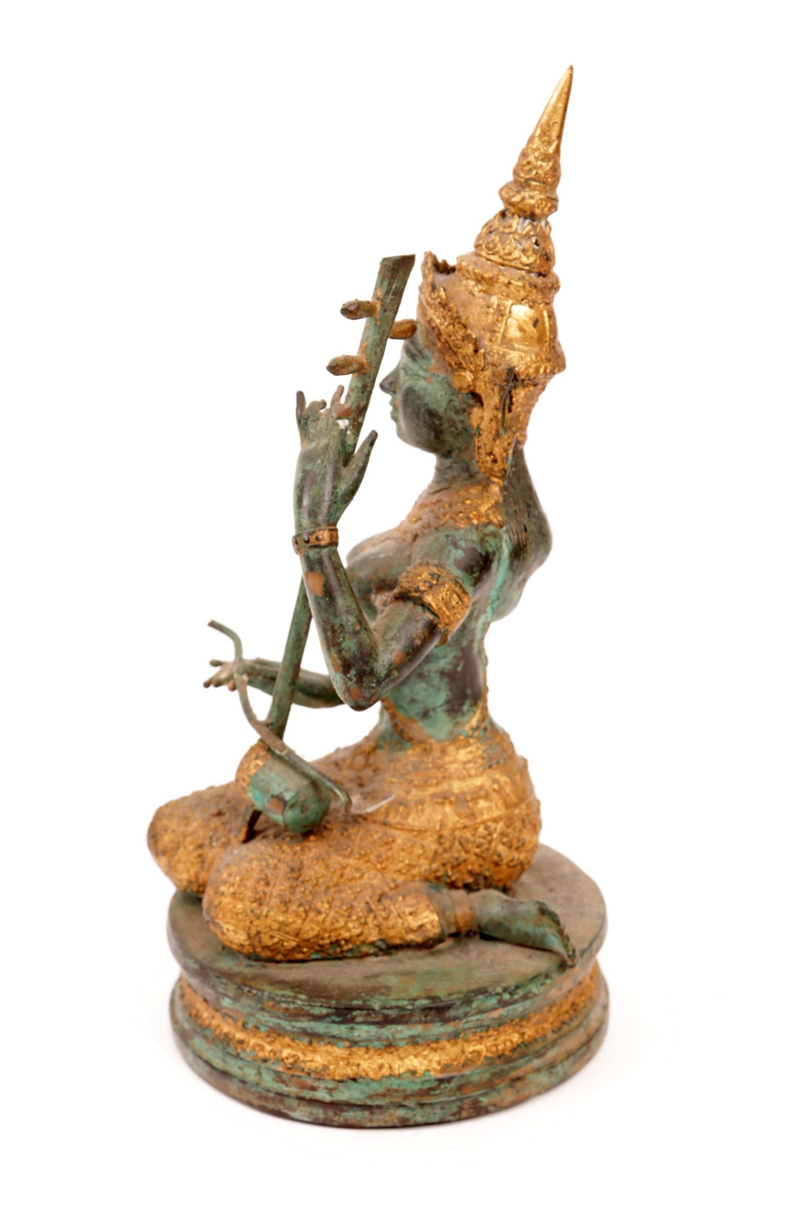 Groen gepatineerd en deels verguld bronzen beeld van een Thaise muzikant, h.25 cm.