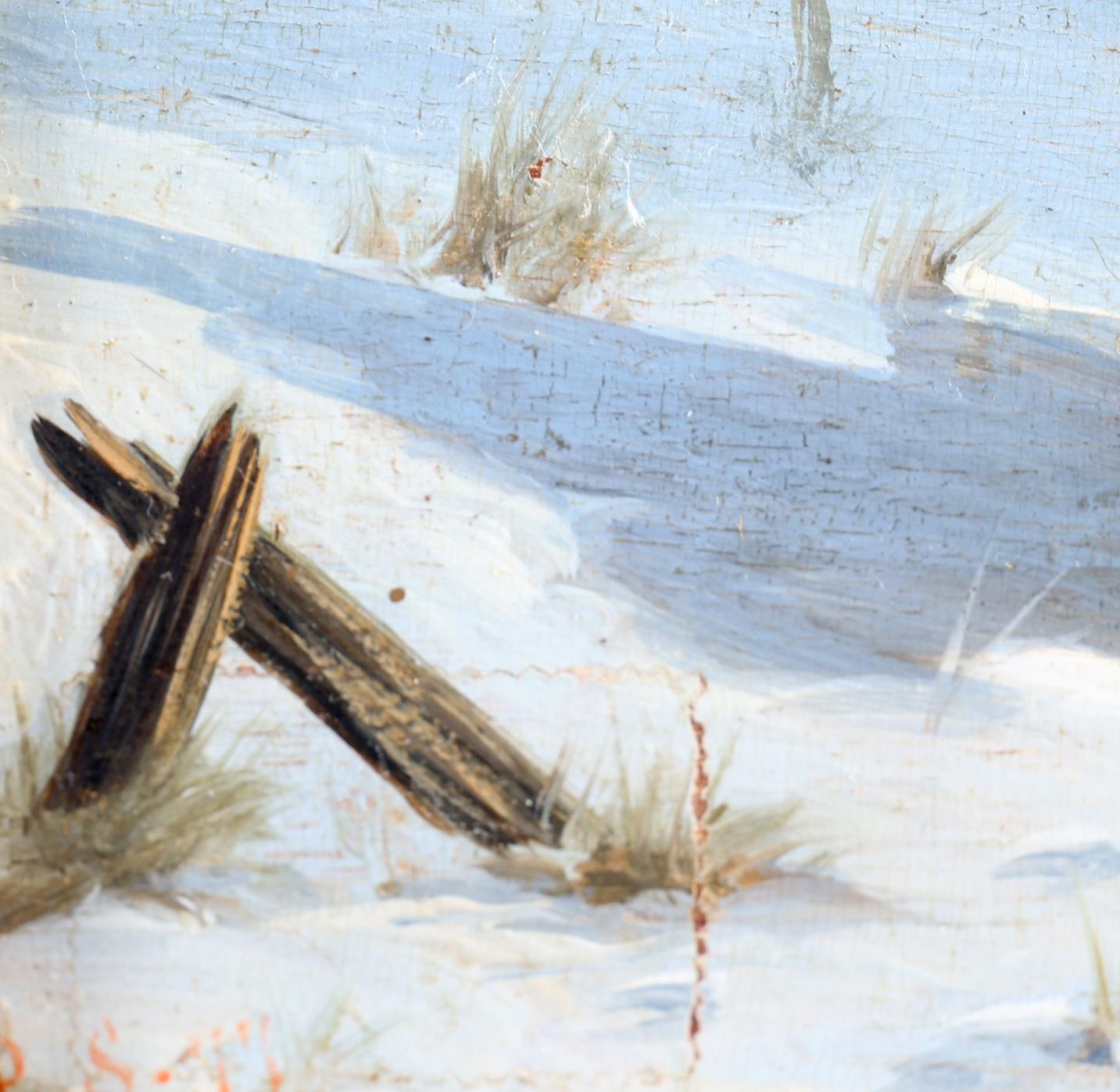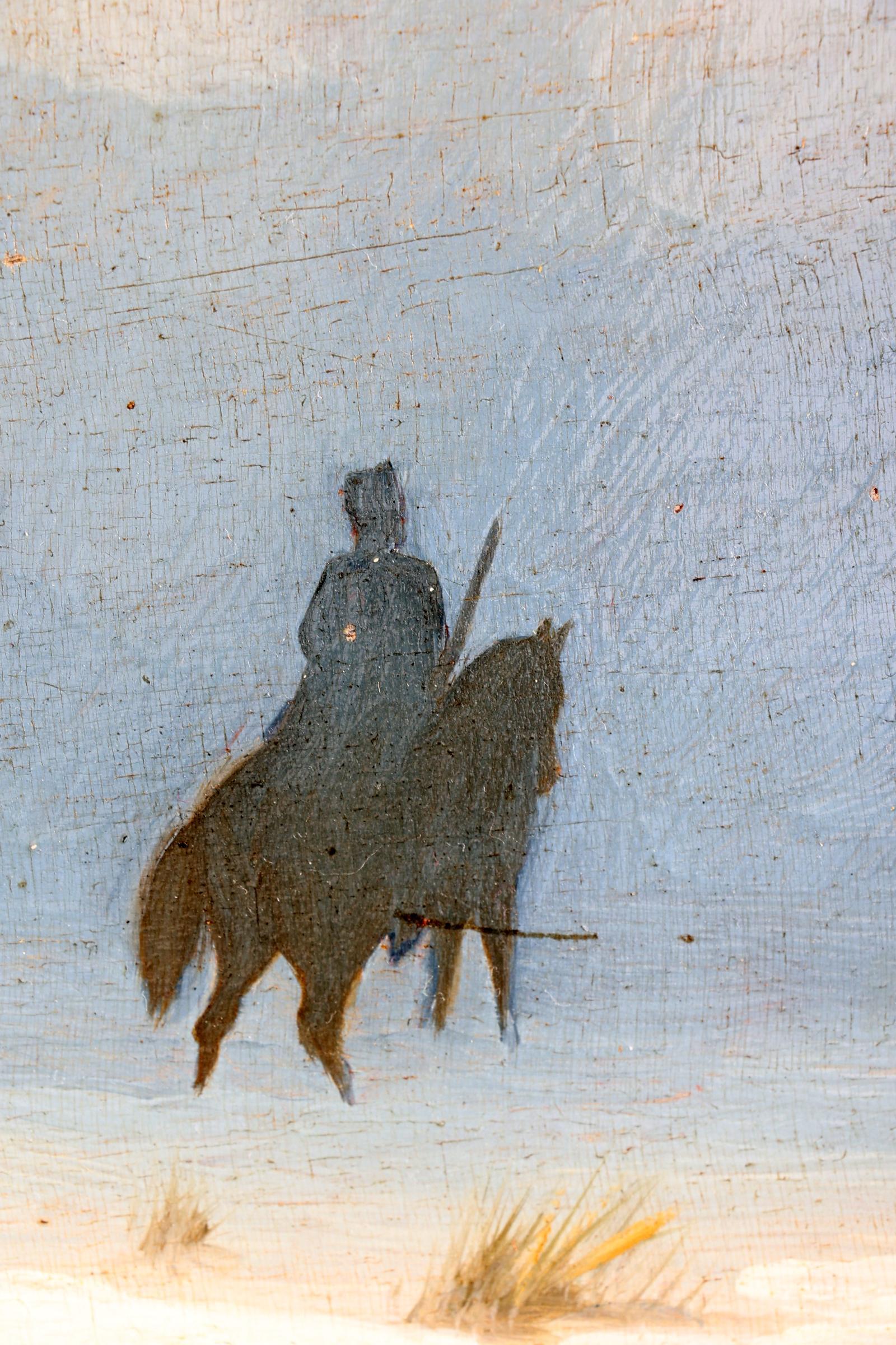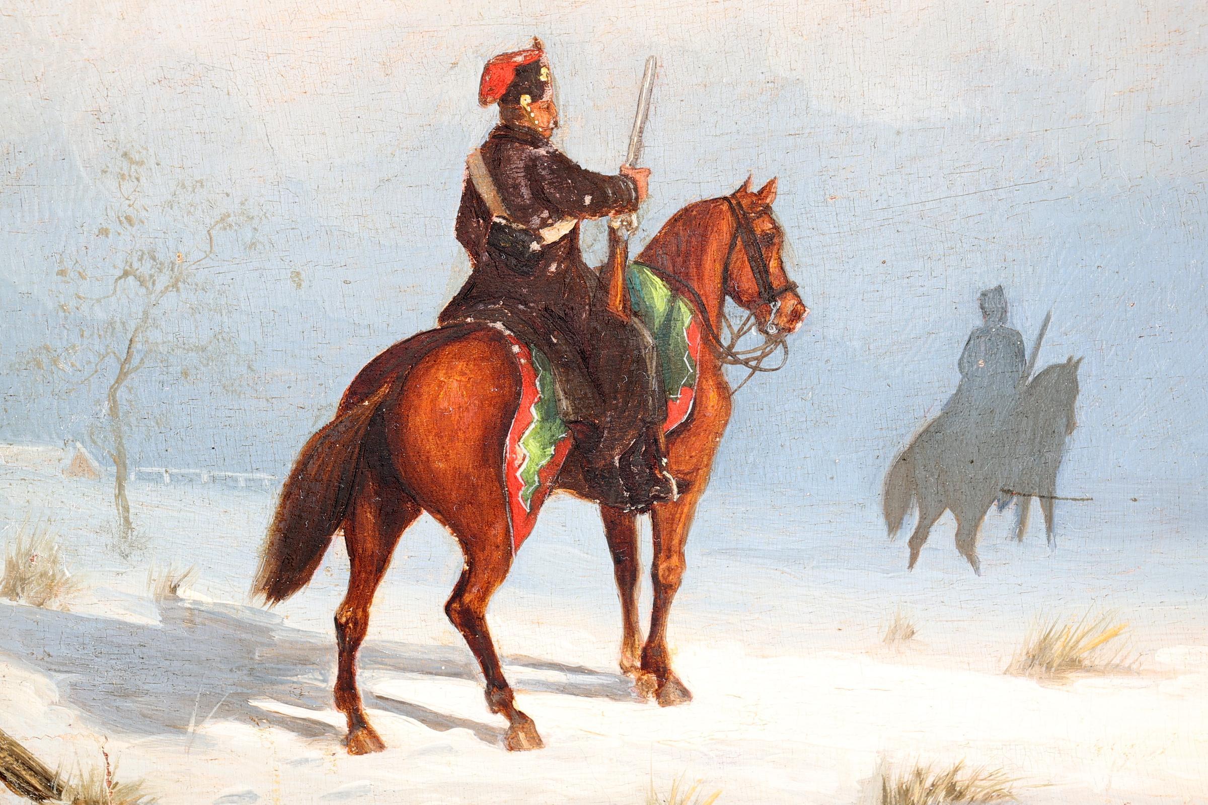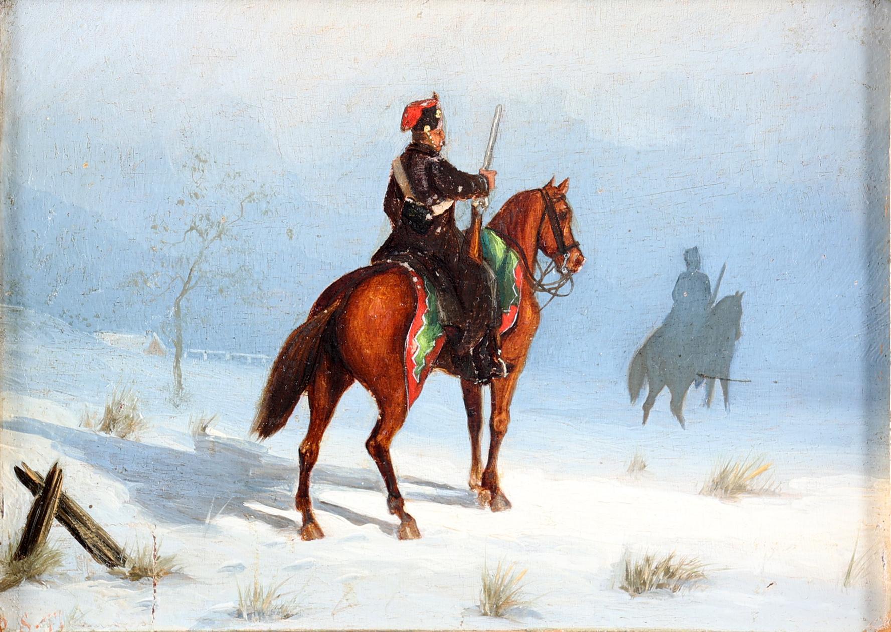 Toegeschreven aan Piet Schipperus (1840-1929), Cavaleristen in de winter, olieverf op paneel, 20 x 26 cm., monogram r.o.P.S.’77