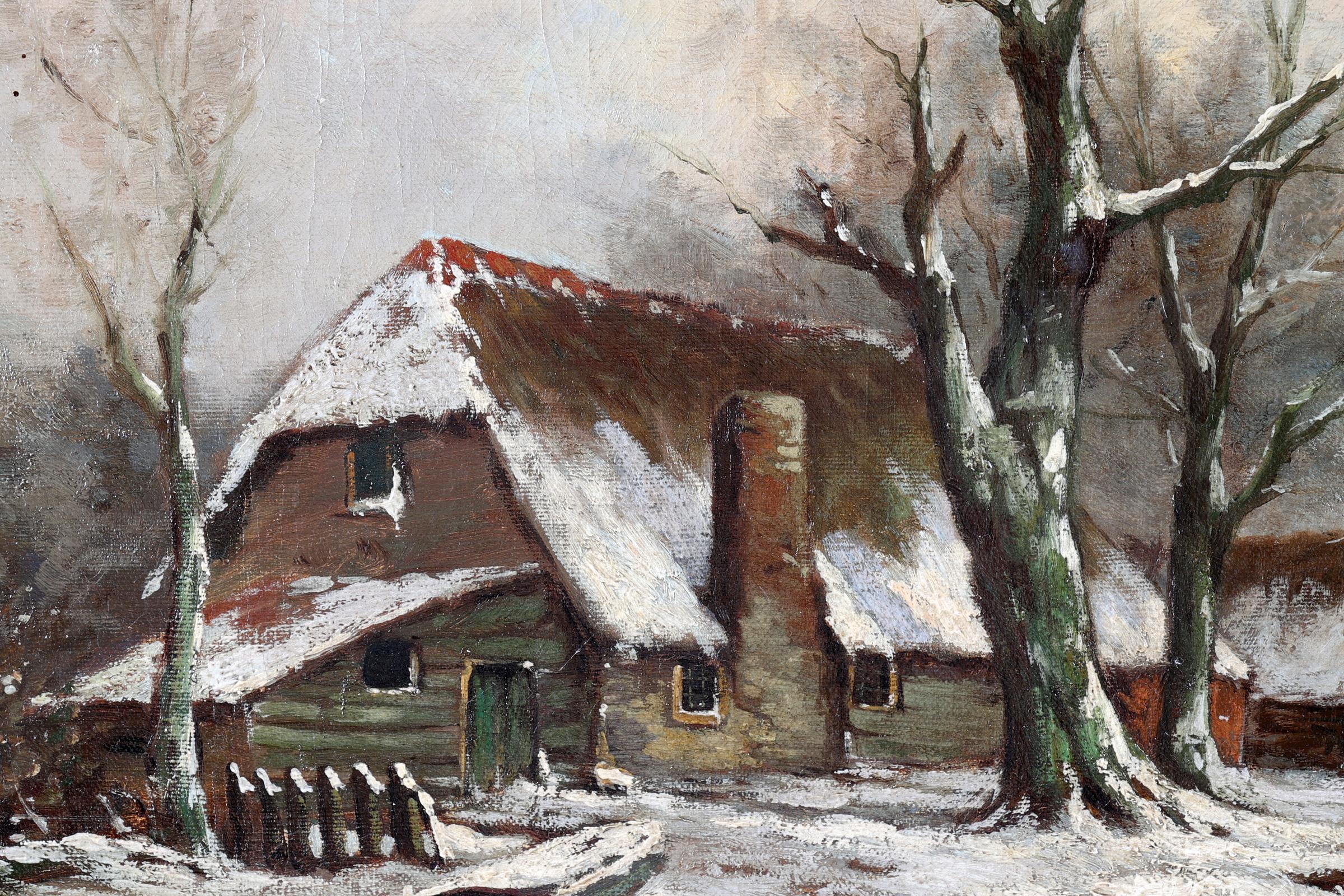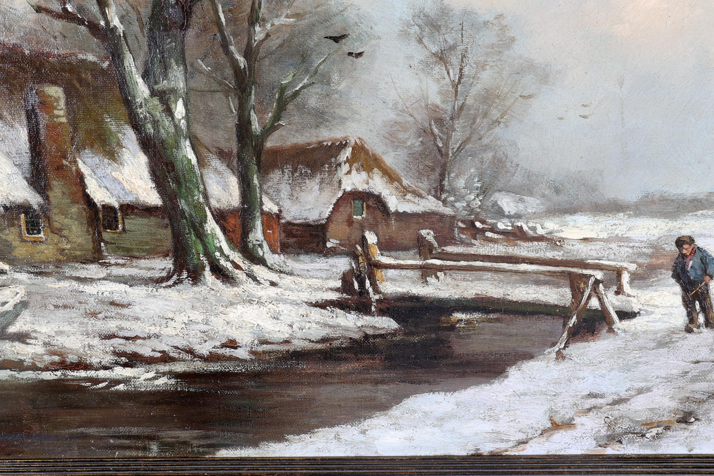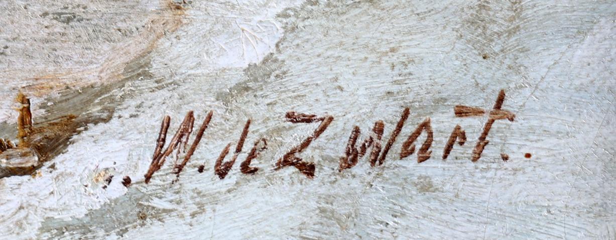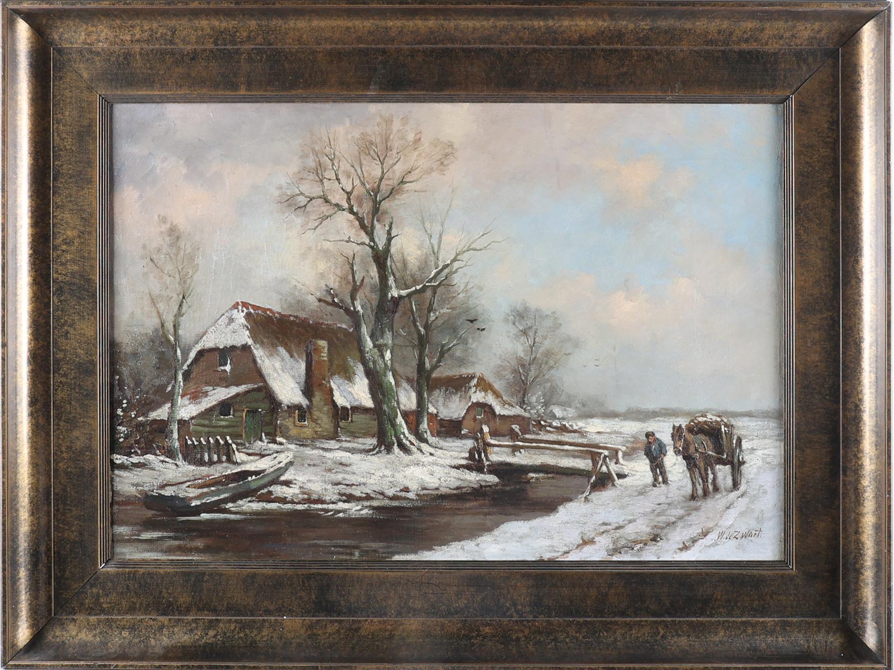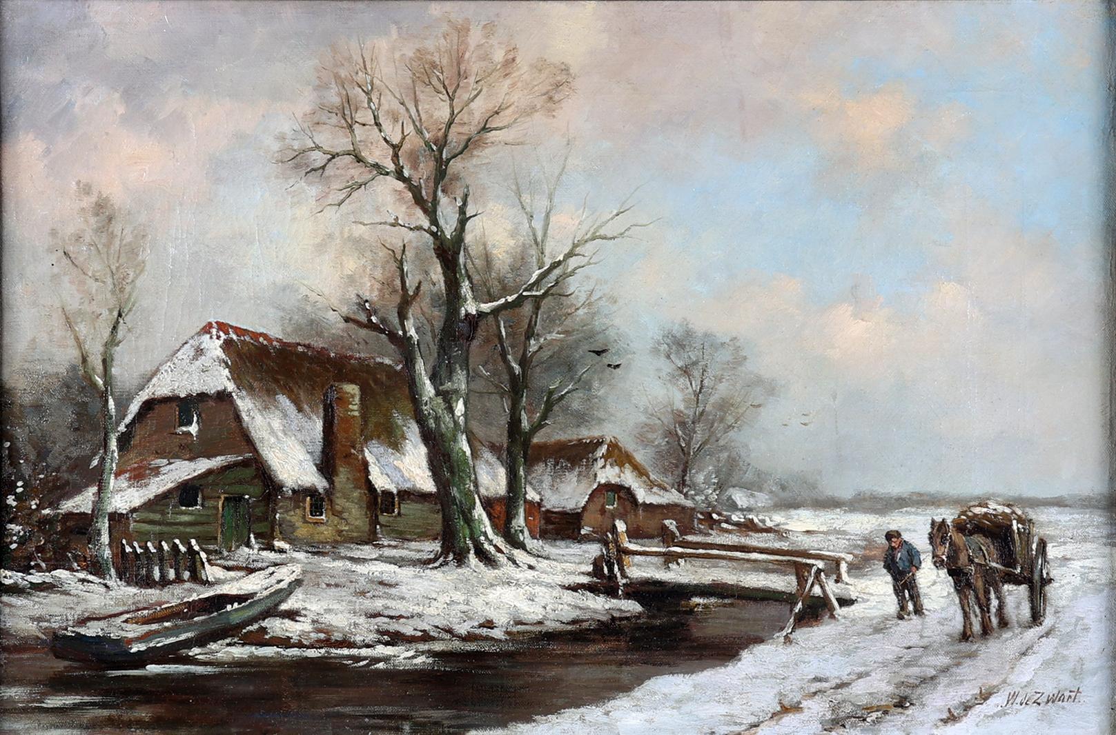 Draagt de signatuur van W. de Zwart, Winterlandschap met paard en wagen, olieverf op doek, 40 × 60 cm.