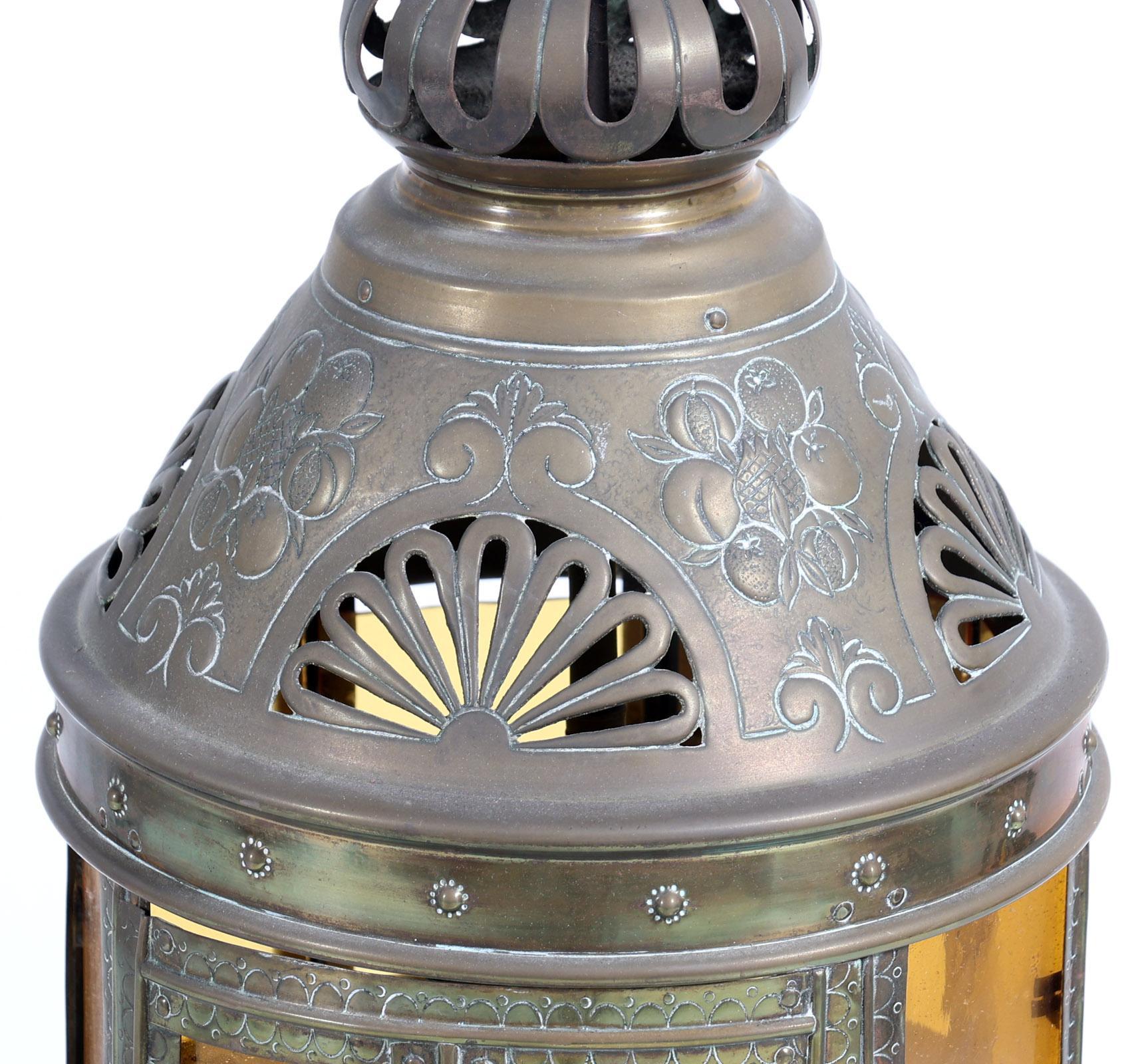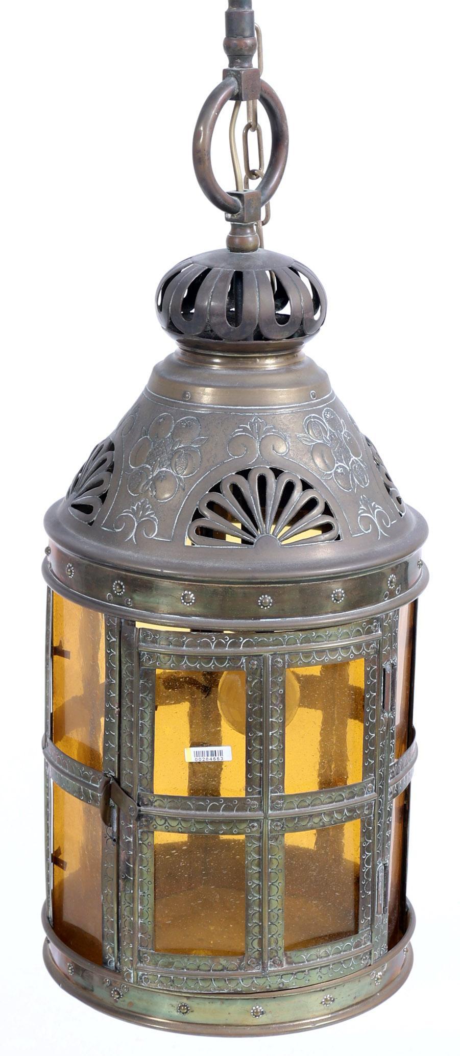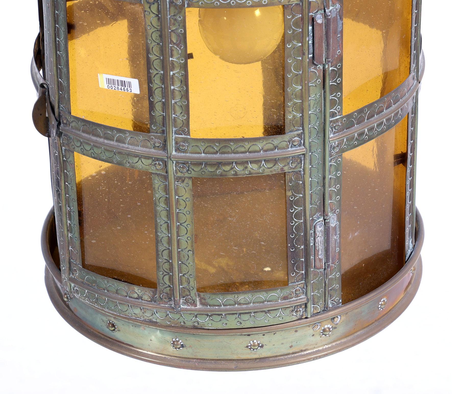Antieke koperen hallantaarn, ca. h.120 cm.