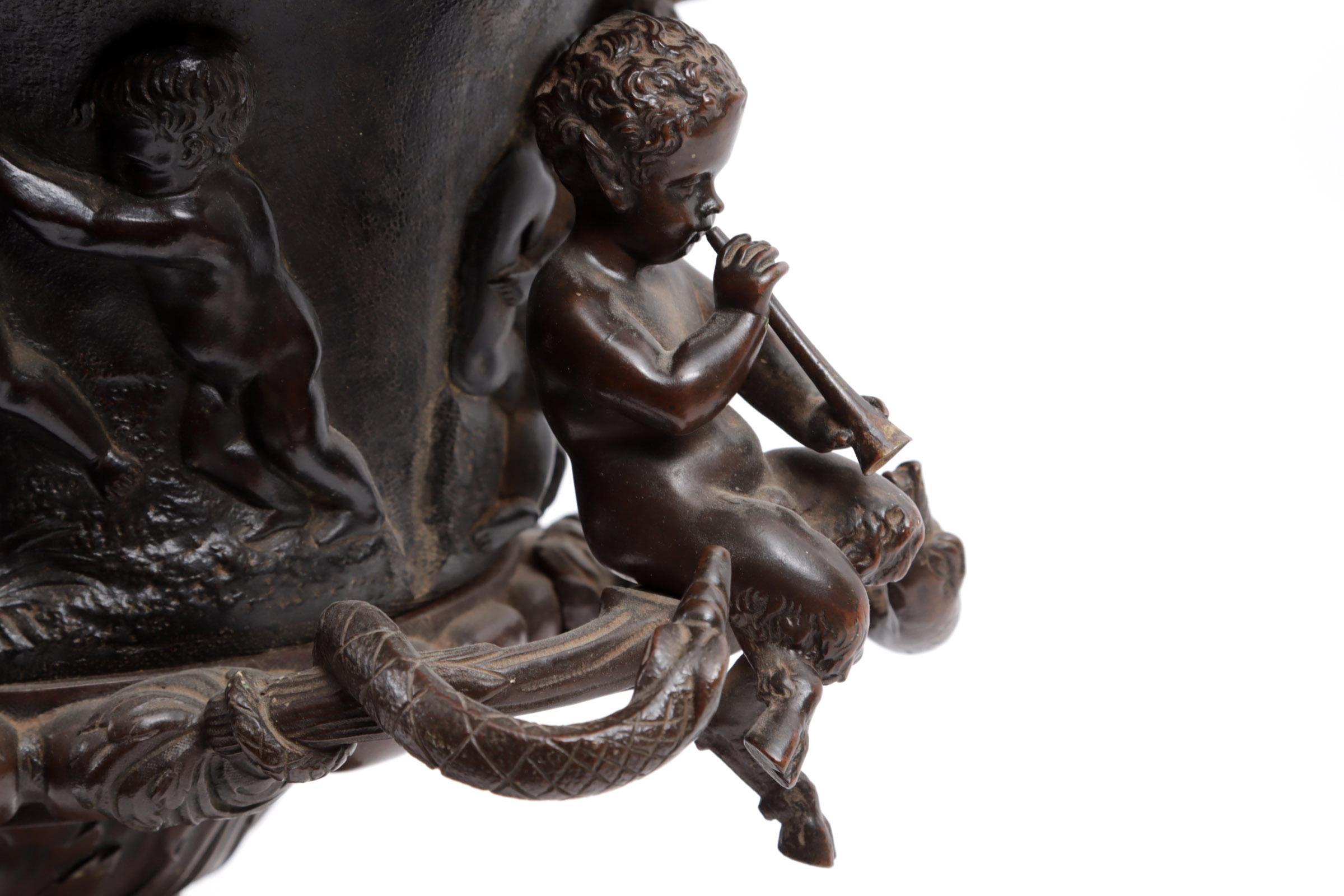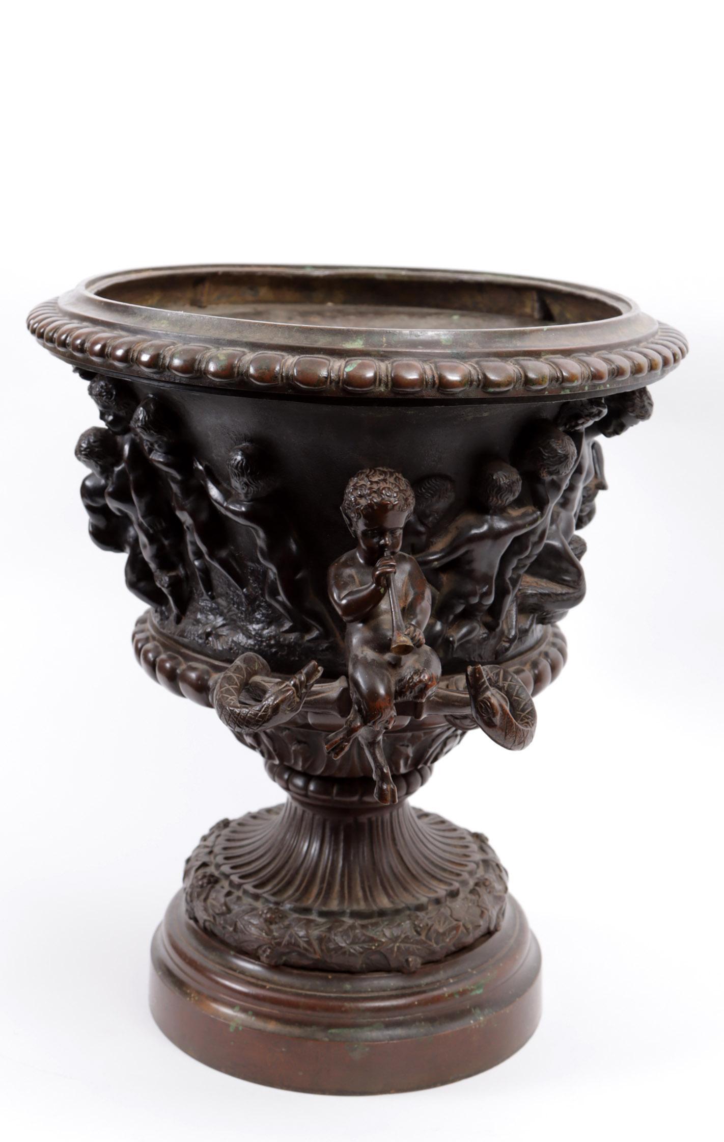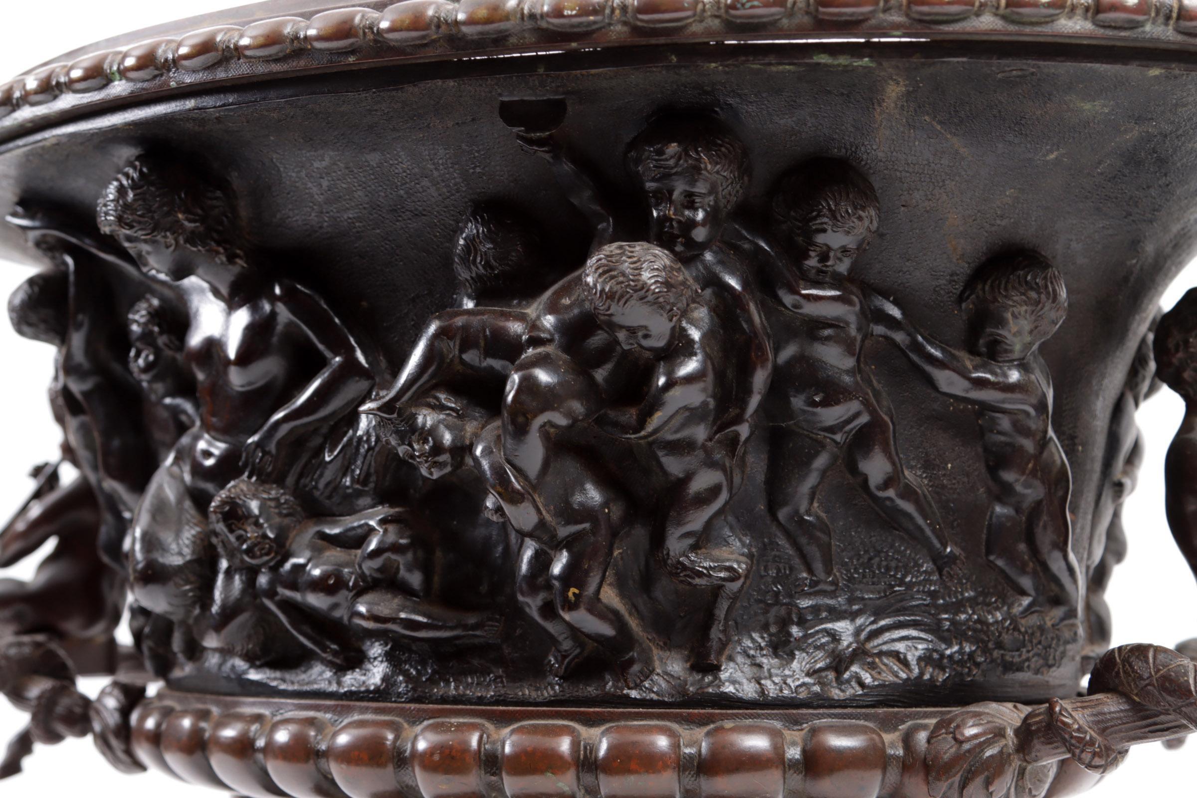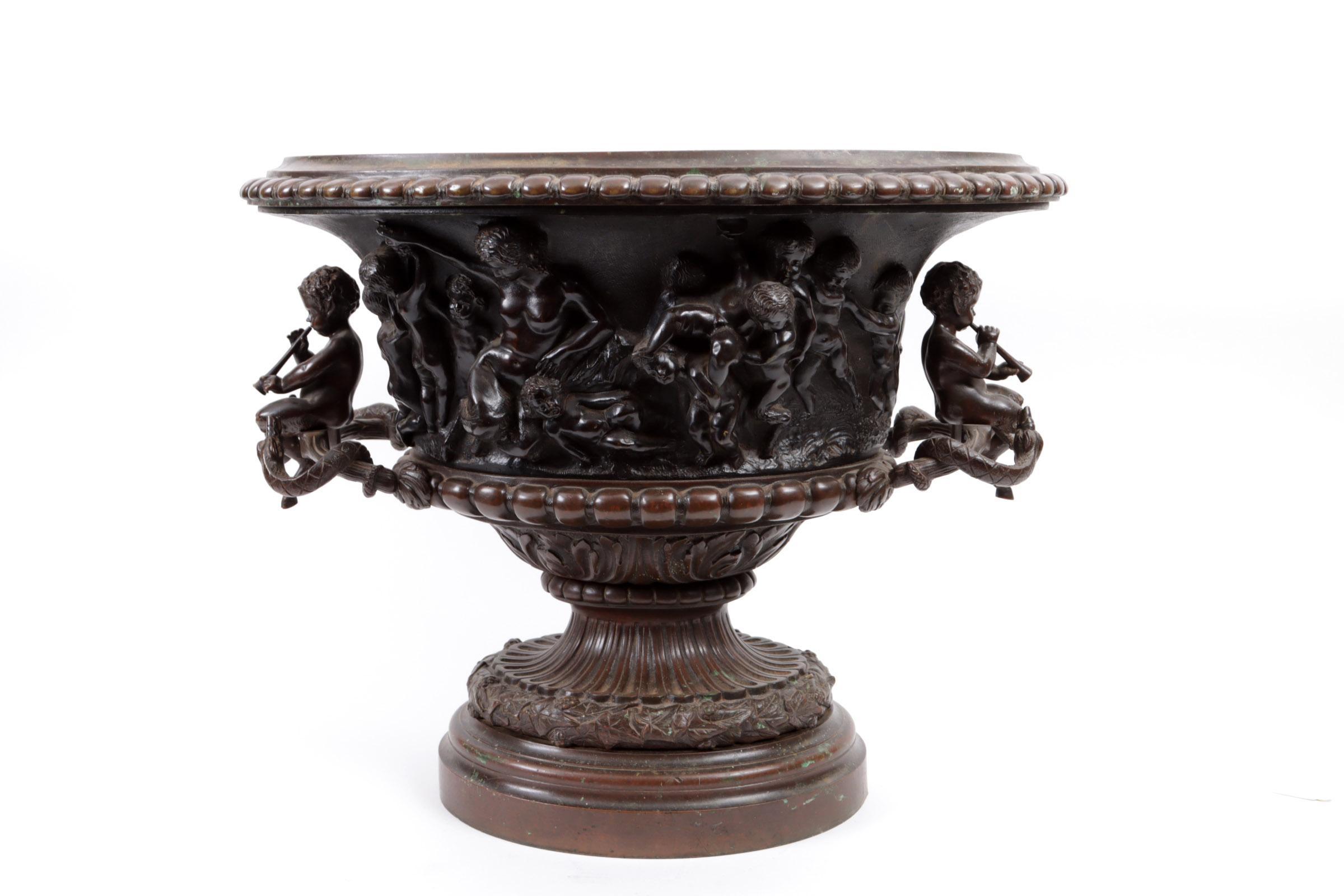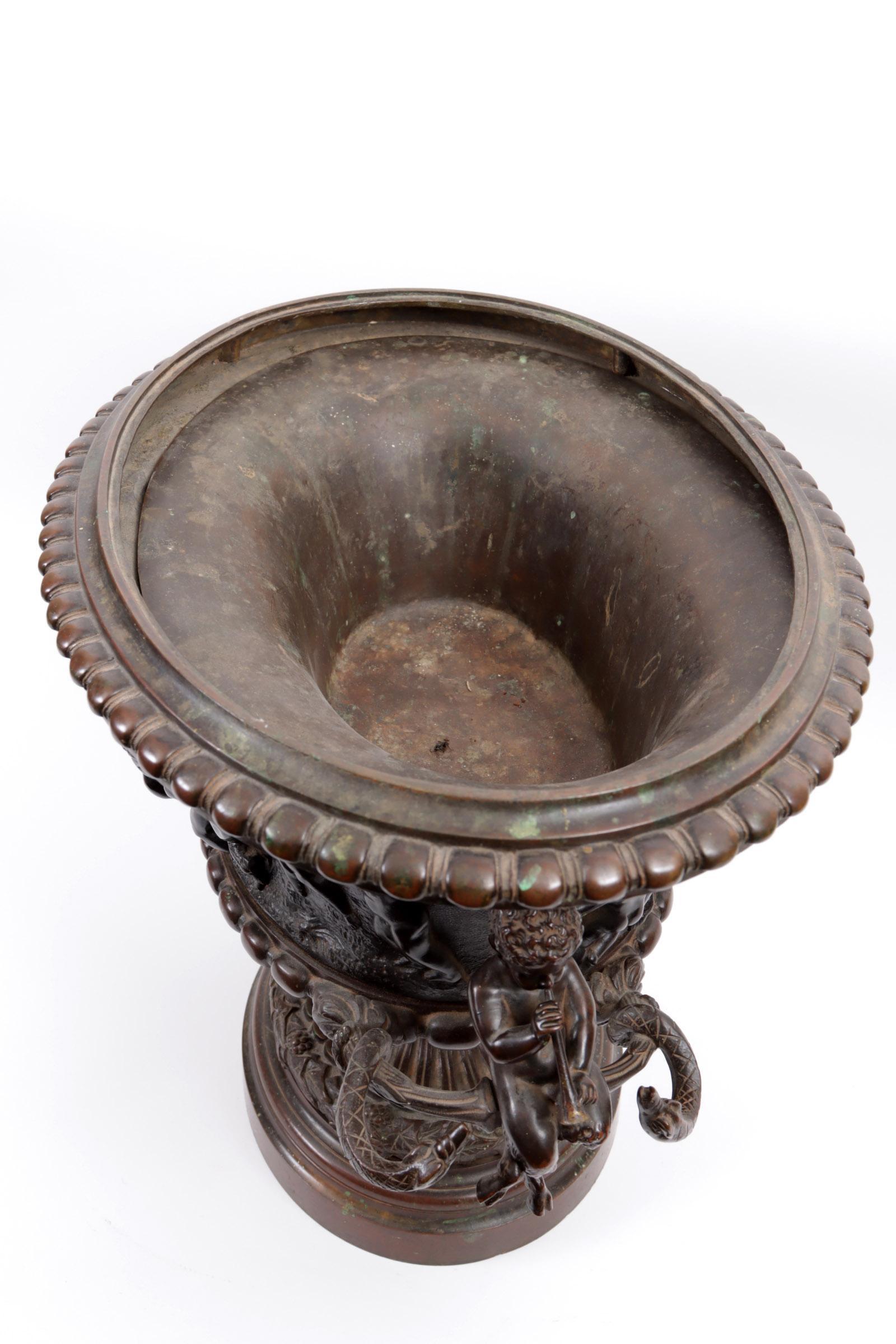 Antieke bronzen jardinière met klassieke decoraties van kindjes en handvatten geflankeerd door twee panfiguren met slangen en met metalen binnenbak, h.37 x b.46 x d.34 cm.