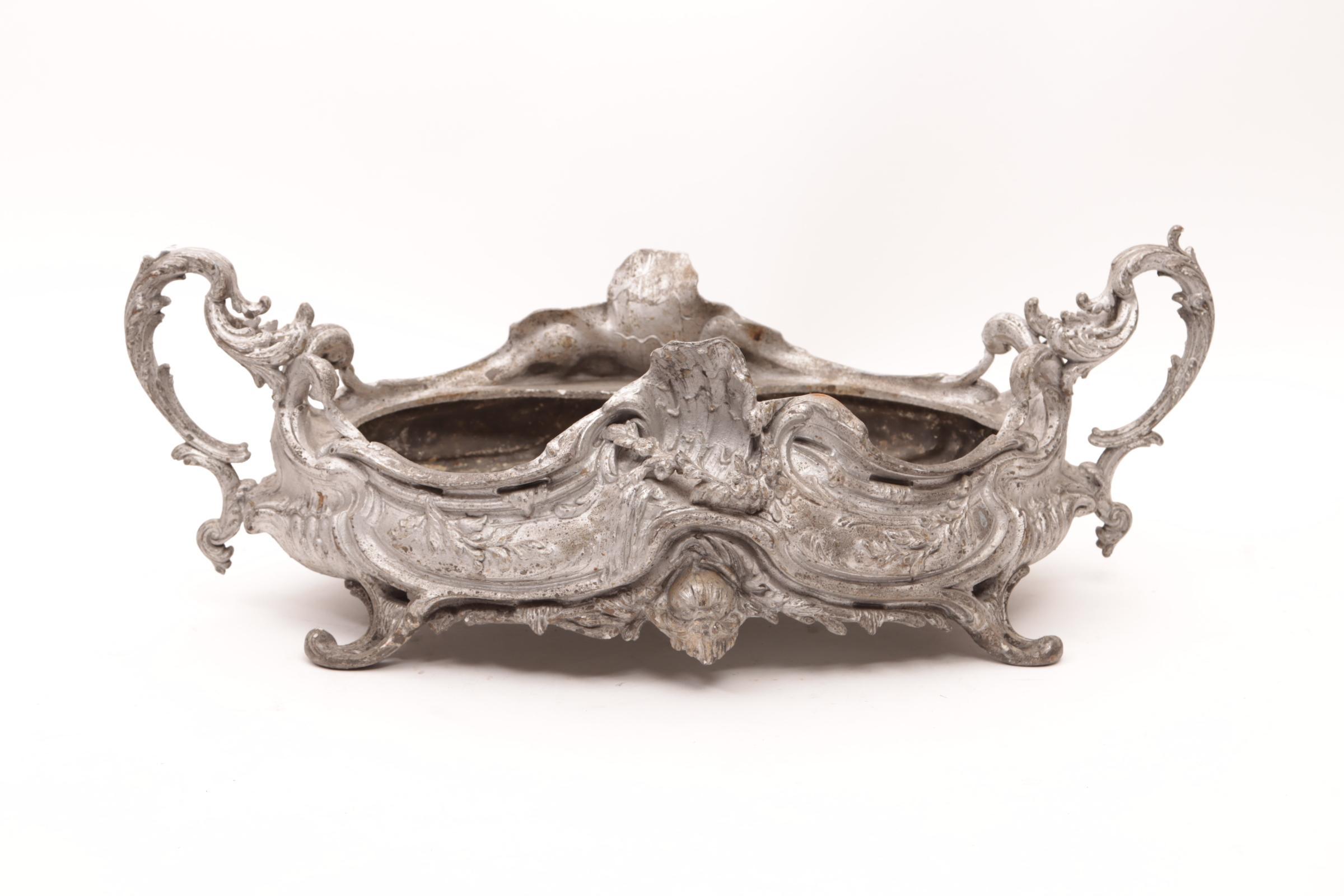 Metalen zilverekleurig Jugendstil jardinière, h.18 x b.52 x d.23 cm.
