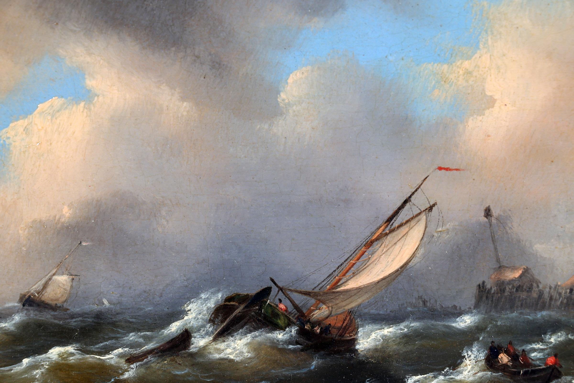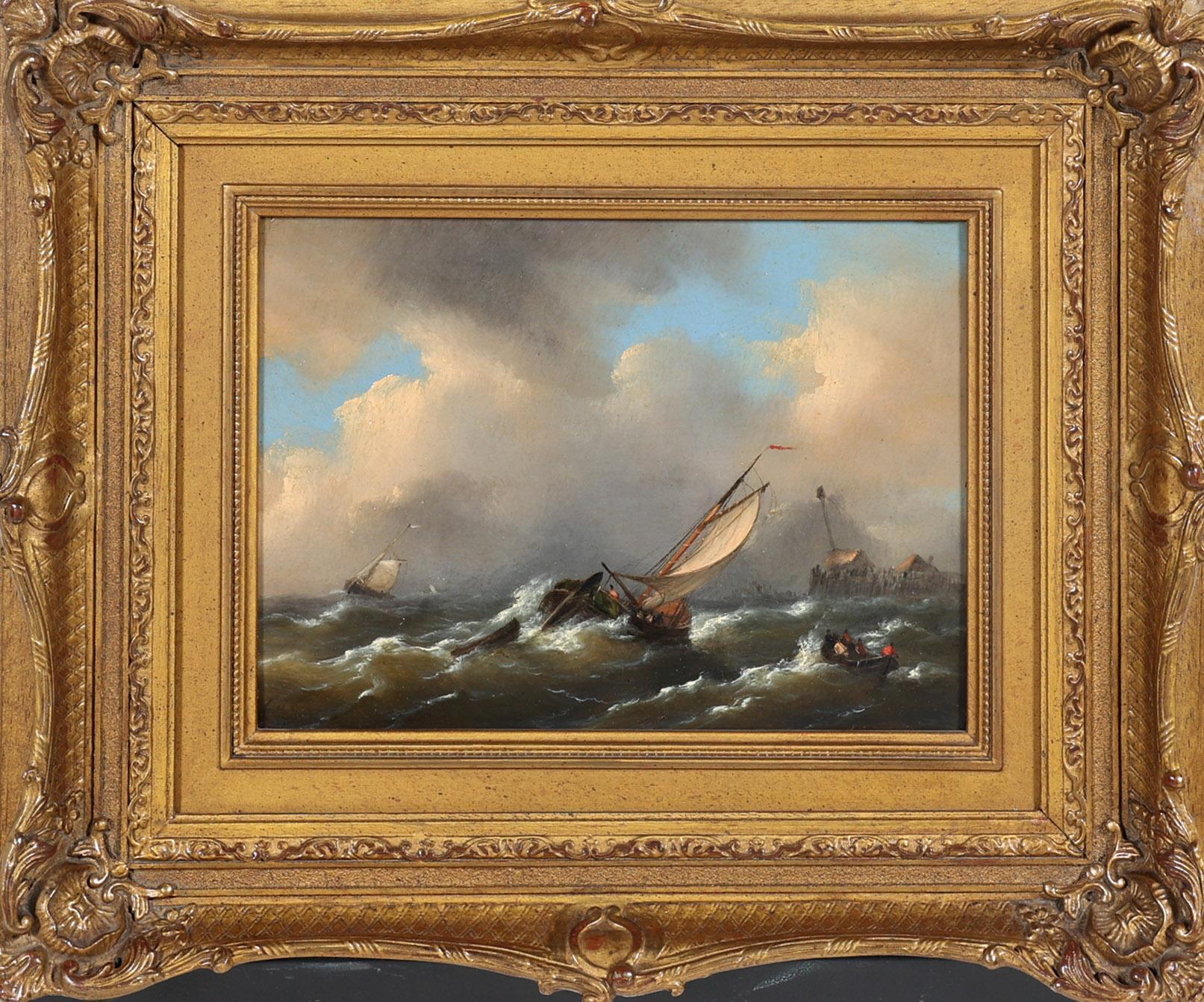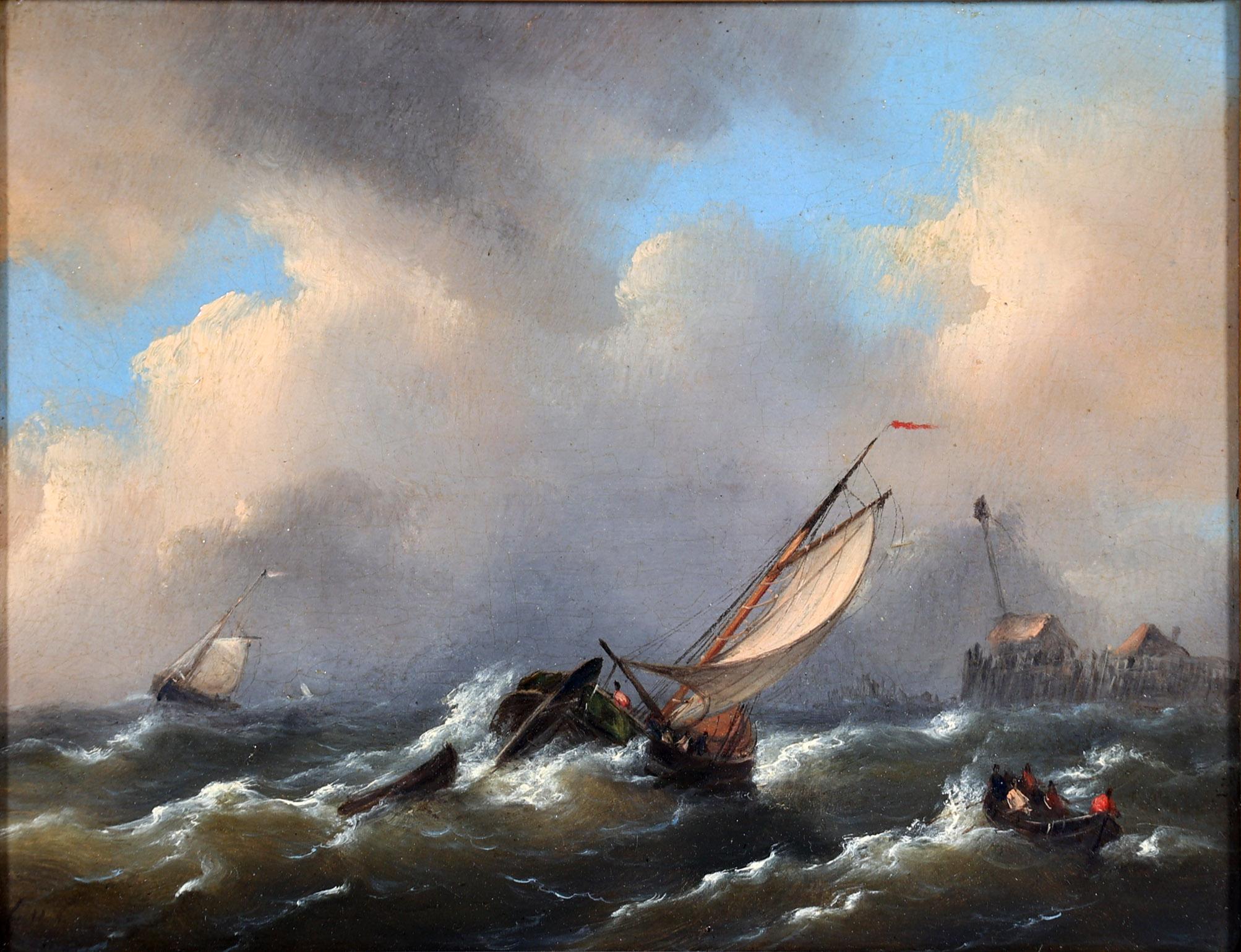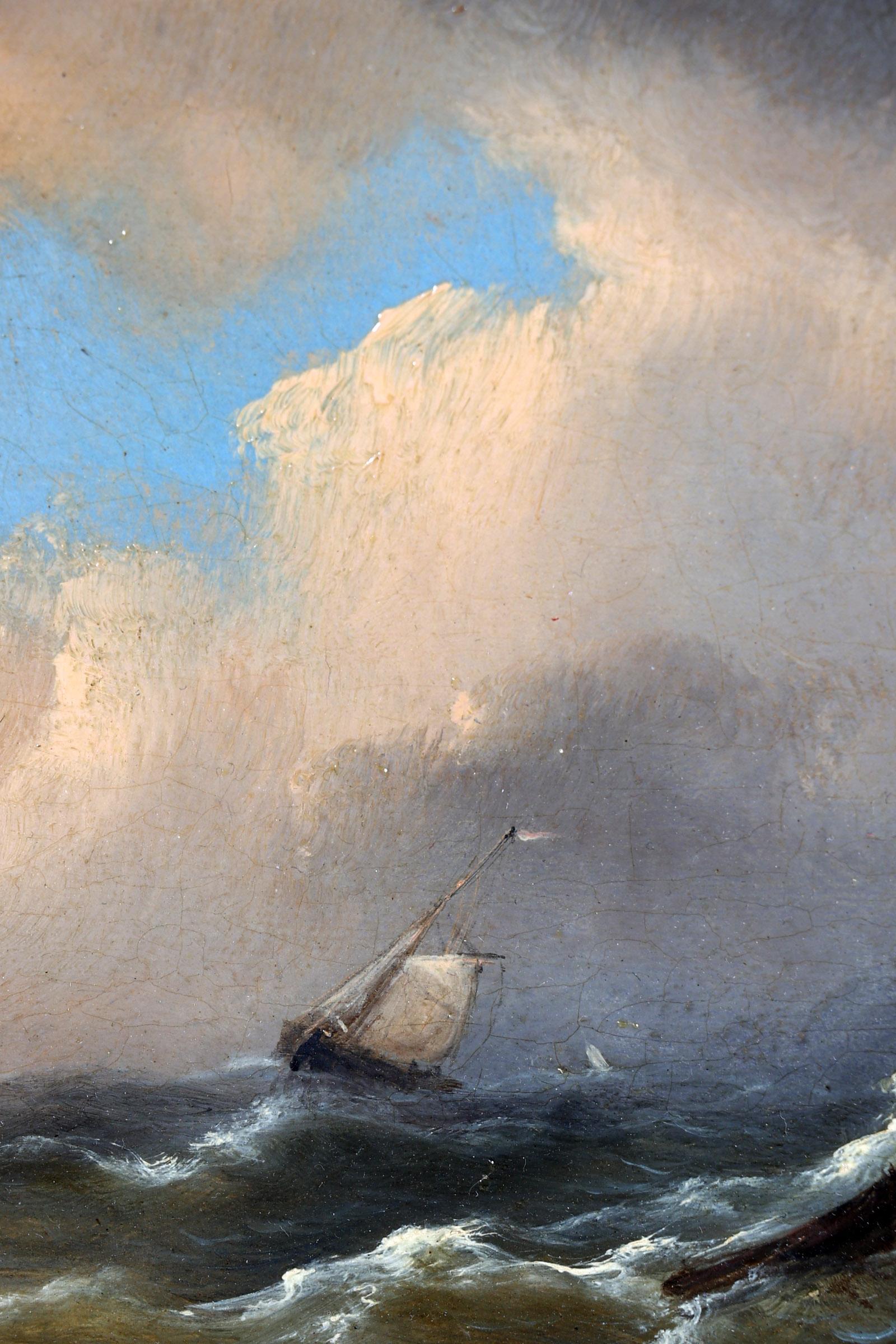 Monogram G. van E. (Govert van Emmerik (1808-1882)), Zeilschepen op de wilde zee voor de kust, olieverf op paneel, 25 x 18 cm., provenance particuliere collectie Nederland