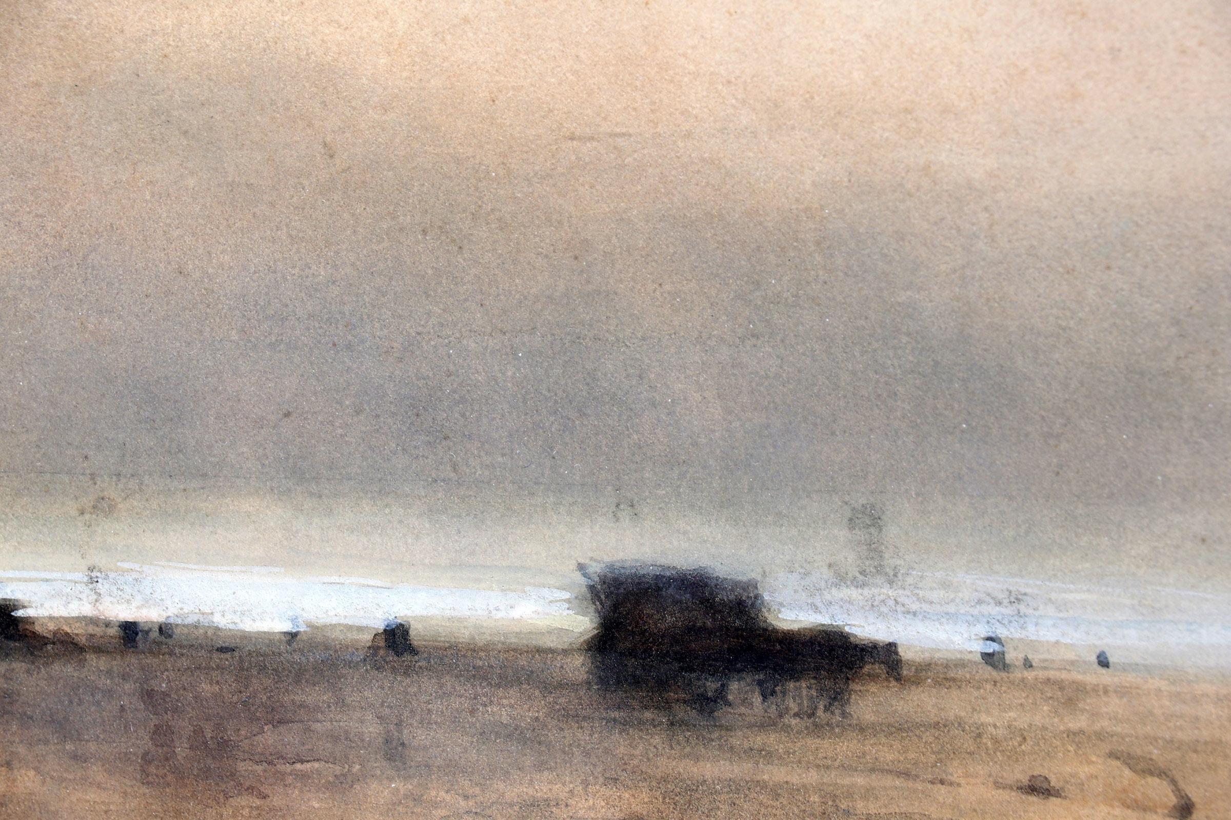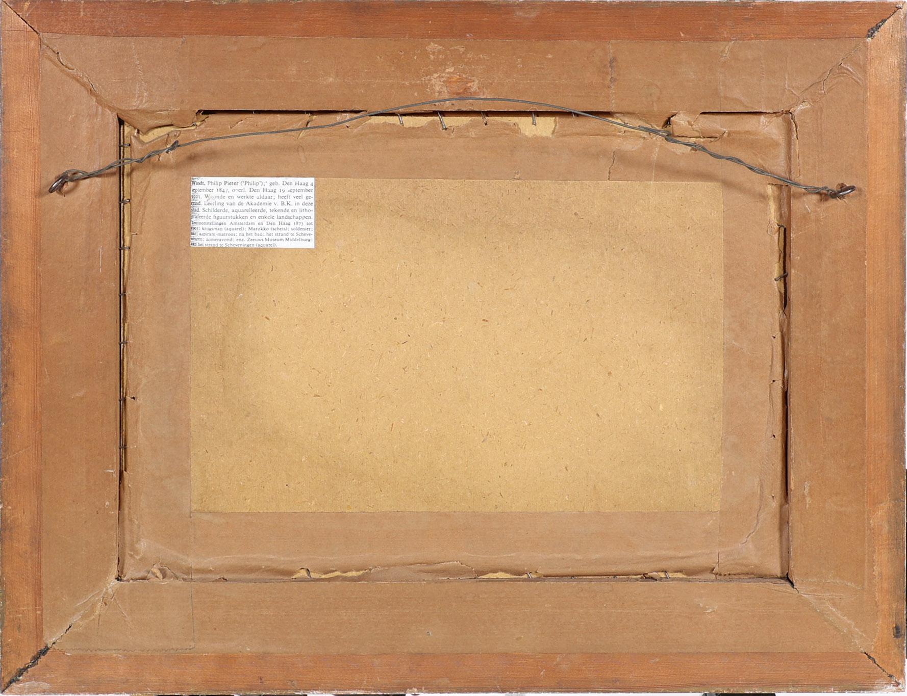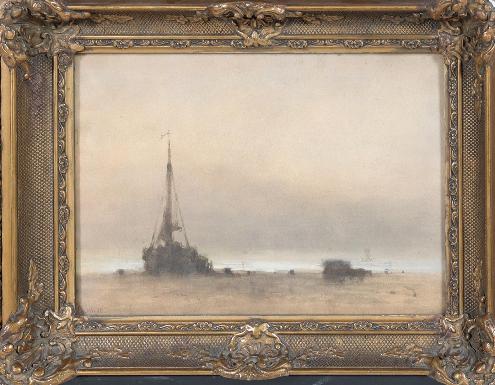 Philip Windt (1847-1921), Ochtenddauw op het strand met bomschuiten en schelpenwagen, aquarel, 35 x 25 cm., provenance particuliere collectie Nederland