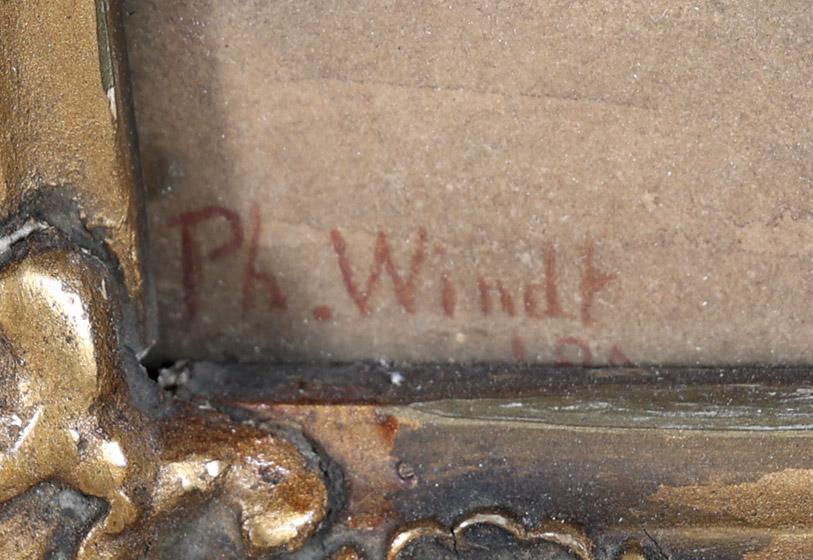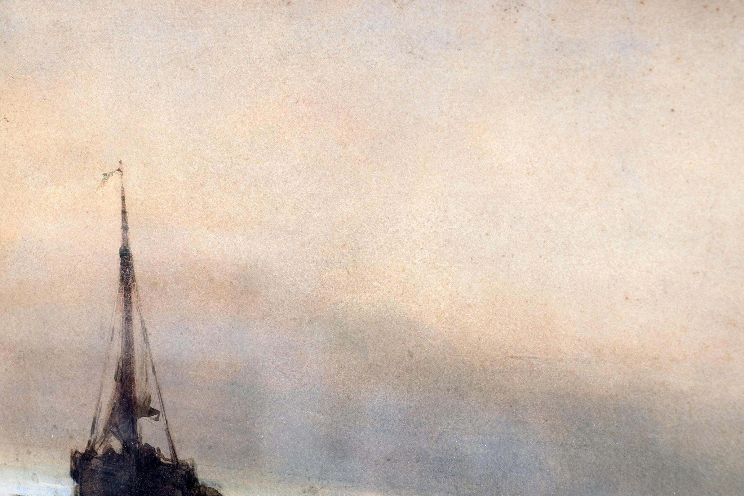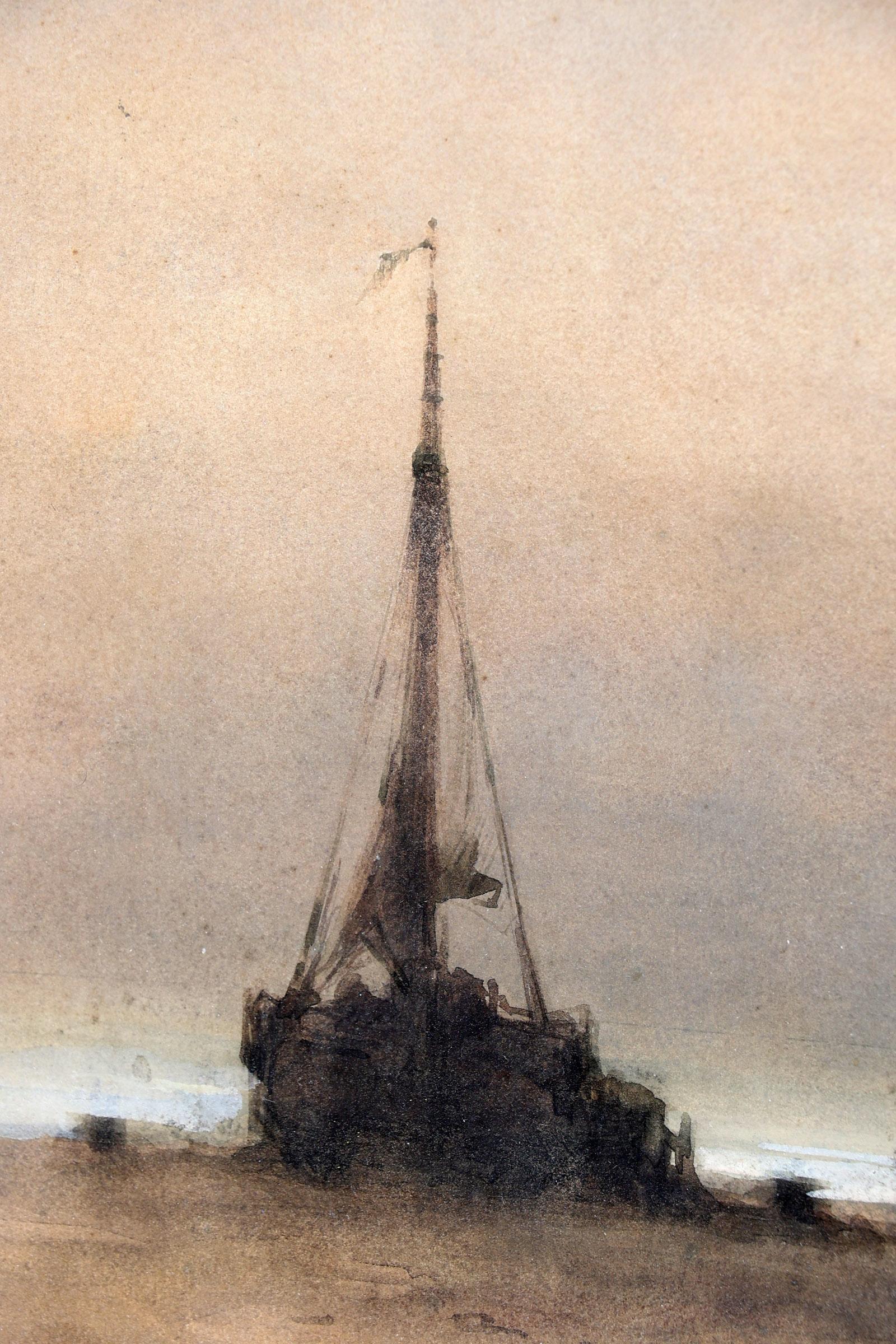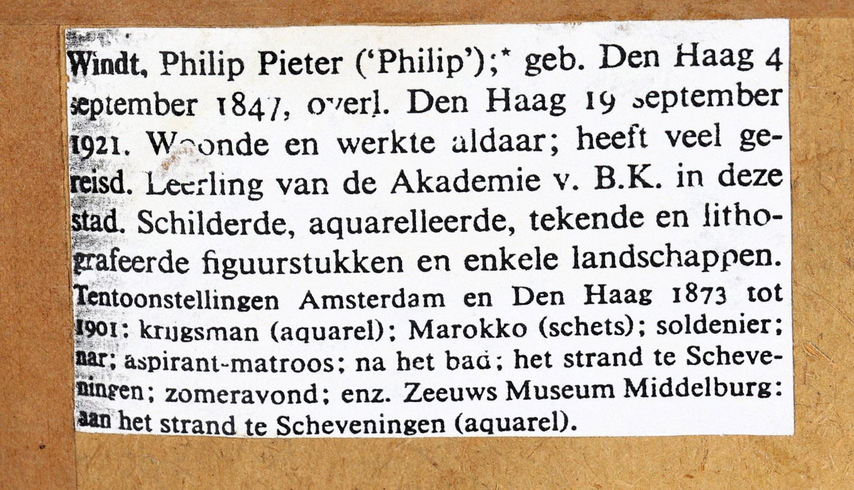 Philip Windt (1847-1921), Ochtenddauw op het strand met bomschuiten en schelpenwagen, aquarel, 35 x 25 cm., provenance particuliere collectie Nederland