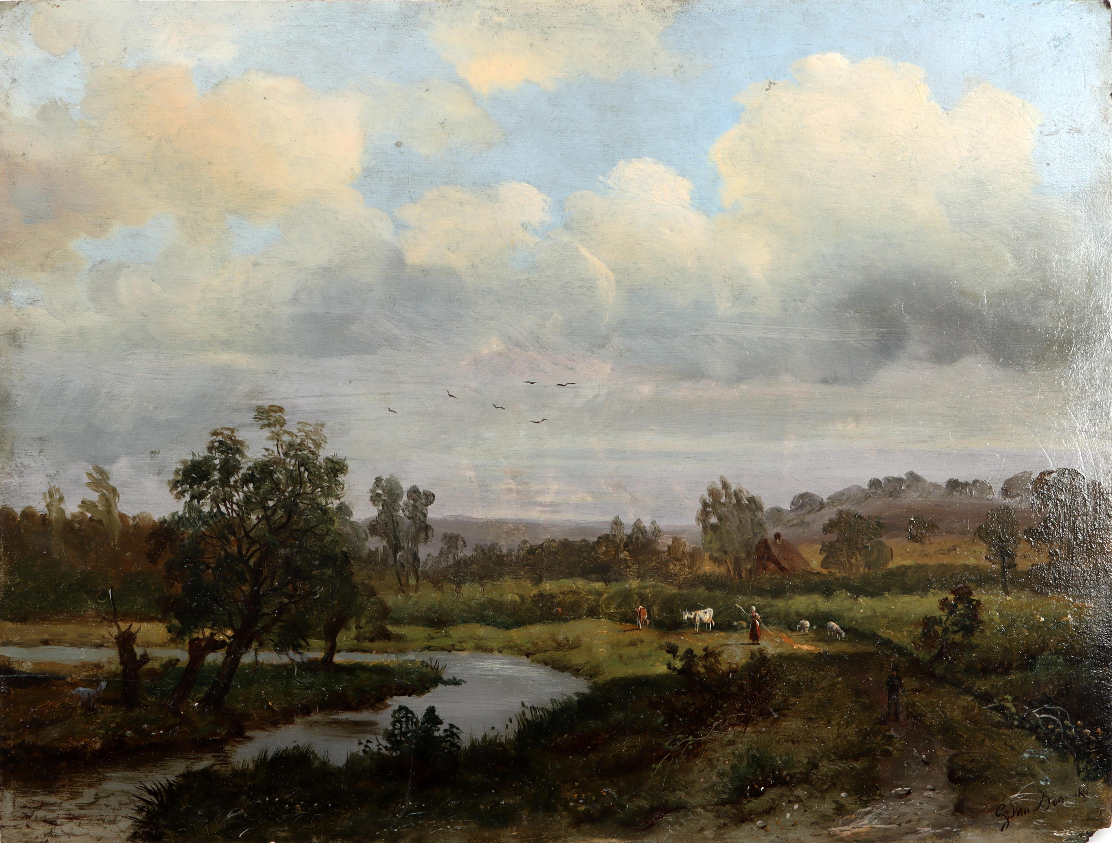 G. van Doornik, Landschap met personen en vee, olieverf op paneel, 40,5 x 31 cm., provenance particuliere collectie Nederland