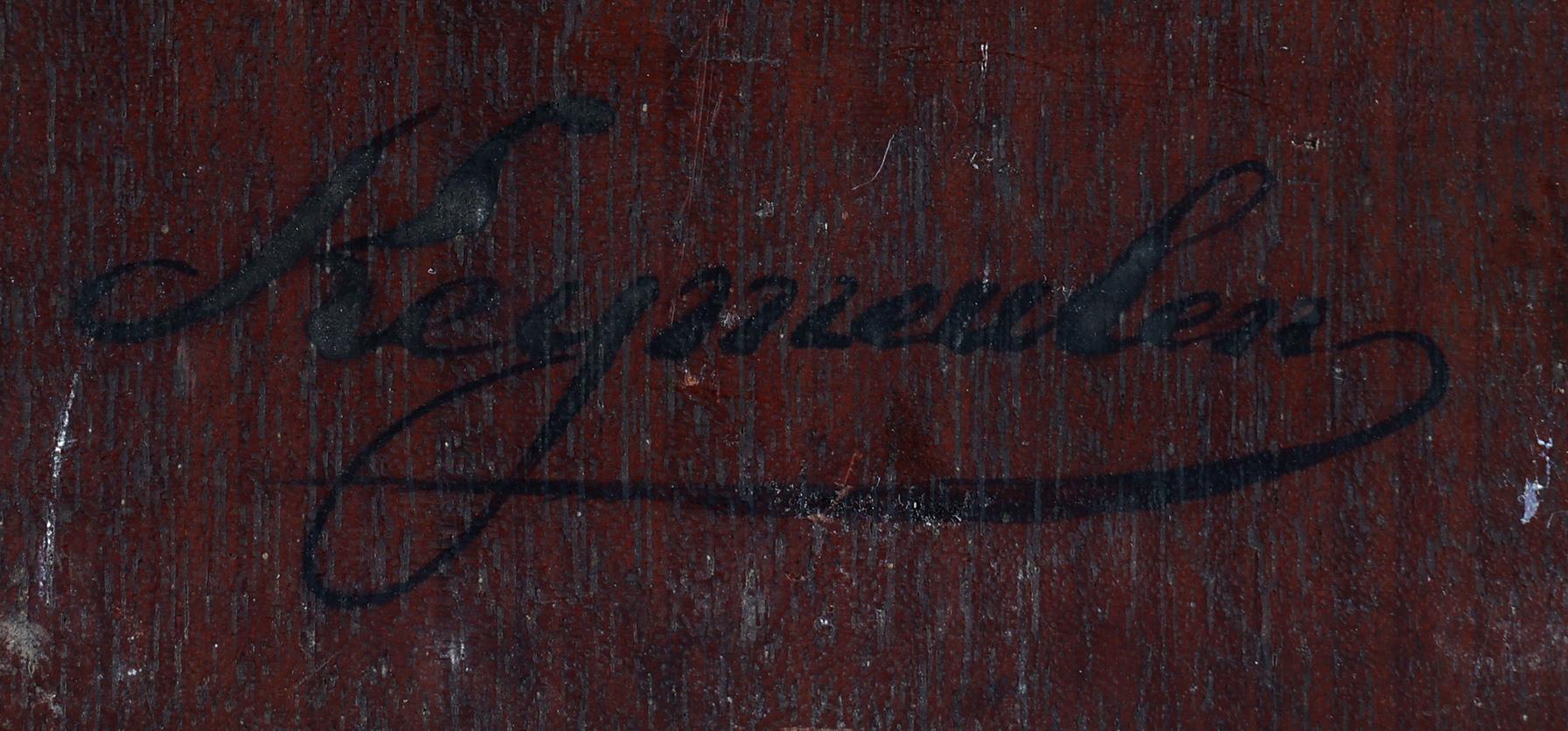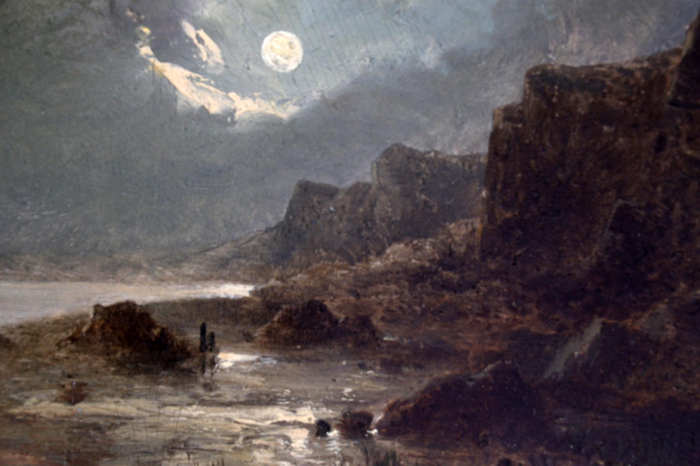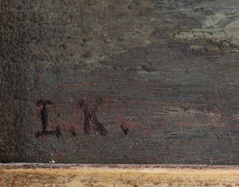 Monogram L.K., Kustlijn bij maanlicht, olieverf op paneel 21 x 17 cm., provenance particuliere collectie Nederland