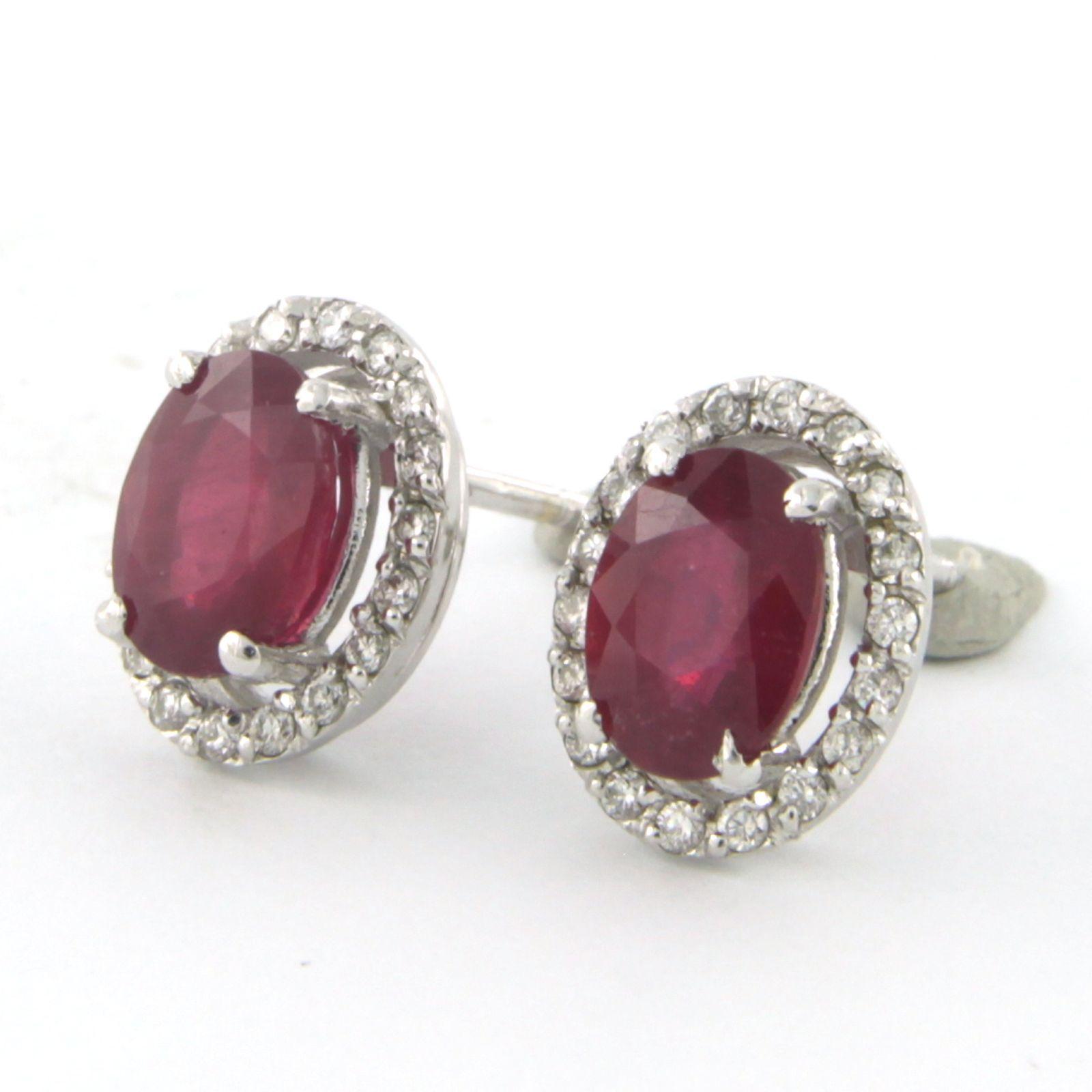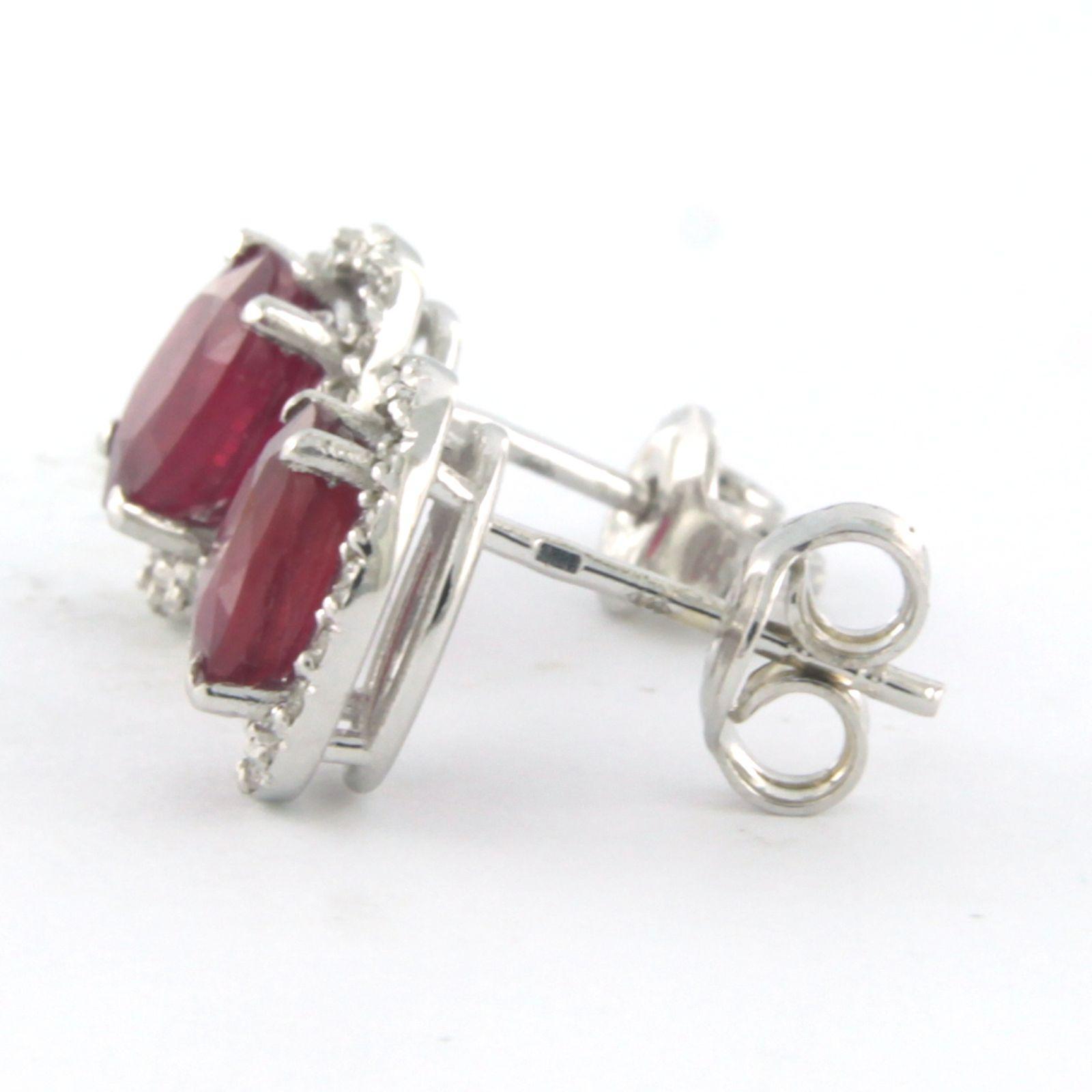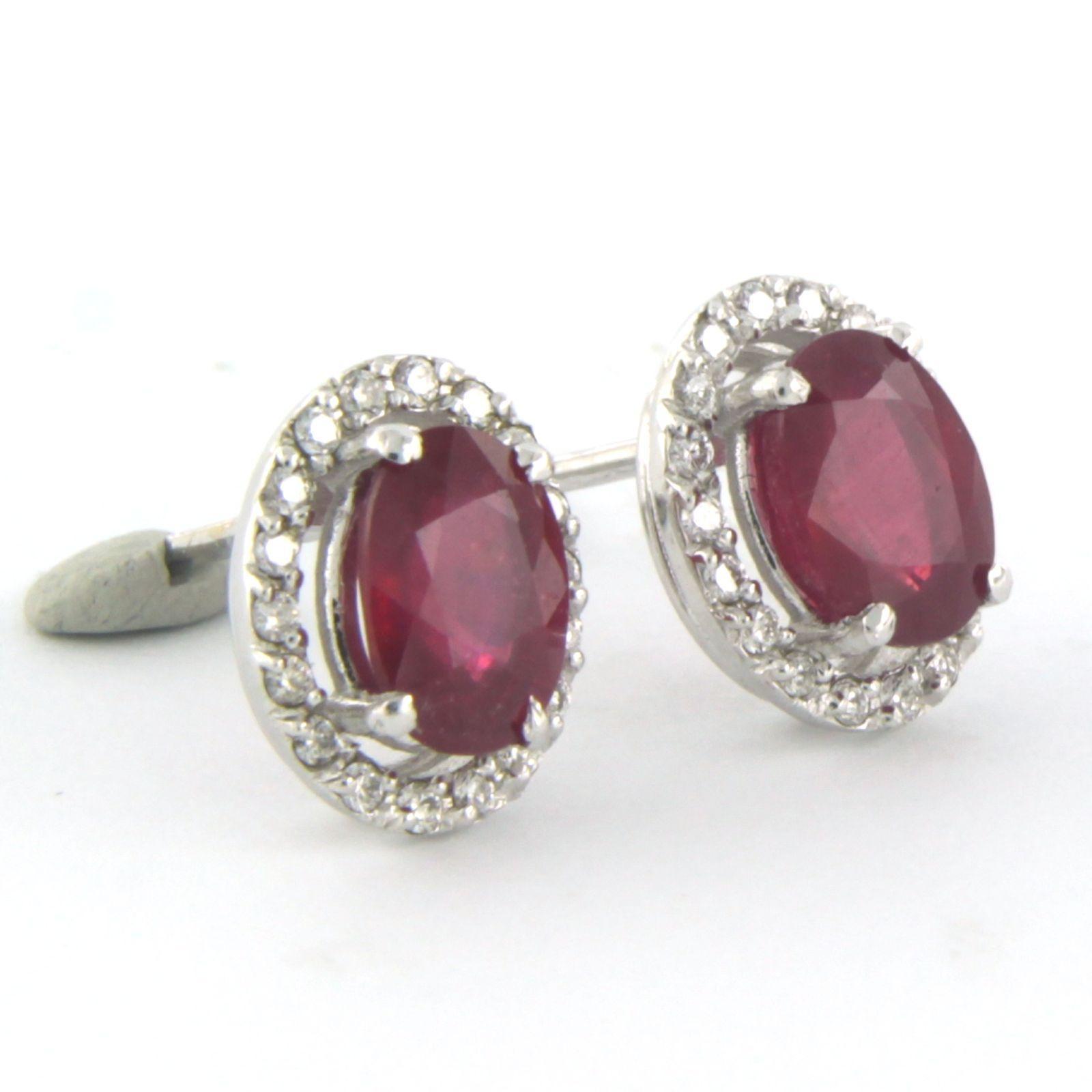 14 Kt. witgouden entourage oorknoppen bezet met centraal een robijn tot. 2,40ct en aan entourage briljant geslepen diamanten tot. 0,20ct - F/G - VS/SI