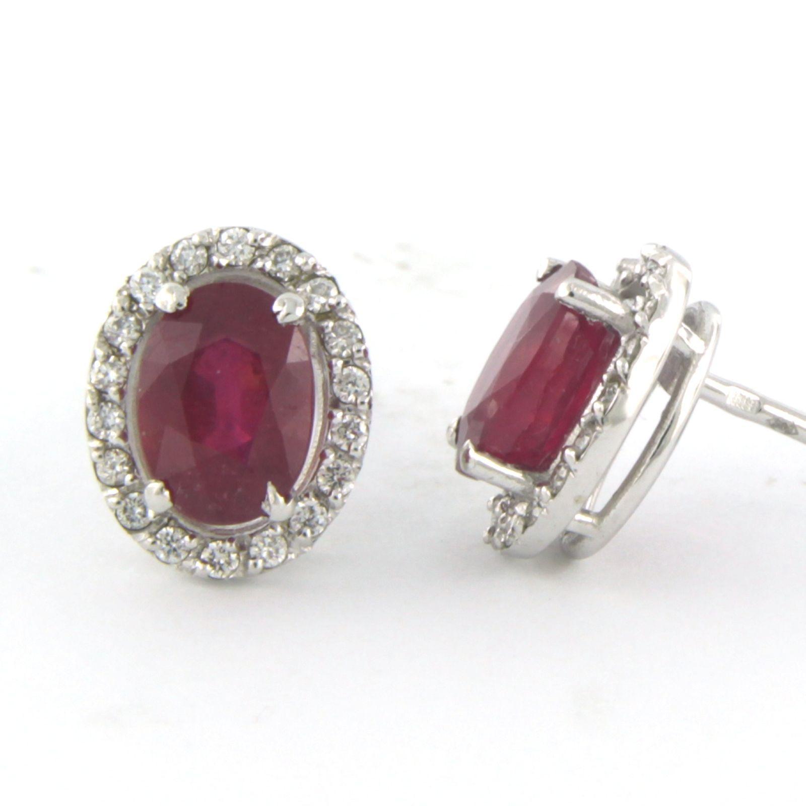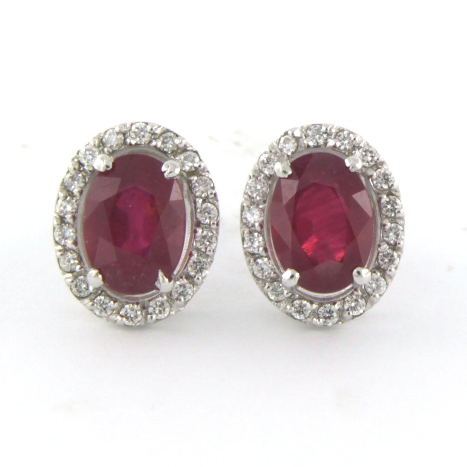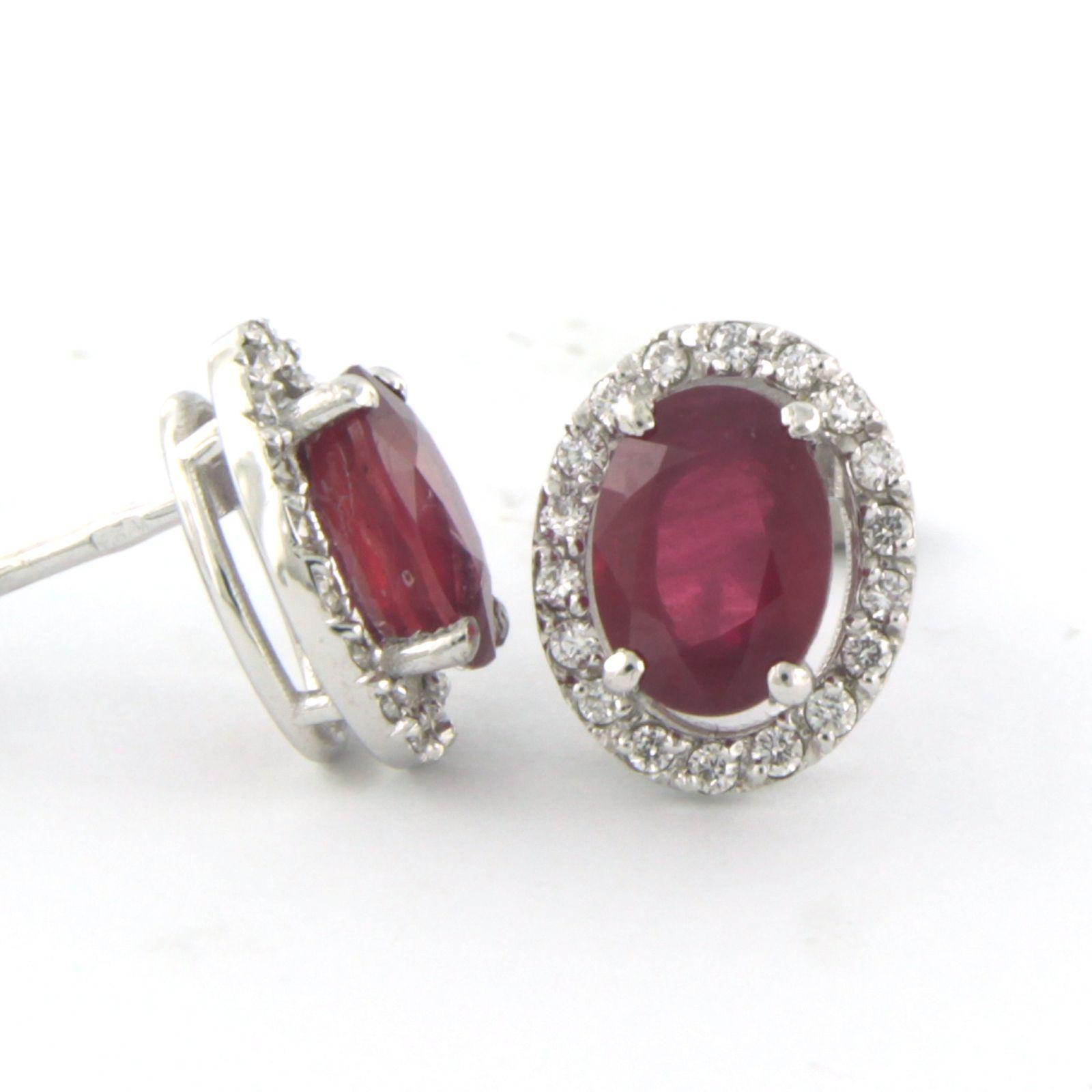 14 Kt. witgouden entourage oorknoppen bezet met centraal een robijn tot. 2,40ct en aan entourage briljant geslepen diamanten tot. 0,20ct - F/G - VS/SI
