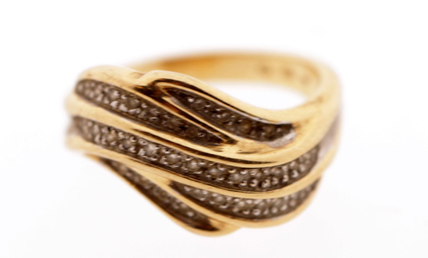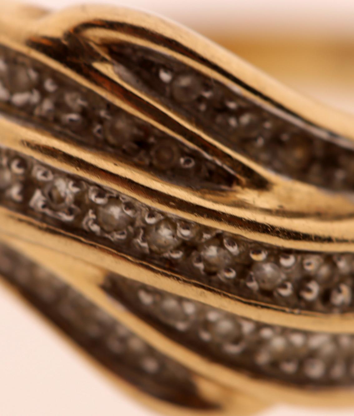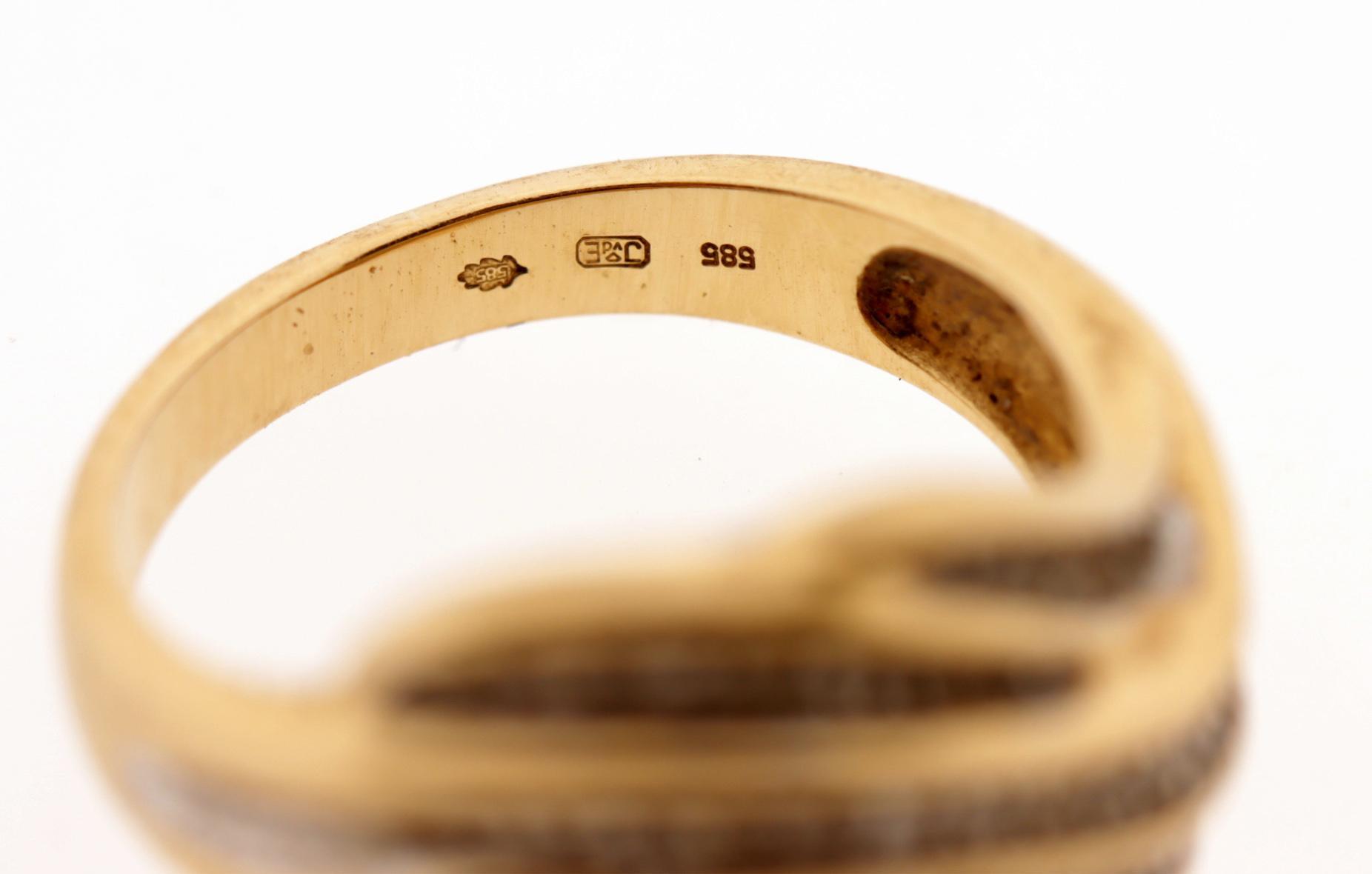 14 Kt. gouden fantasiering bezet met briljant geslepen diamanten, diam 19 mm., 6,7 gram