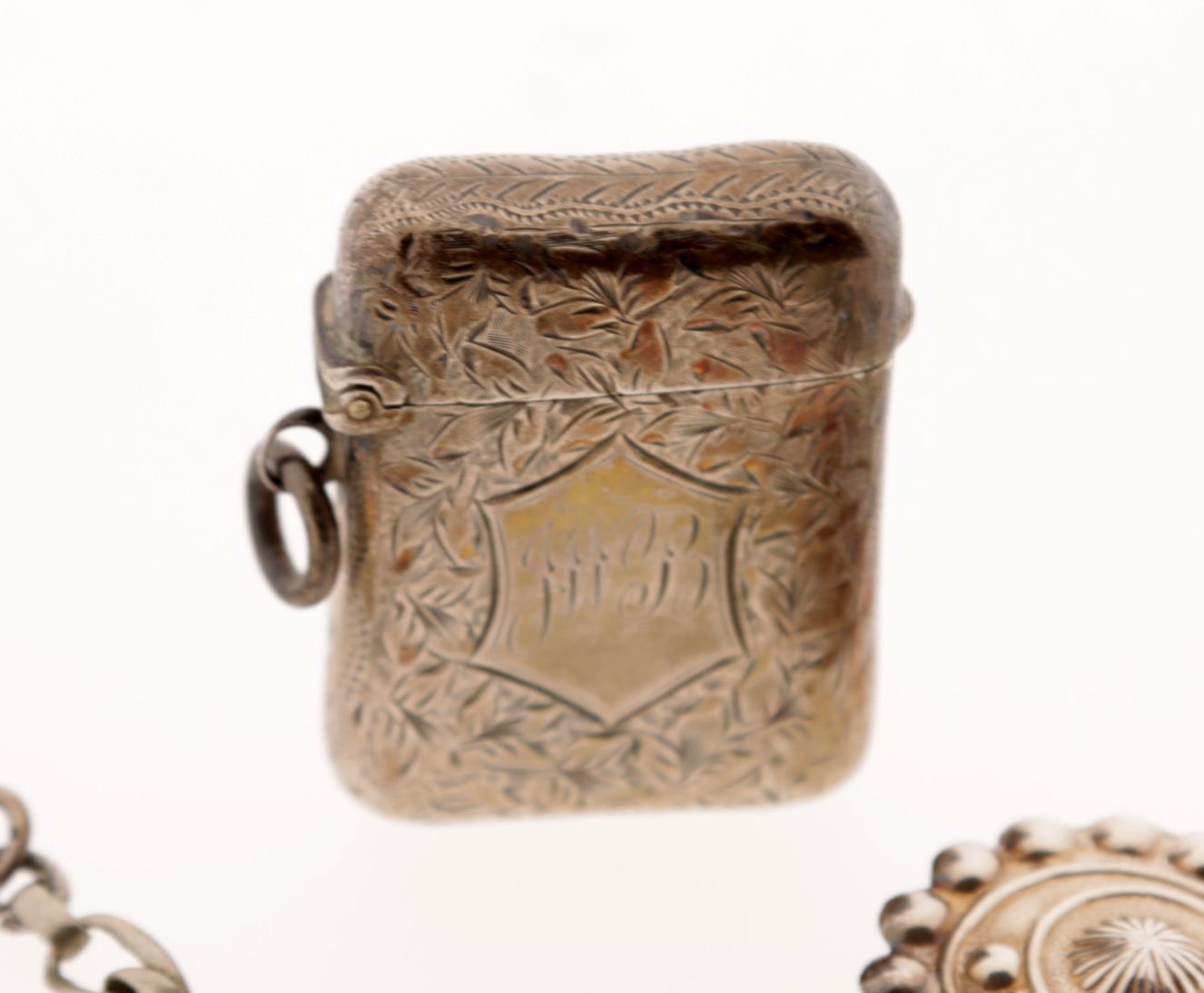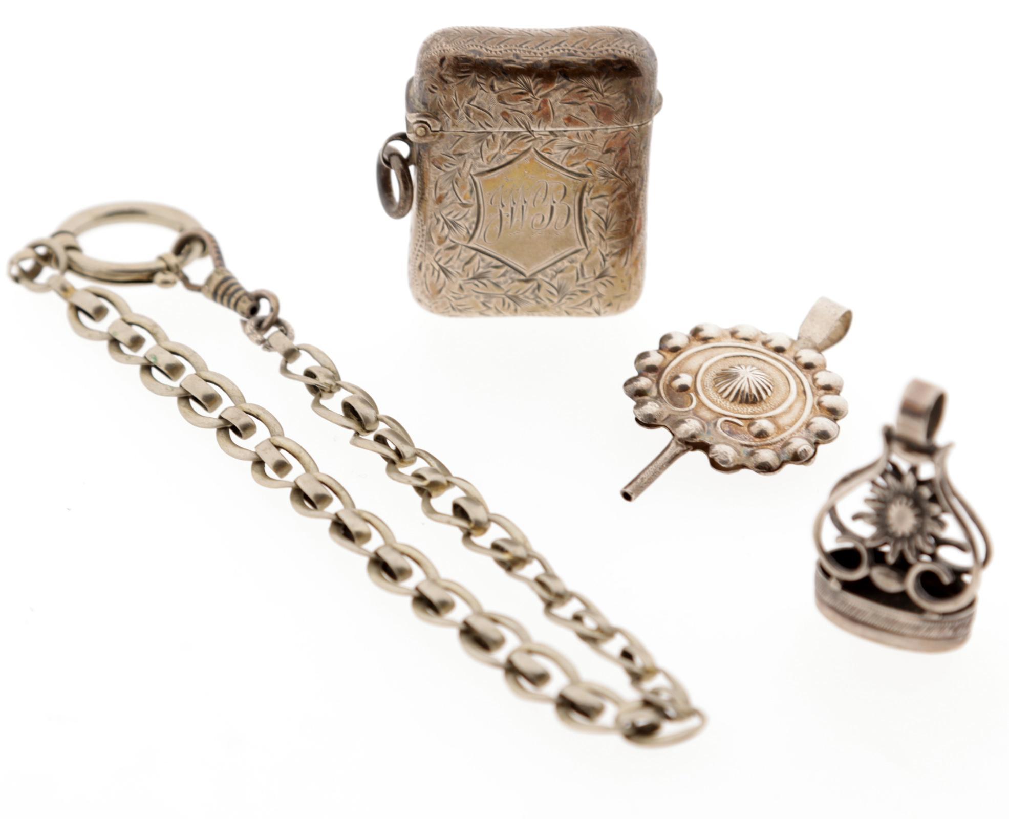 Koopje van een zilveren tondeldoosje, horlogeketting en horlogesleutel en stempel