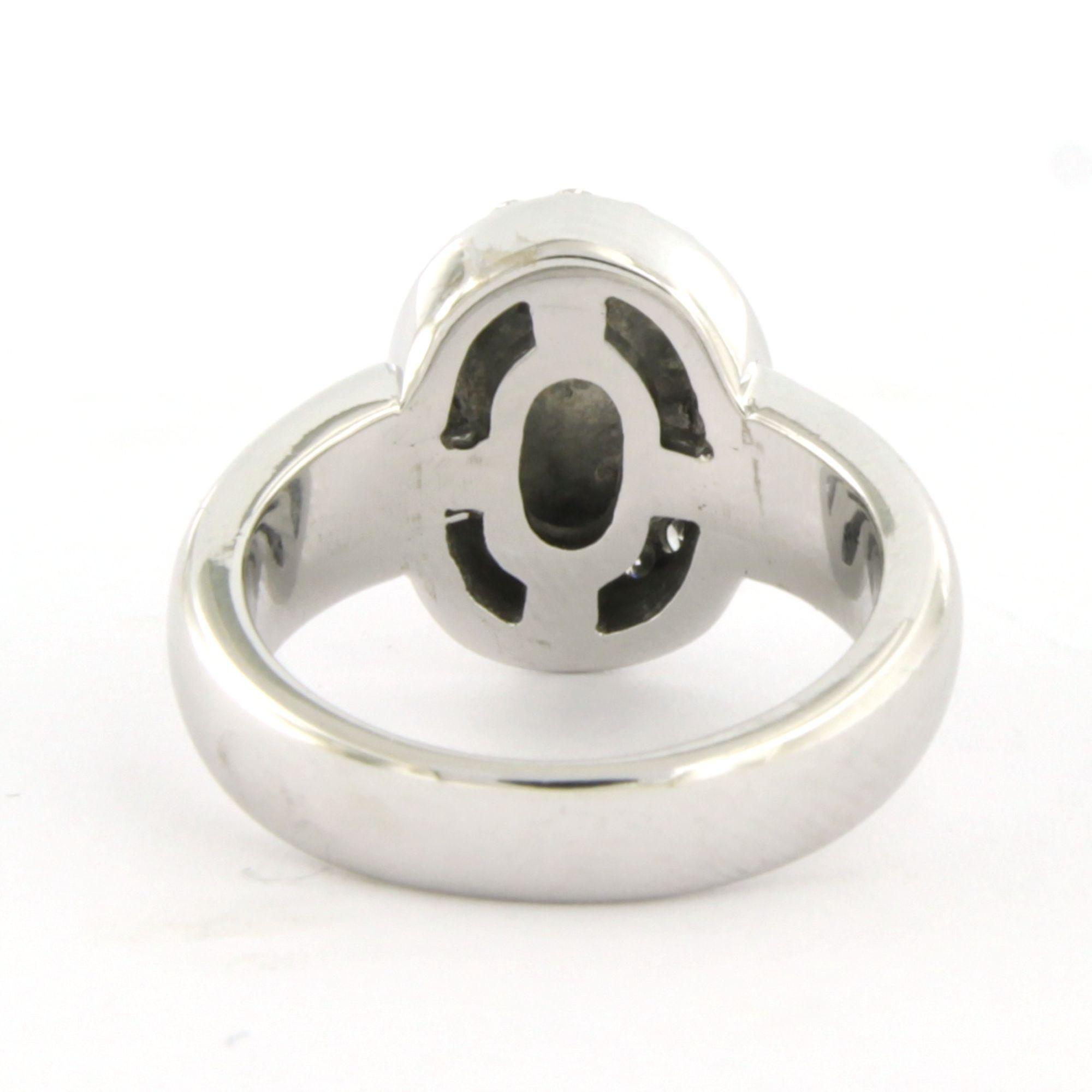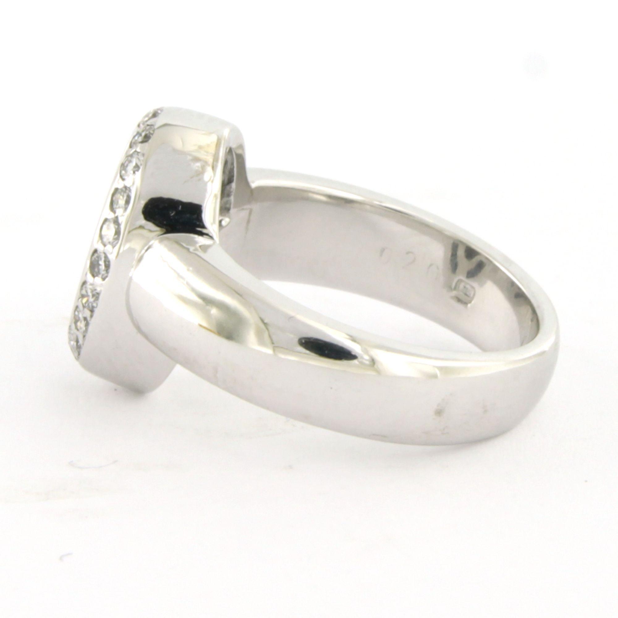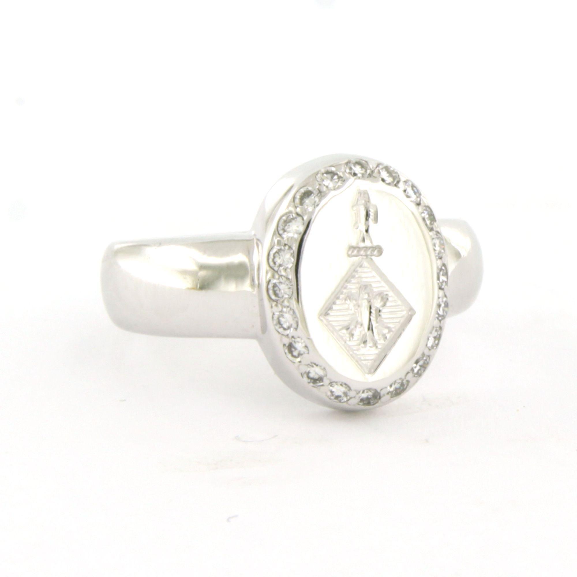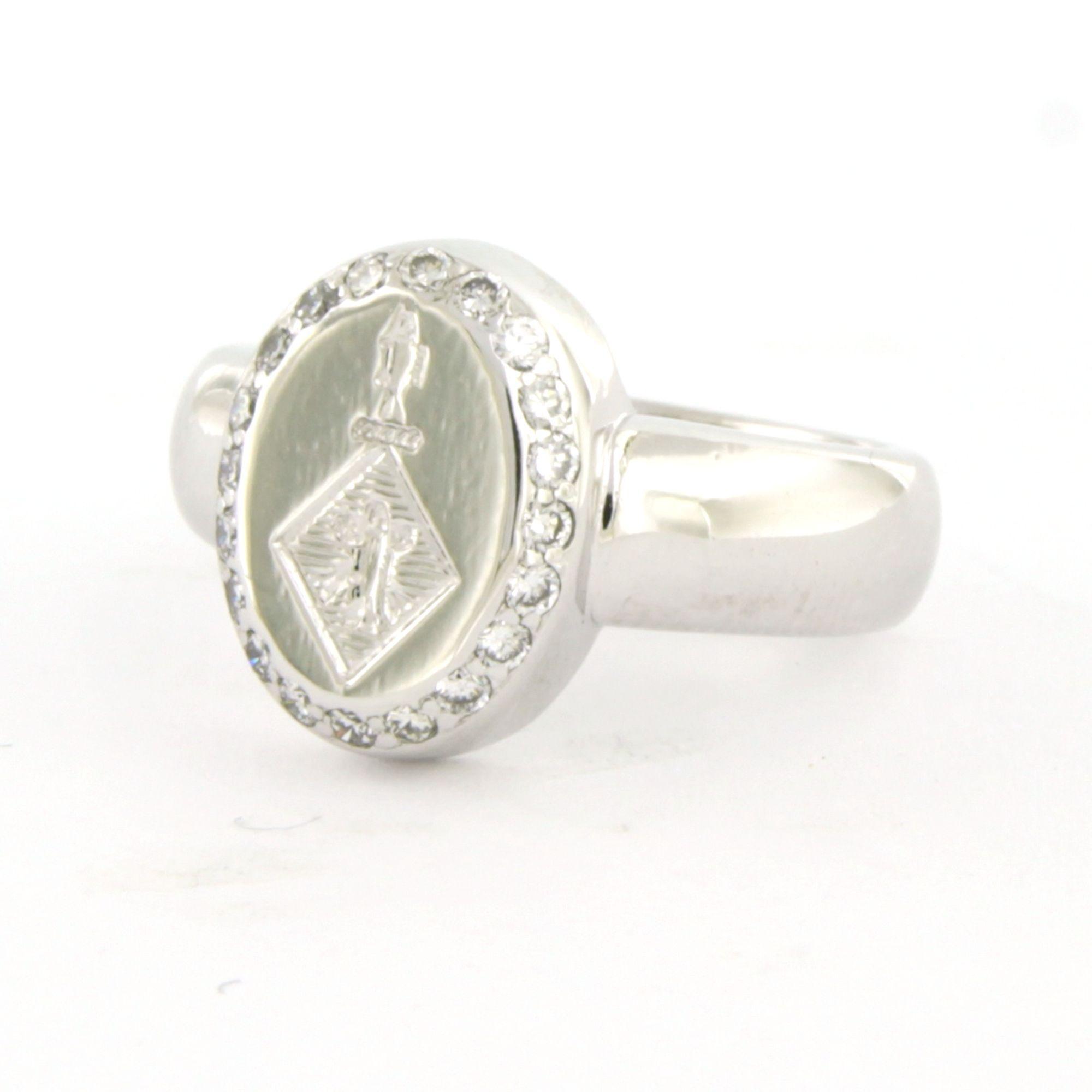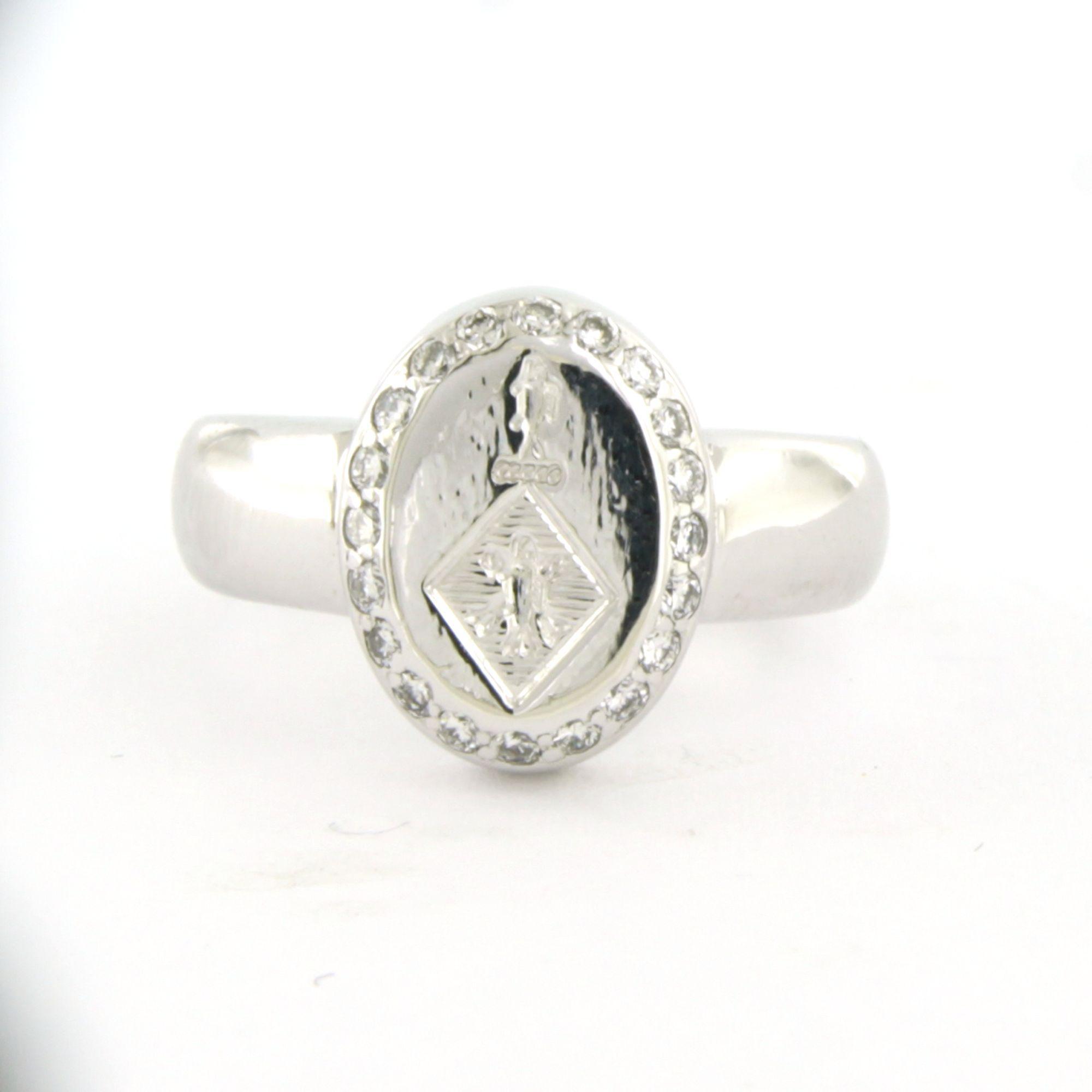 18 Kt. witgouden ring bezet met briljant geslepen diamant tot. 0.20ct - F/G - VS/SI - met een familie wapen gegraveerd - ringmaat 14.5(46)