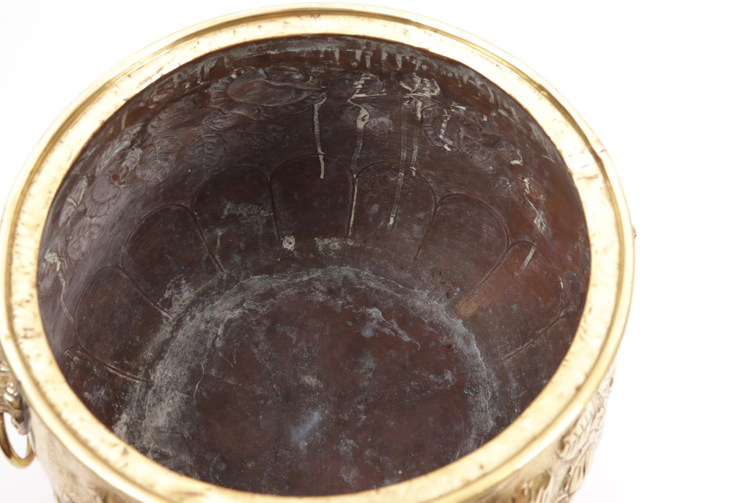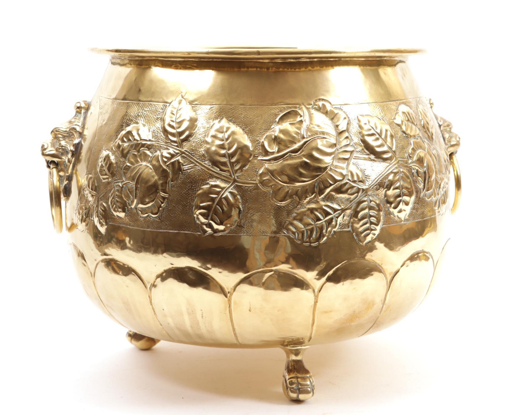 Messing cache-pot geflankeerd door leeuwenkoppen en rustend op klauwpoten, h.30 cm.