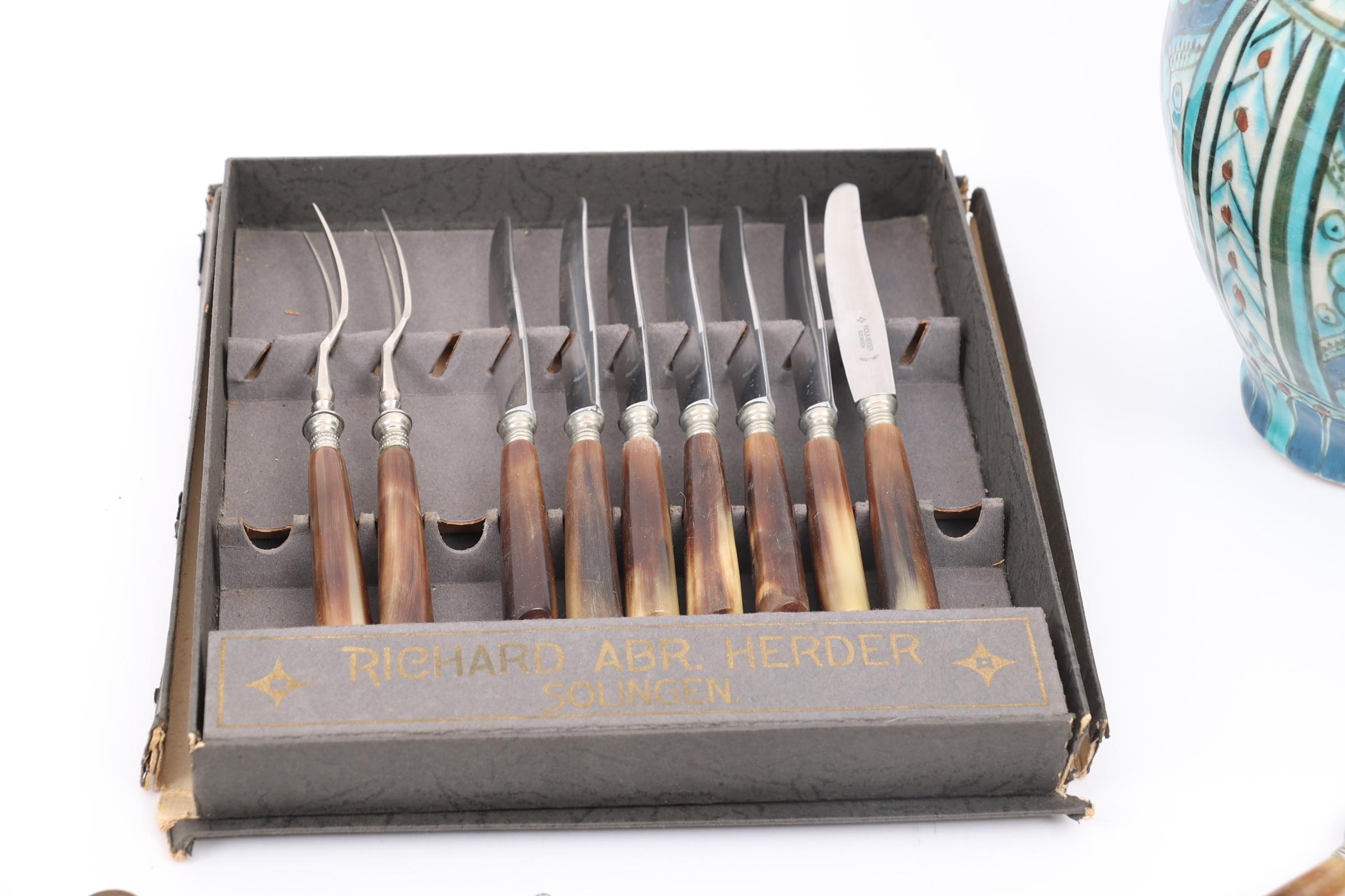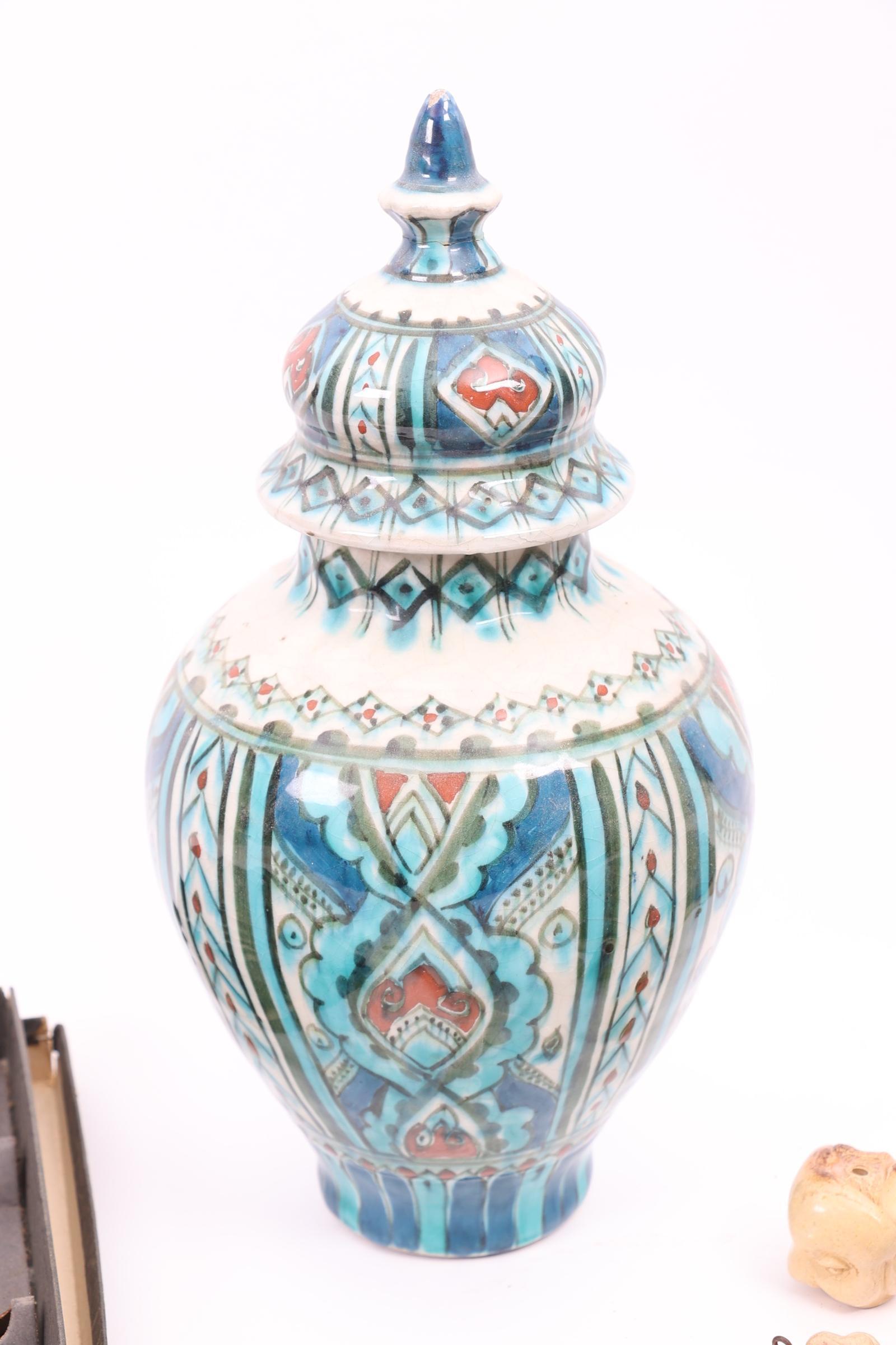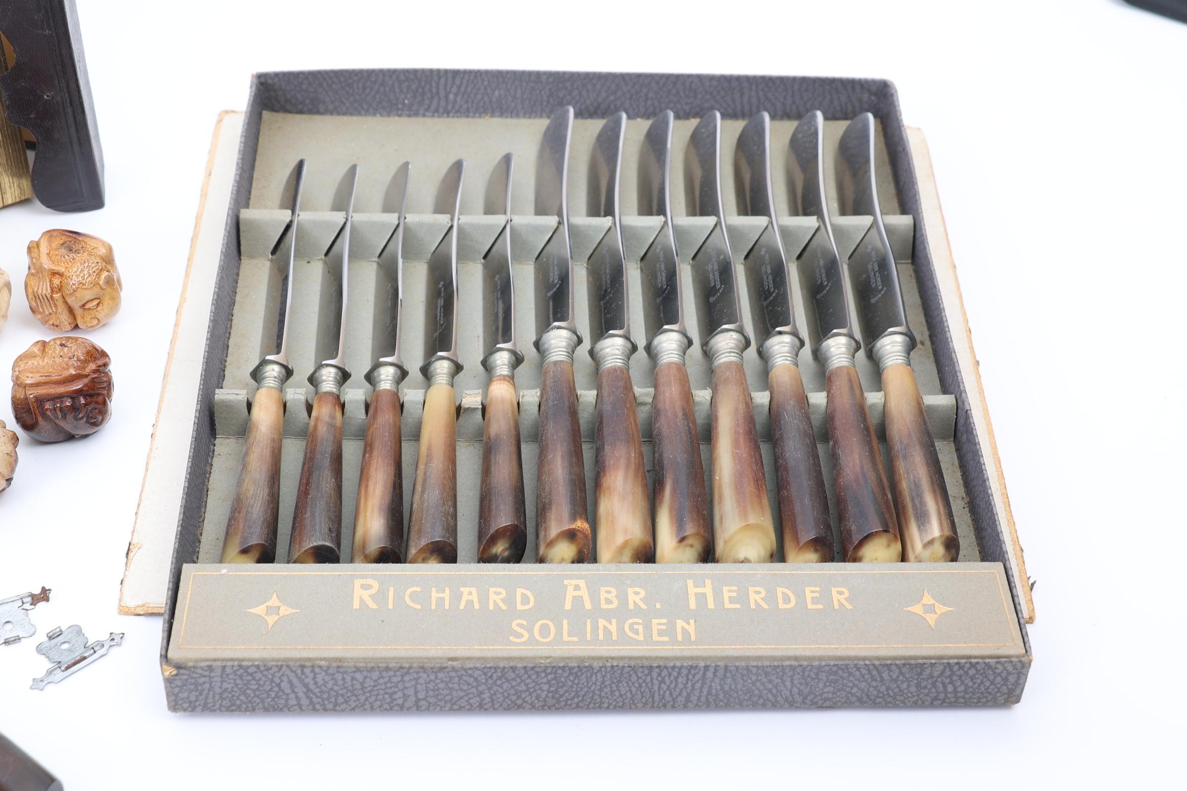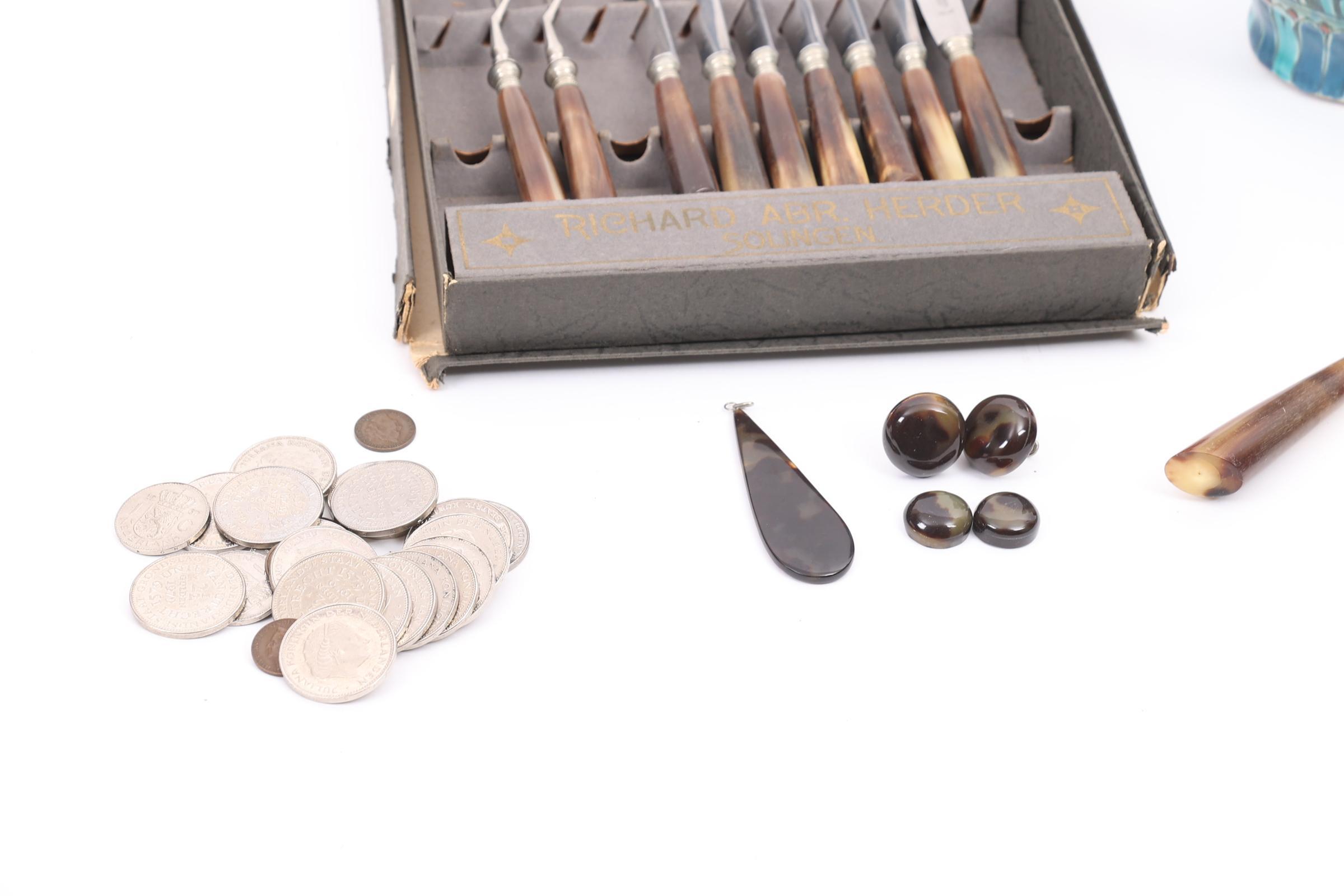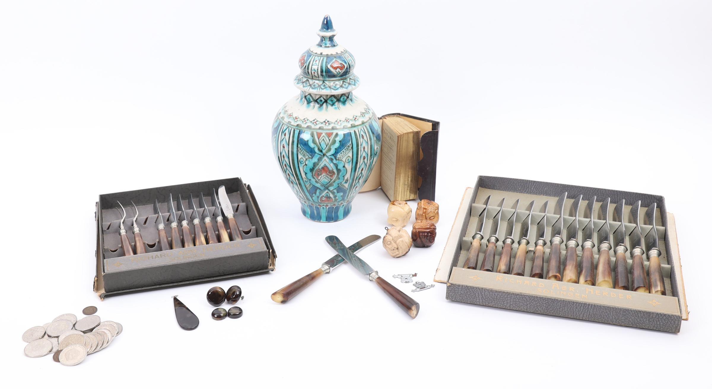 Koop van een Delfts aardewerken dekselpot, munten, pleet messen met heften van hertshoorn etc.