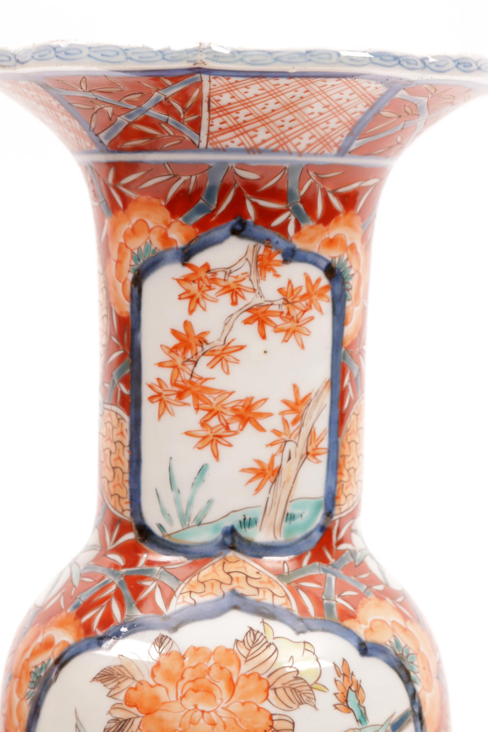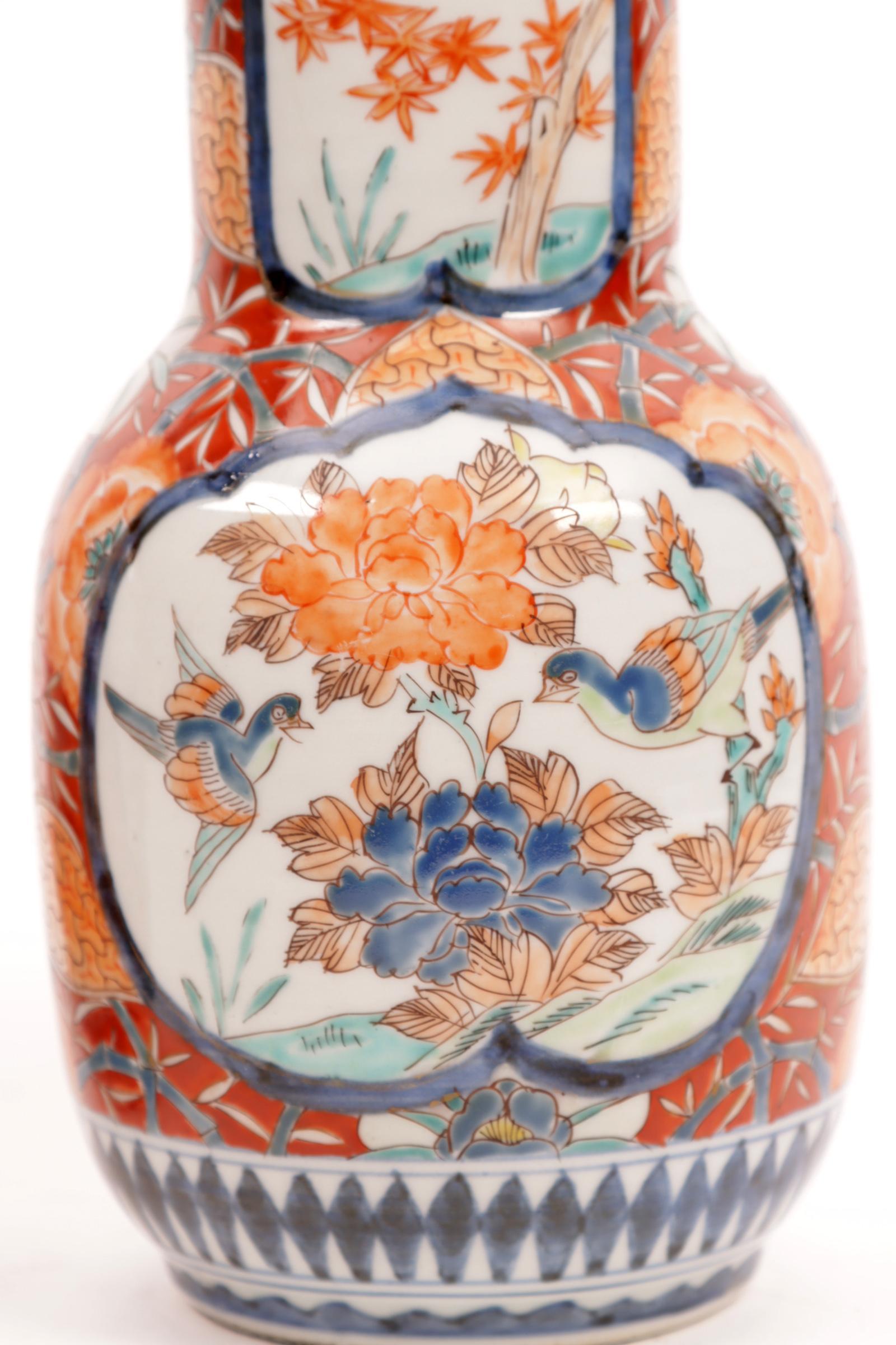 Twee met vogels gedecoreerde Imari kraagvazen, h.28 cm.