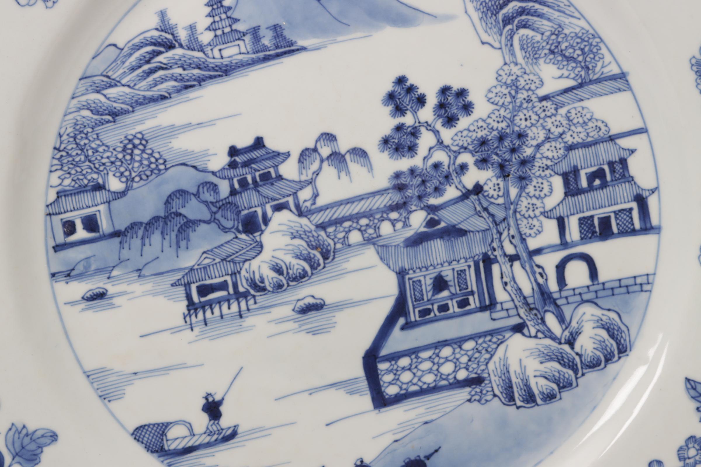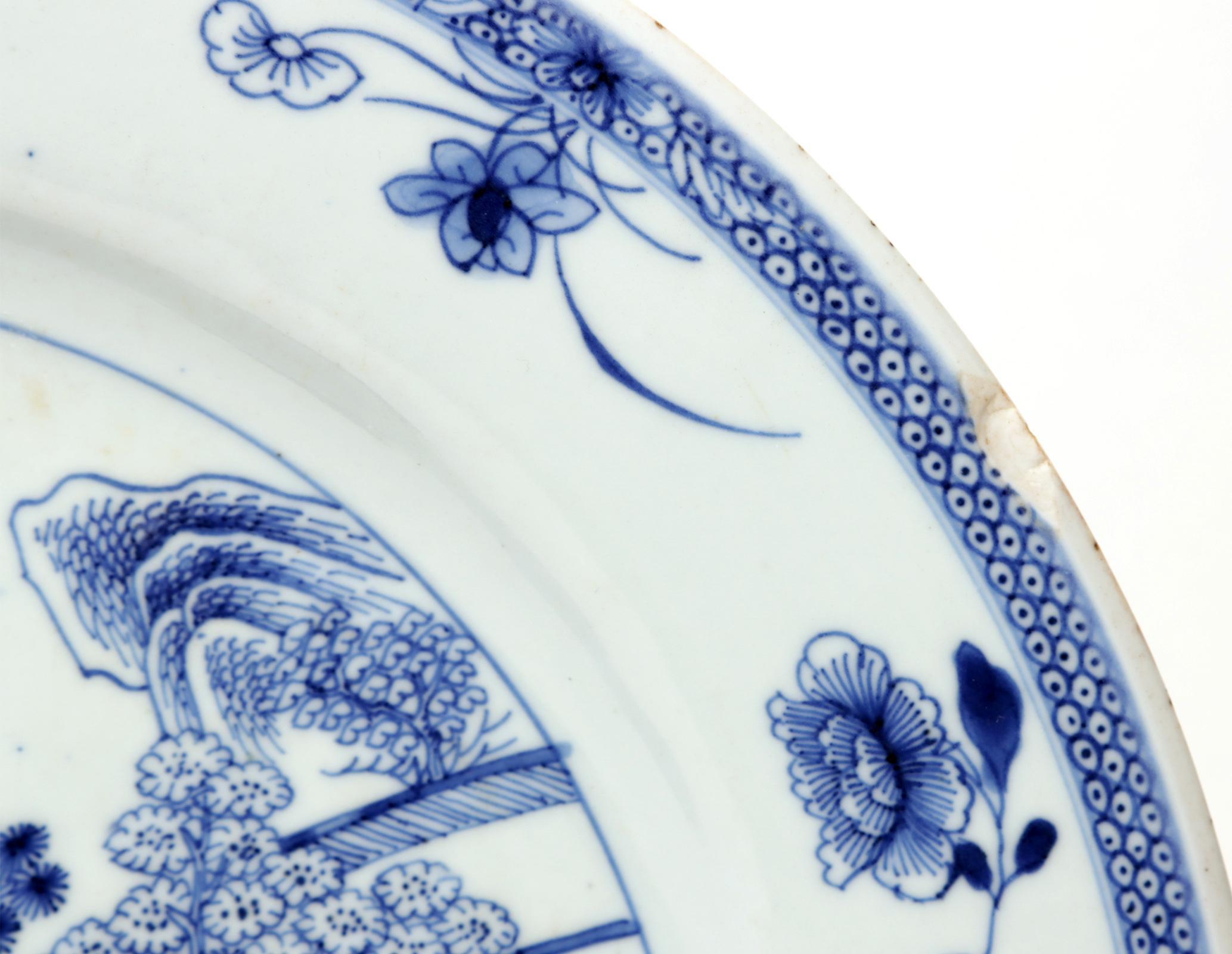 Blauw/wit met huisjes in landschap gedecoreerde Chinees porseleinen schotel(randschilfers), 35,5 cm.