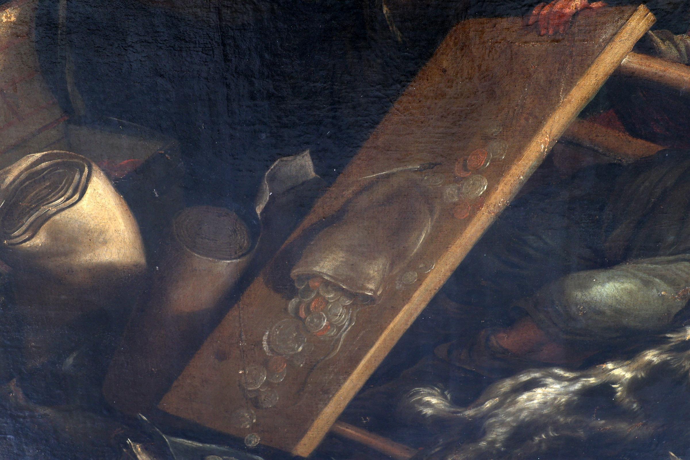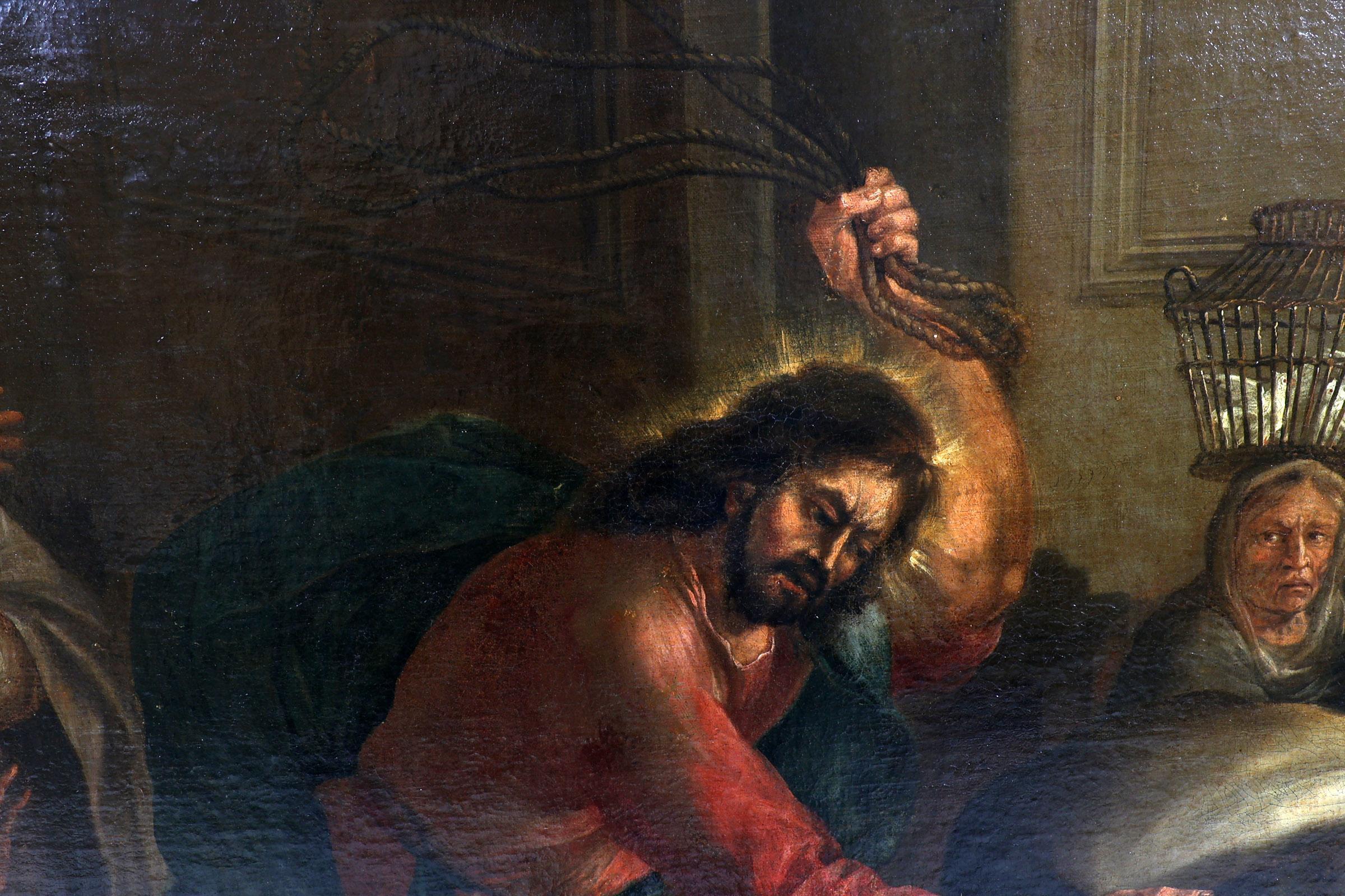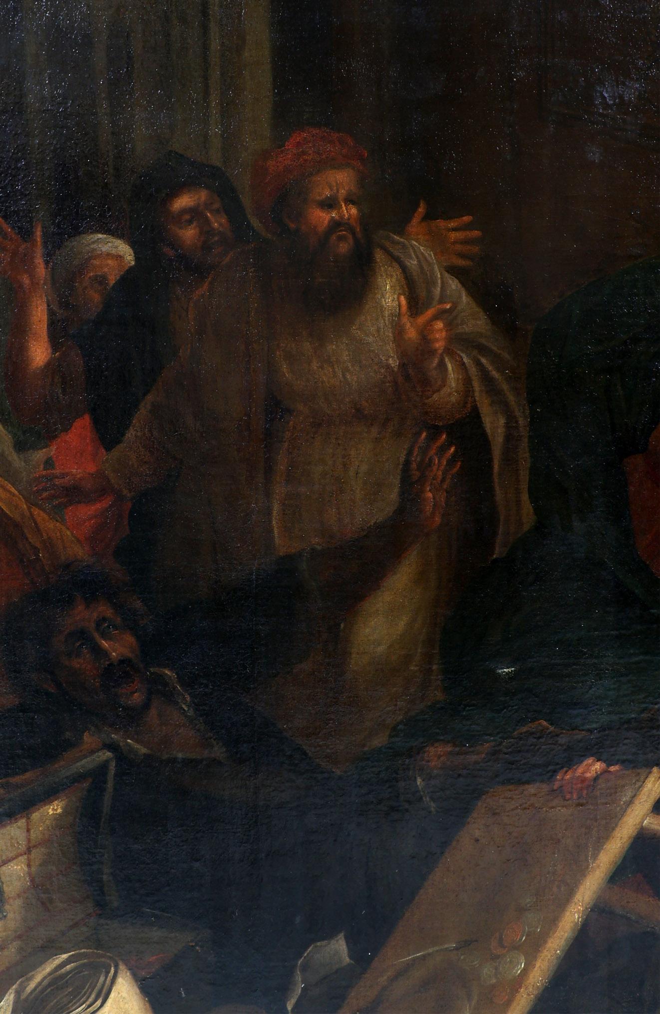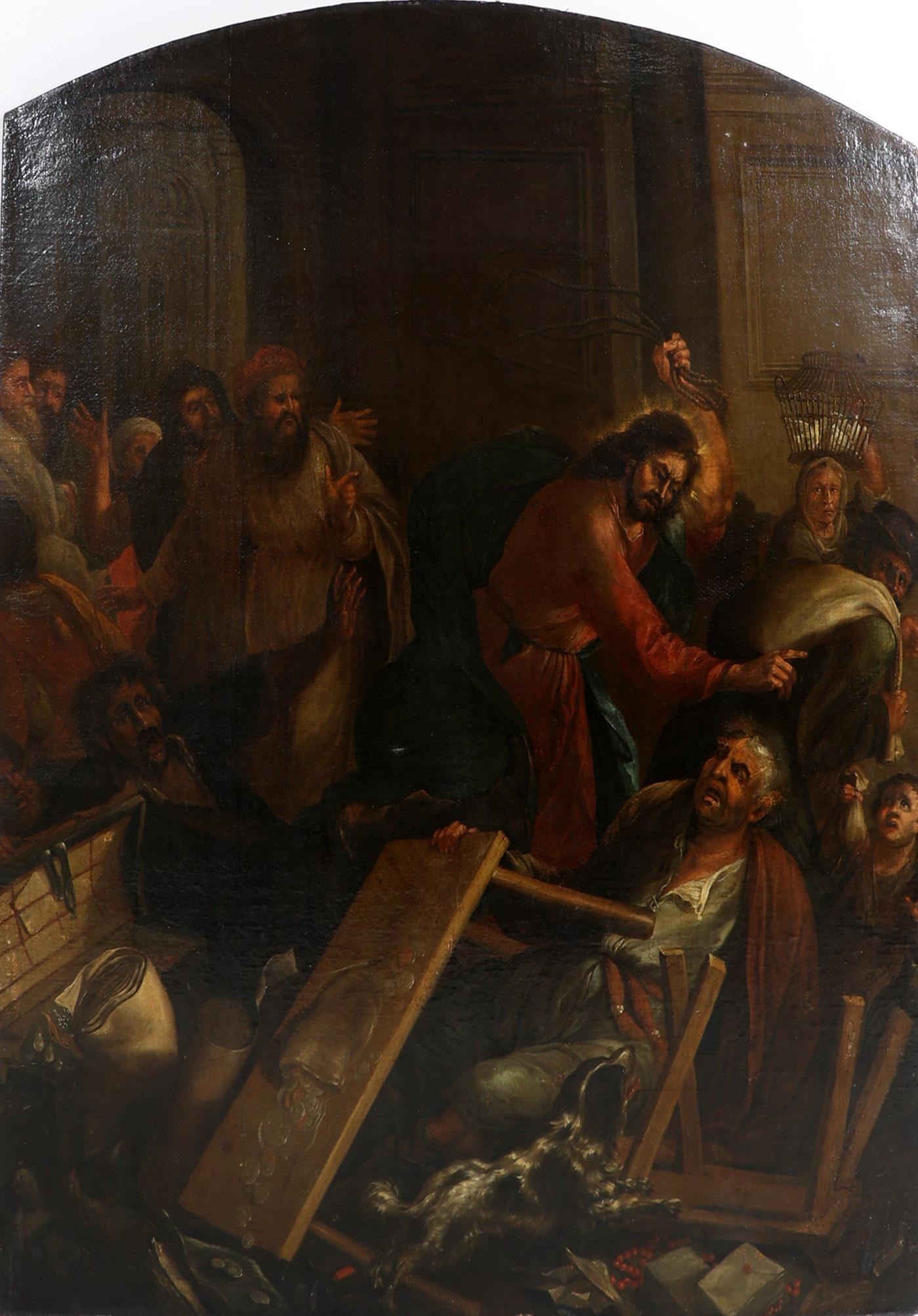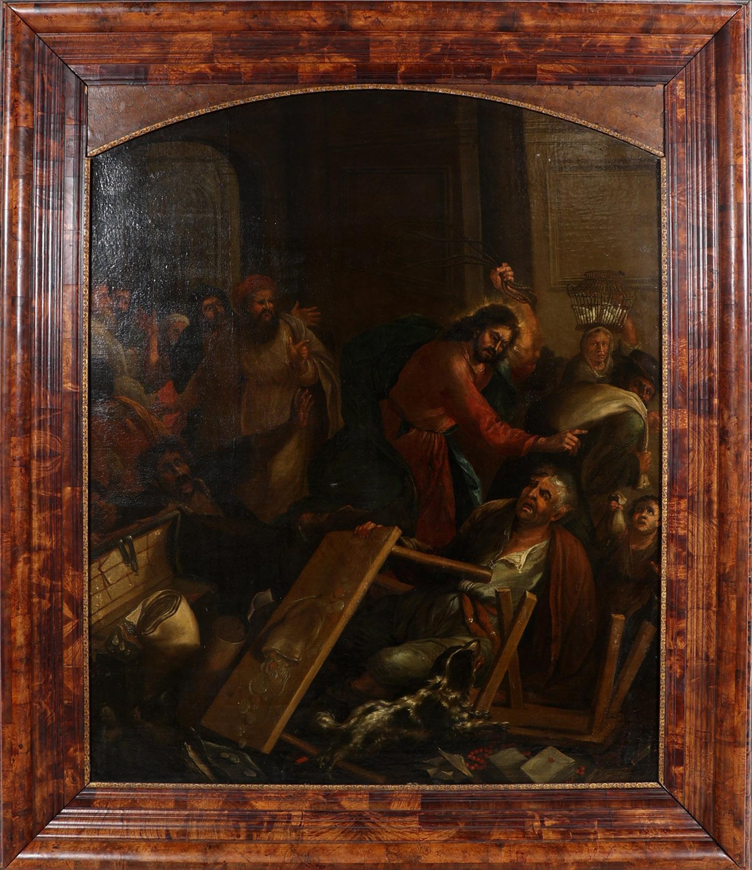 Europese School, 18e eeuw, Christus verdrijft de geldwisselaars uit de tempel, olieverf op doek, 182 x 148 cm., met kapitale lijst, inclusief lijst 202 x 232 cm., provenance particuliere collecte