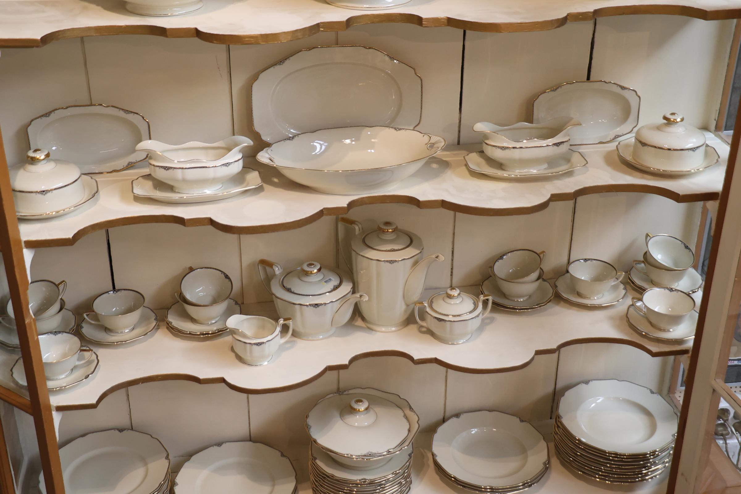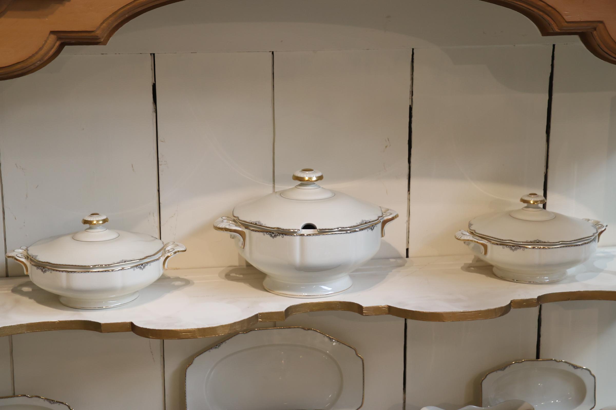 Zeer uitgebreid crèmekleurig porseleinen Hemrich serviesdeel met grijs/witte Art Deco-stijl decoratie en gouden accent afgezet, Bavaria Germany