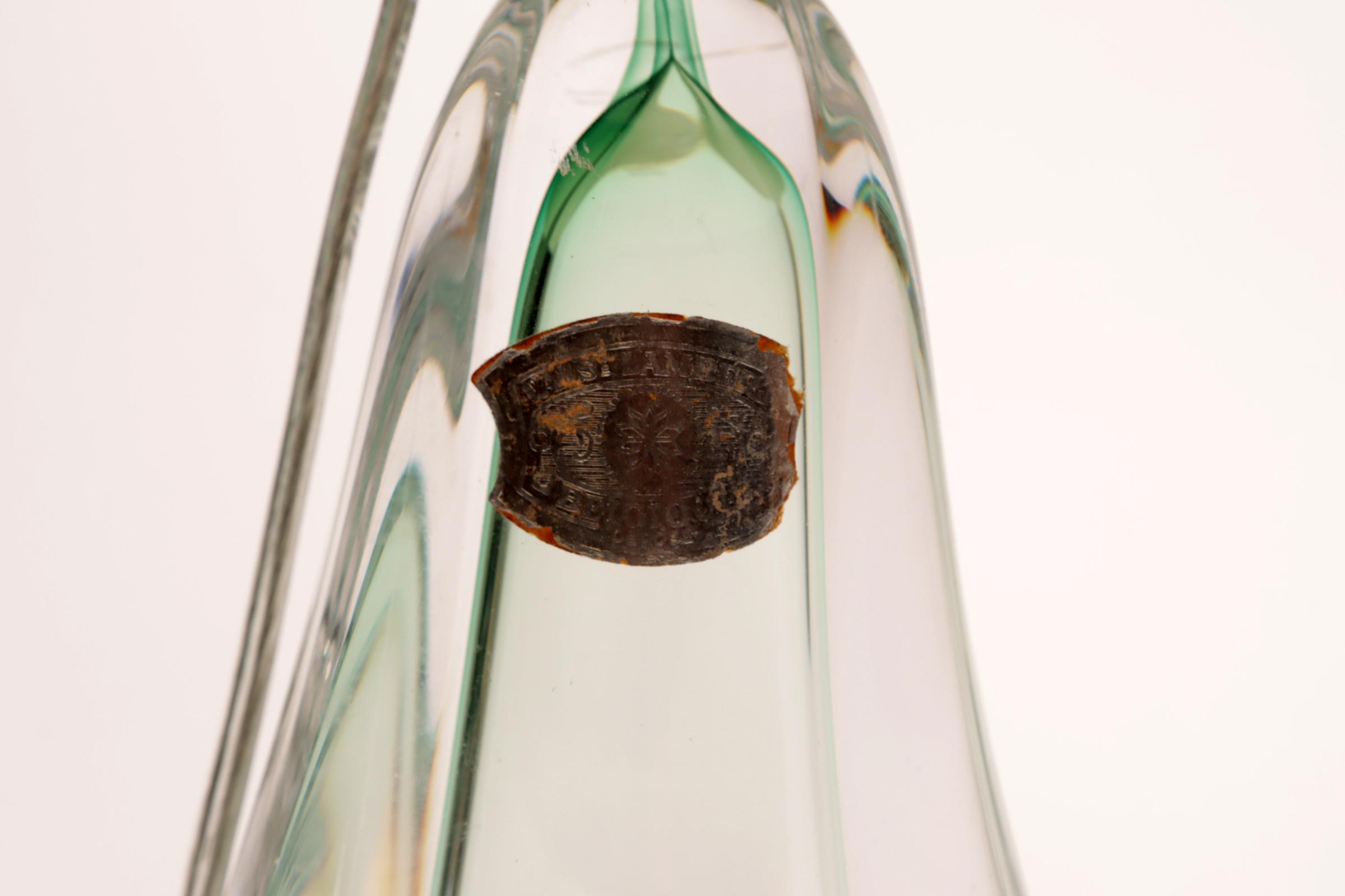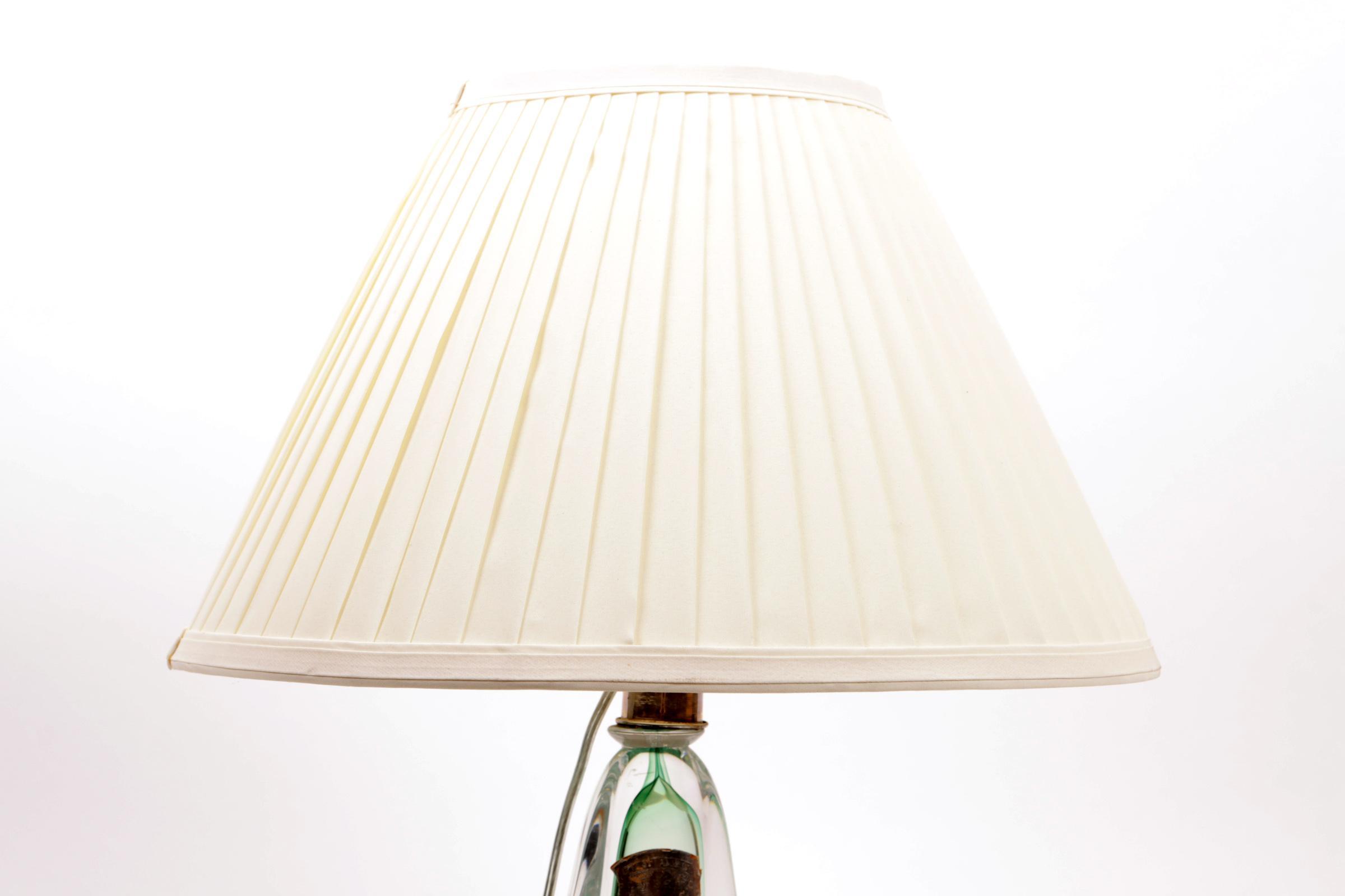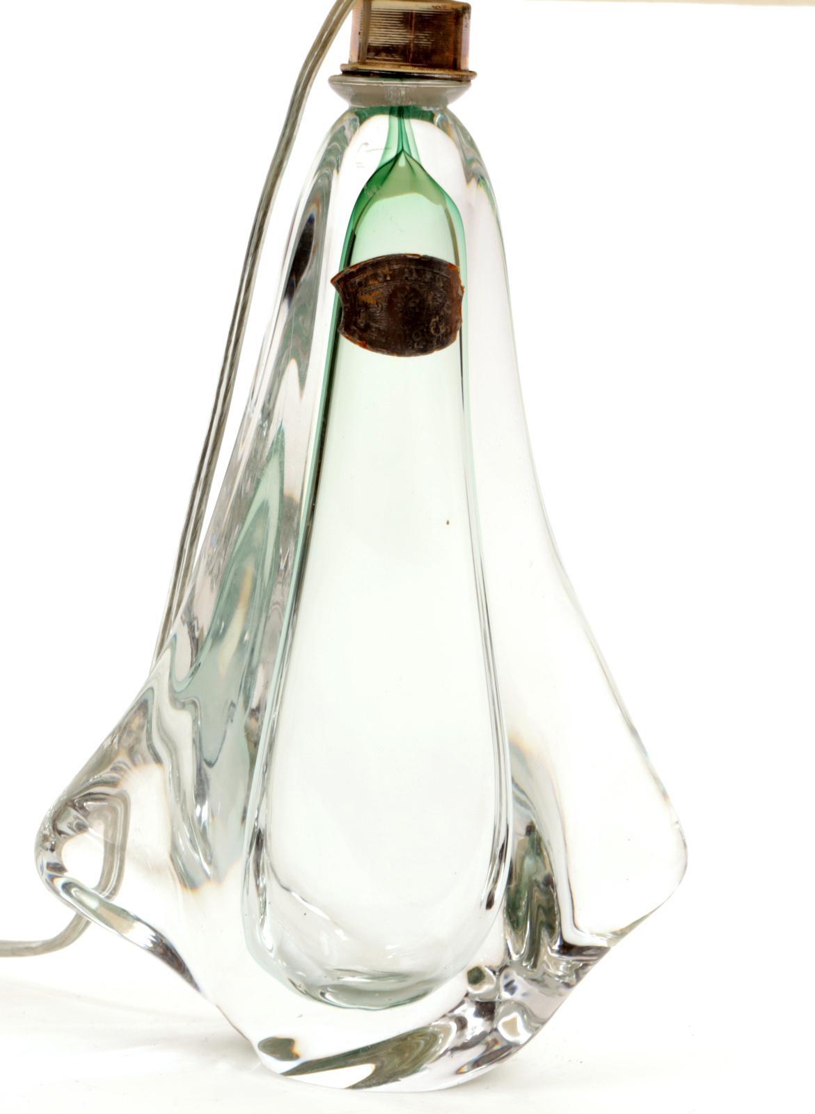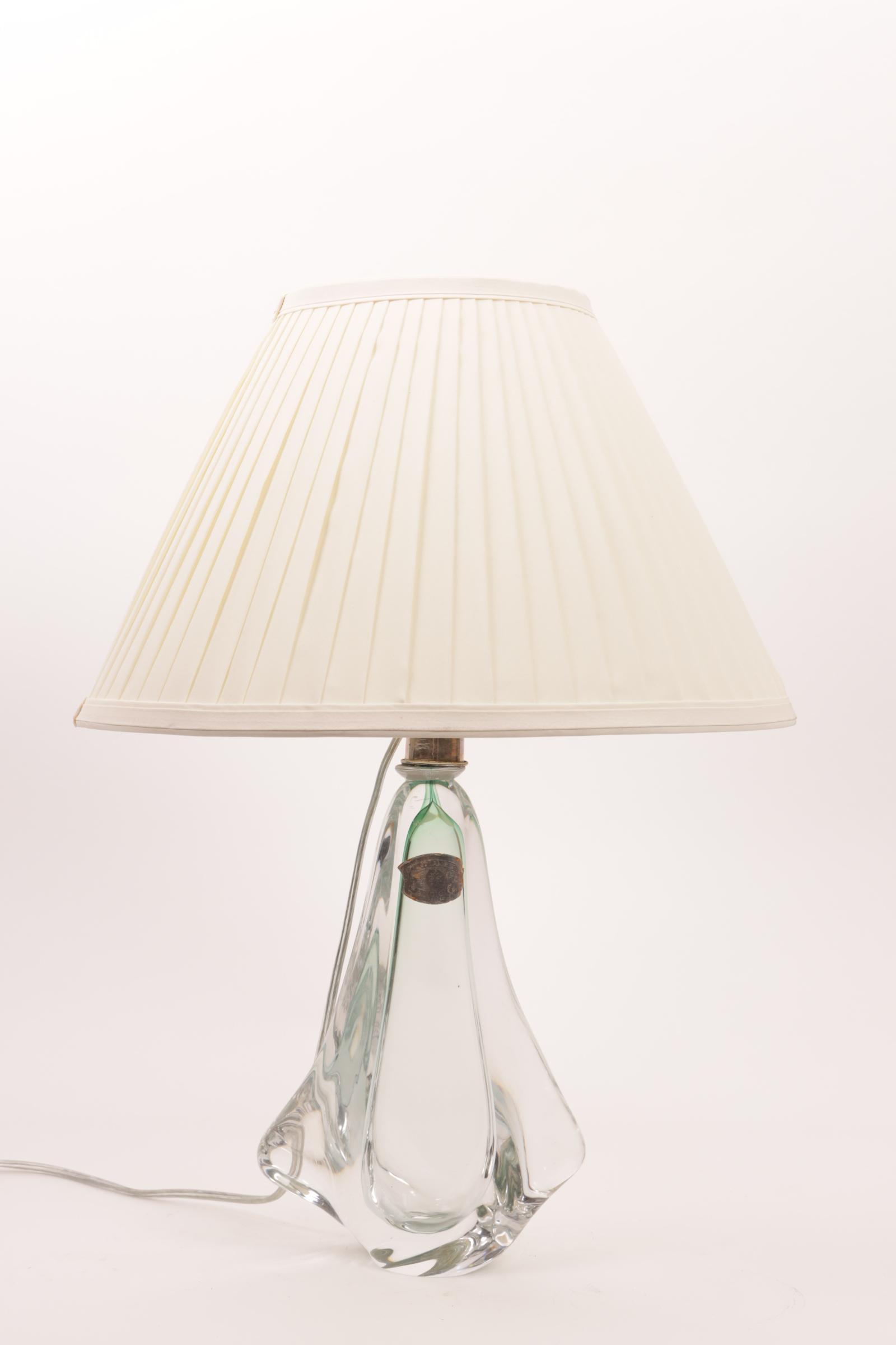 Val St. Lambert, schemerlamp met kristallen voet met gevoerde stoffen plissé kap, h.48 cm.