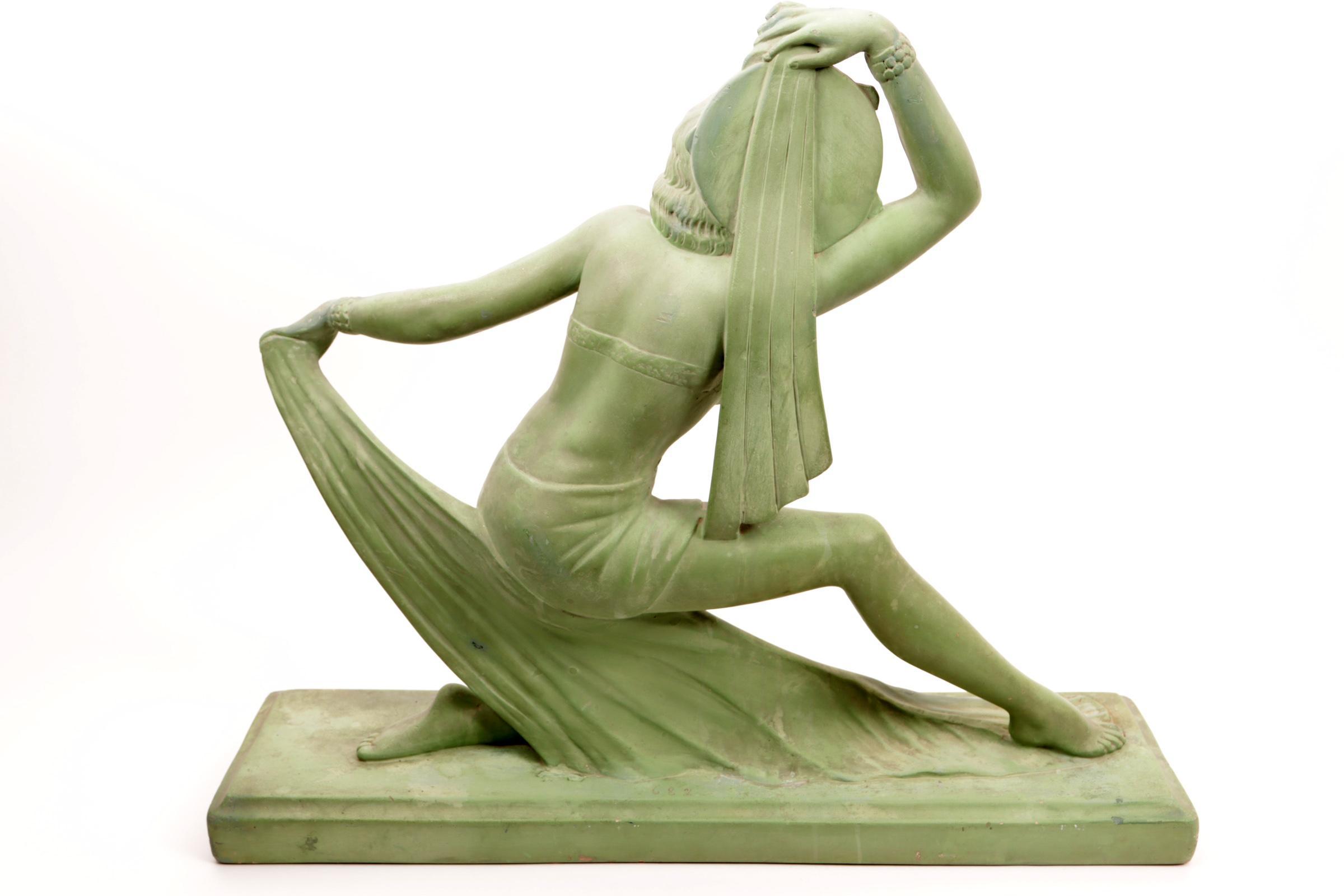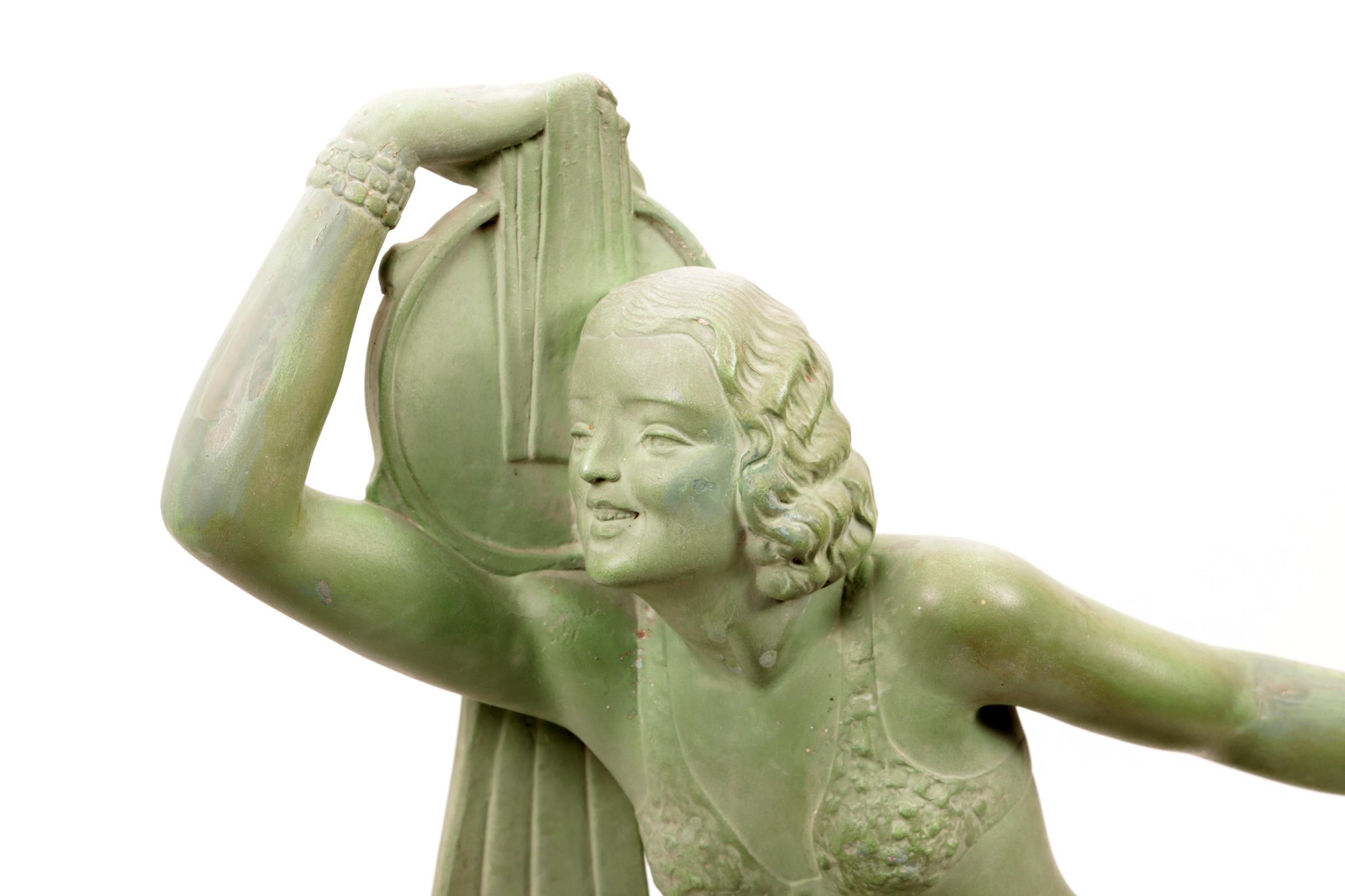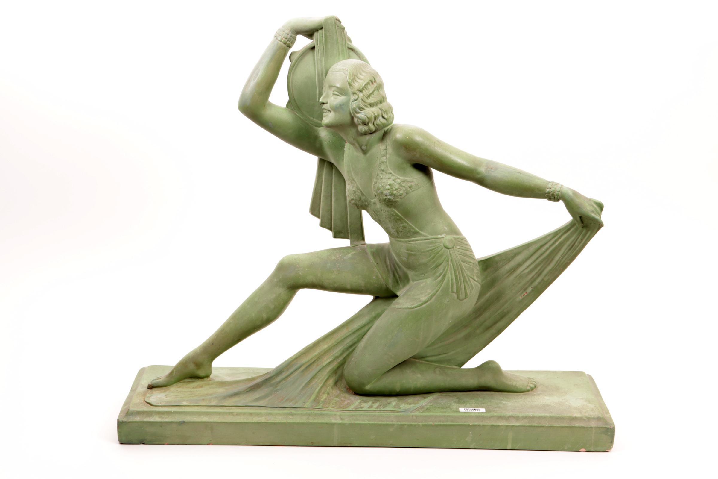 Art Deco beeld van dame met tamboerijn, h.53 cm.