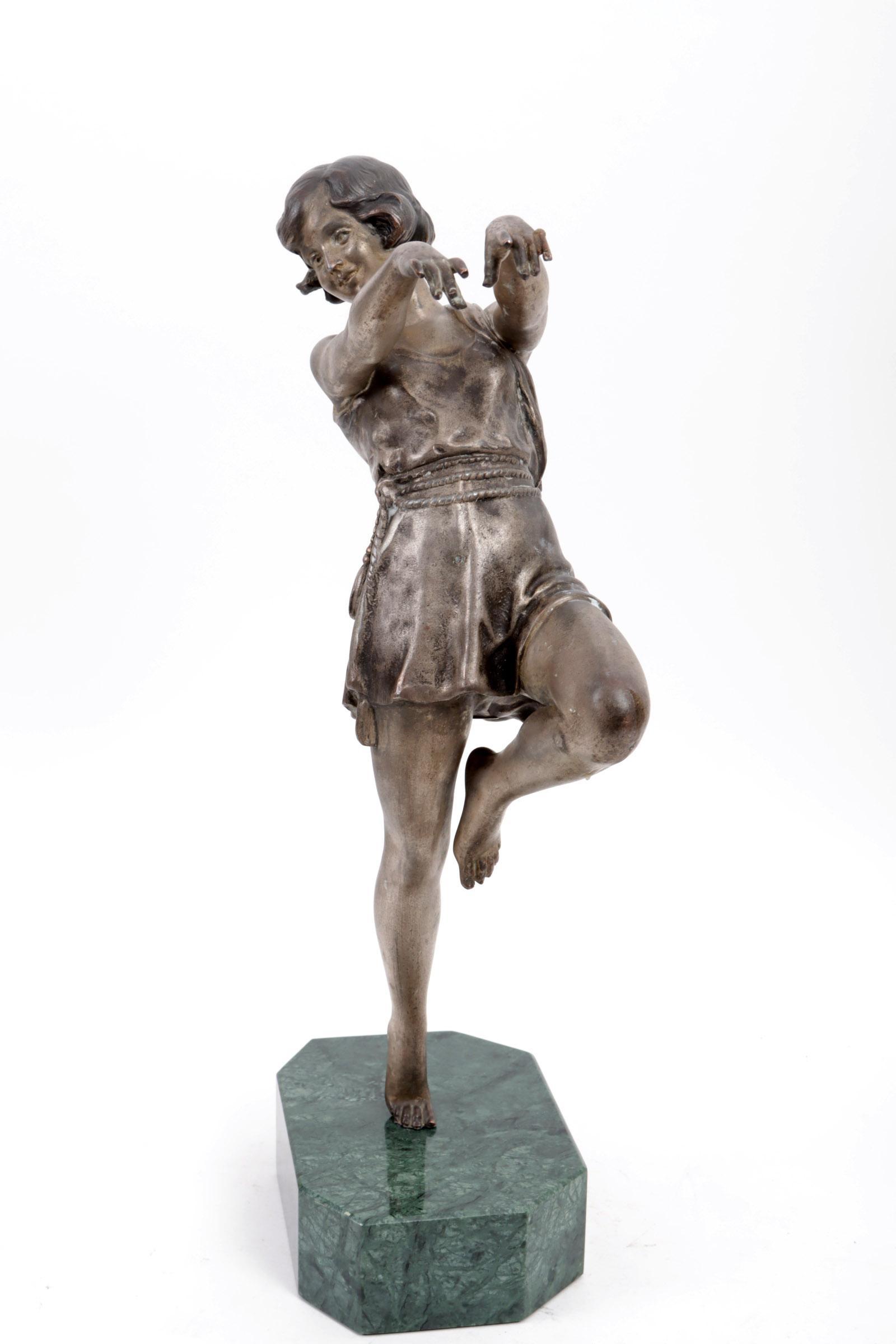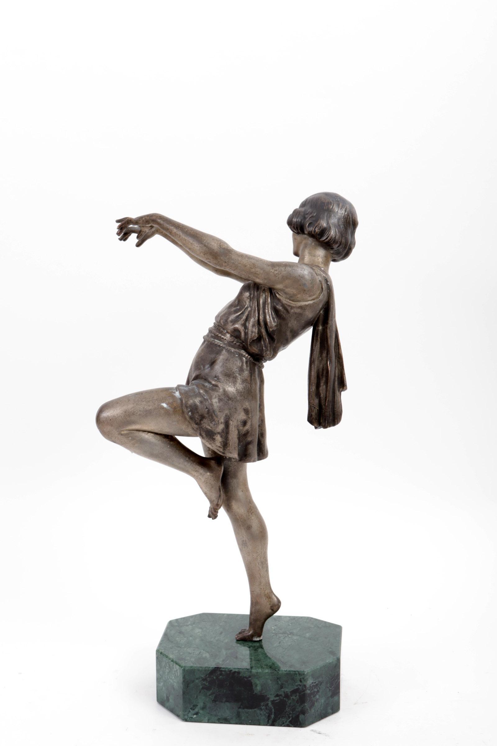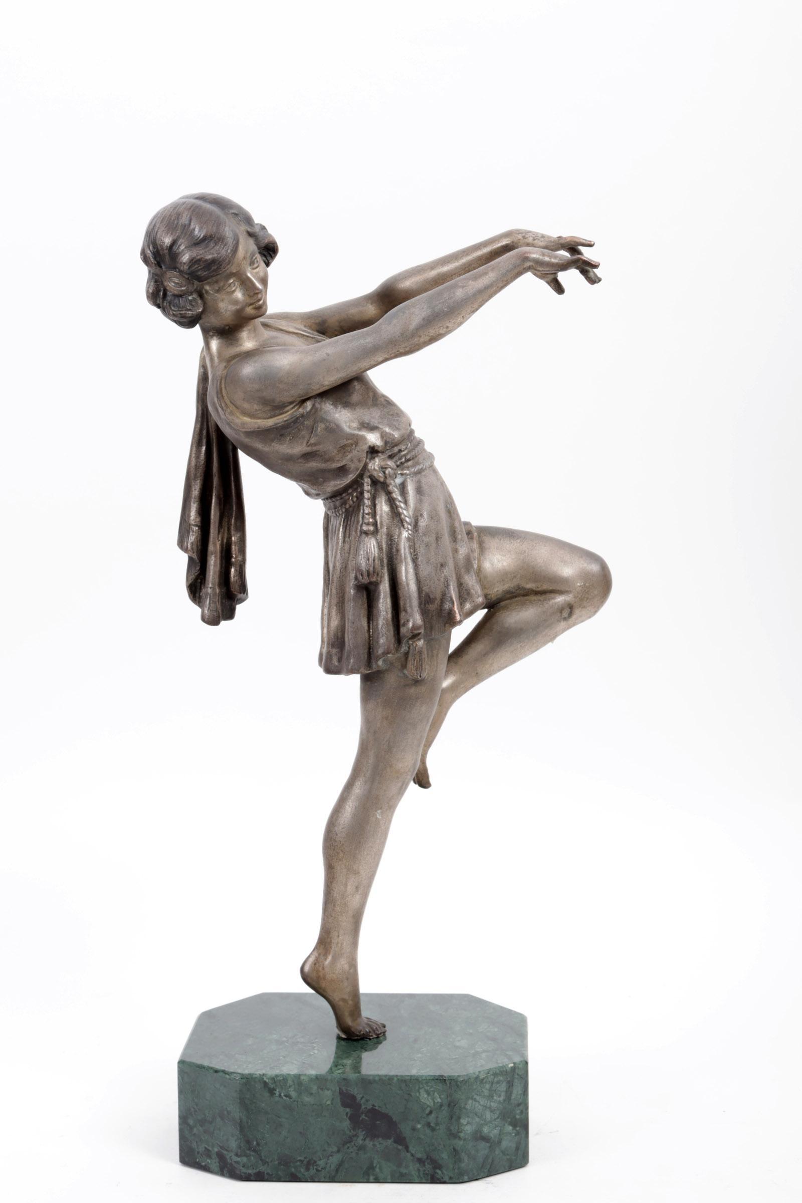 Art Deco beeld van dame rustend op marmeren voetstuk, h.45 cm.